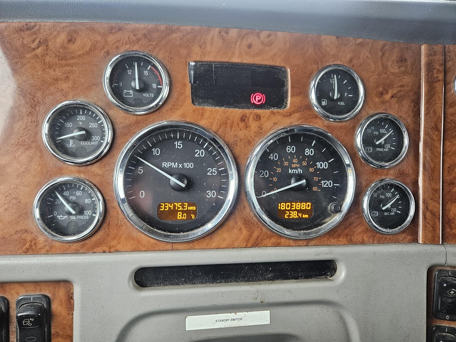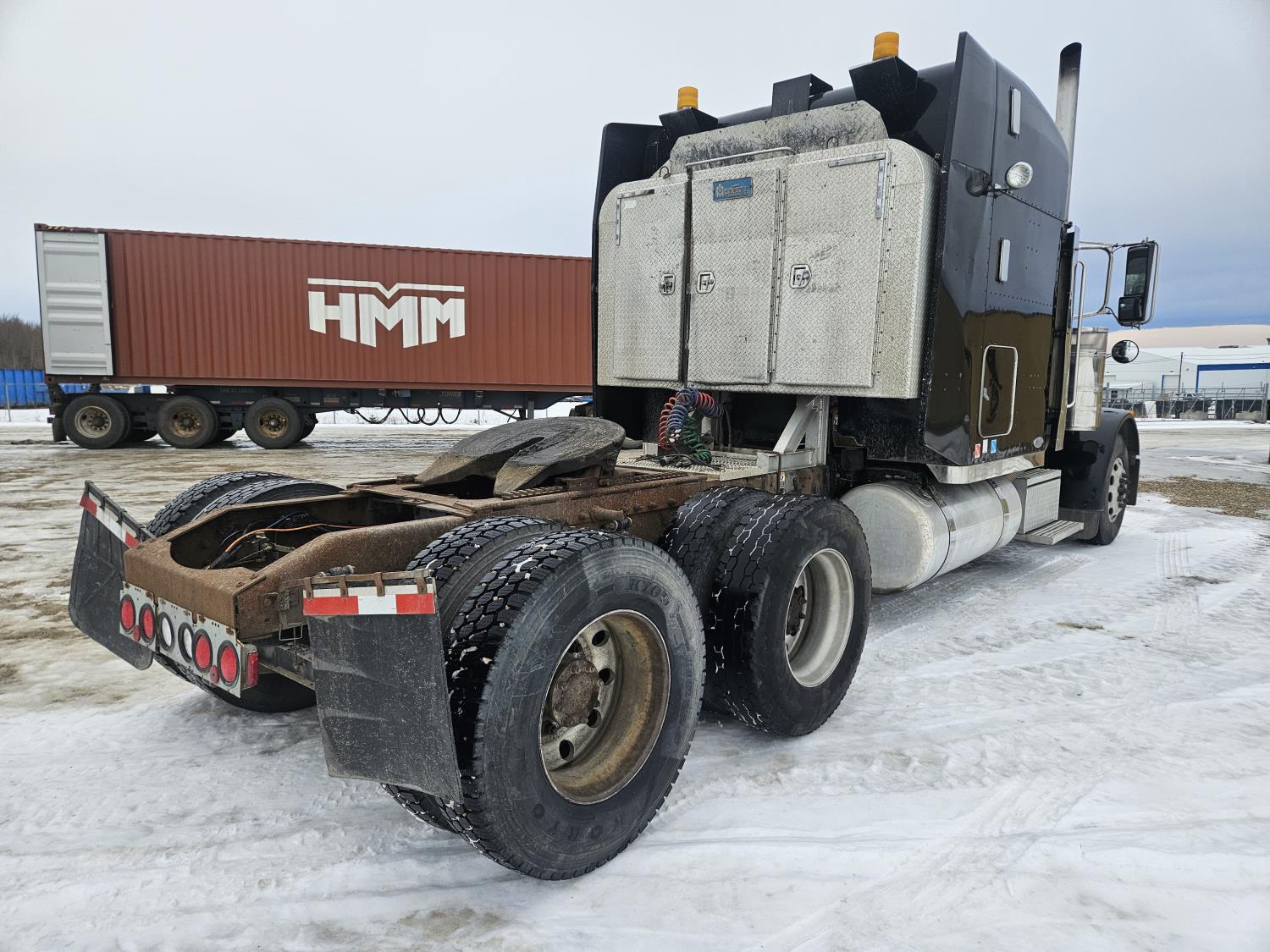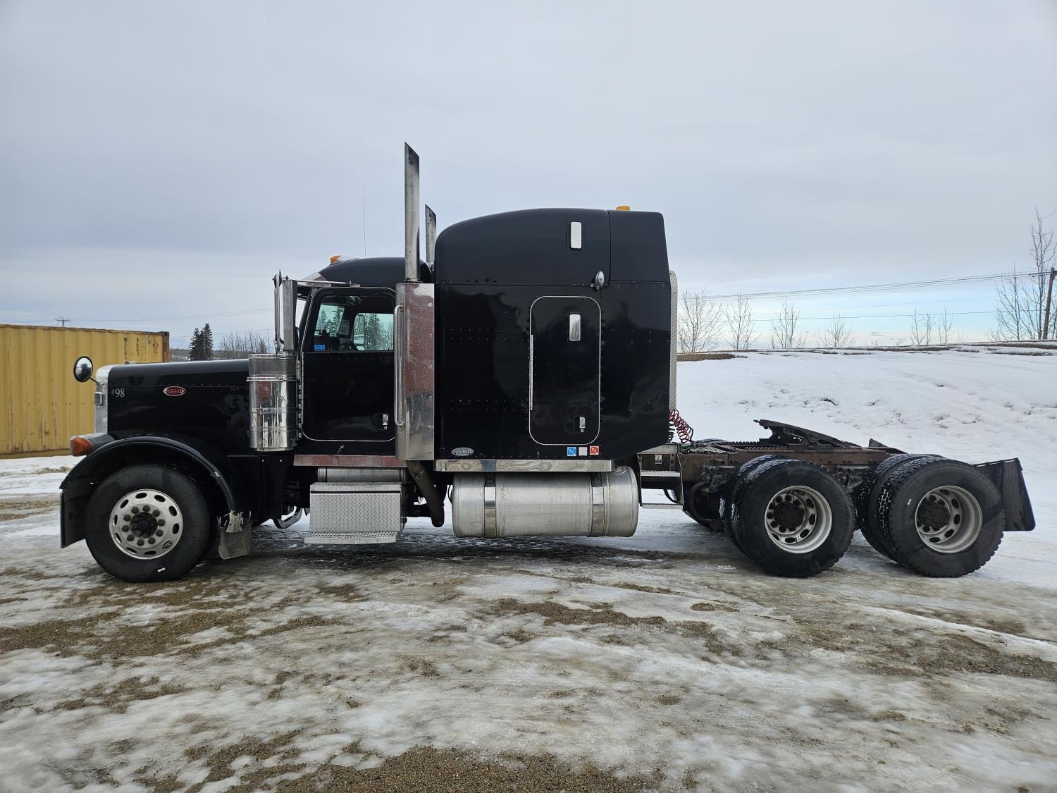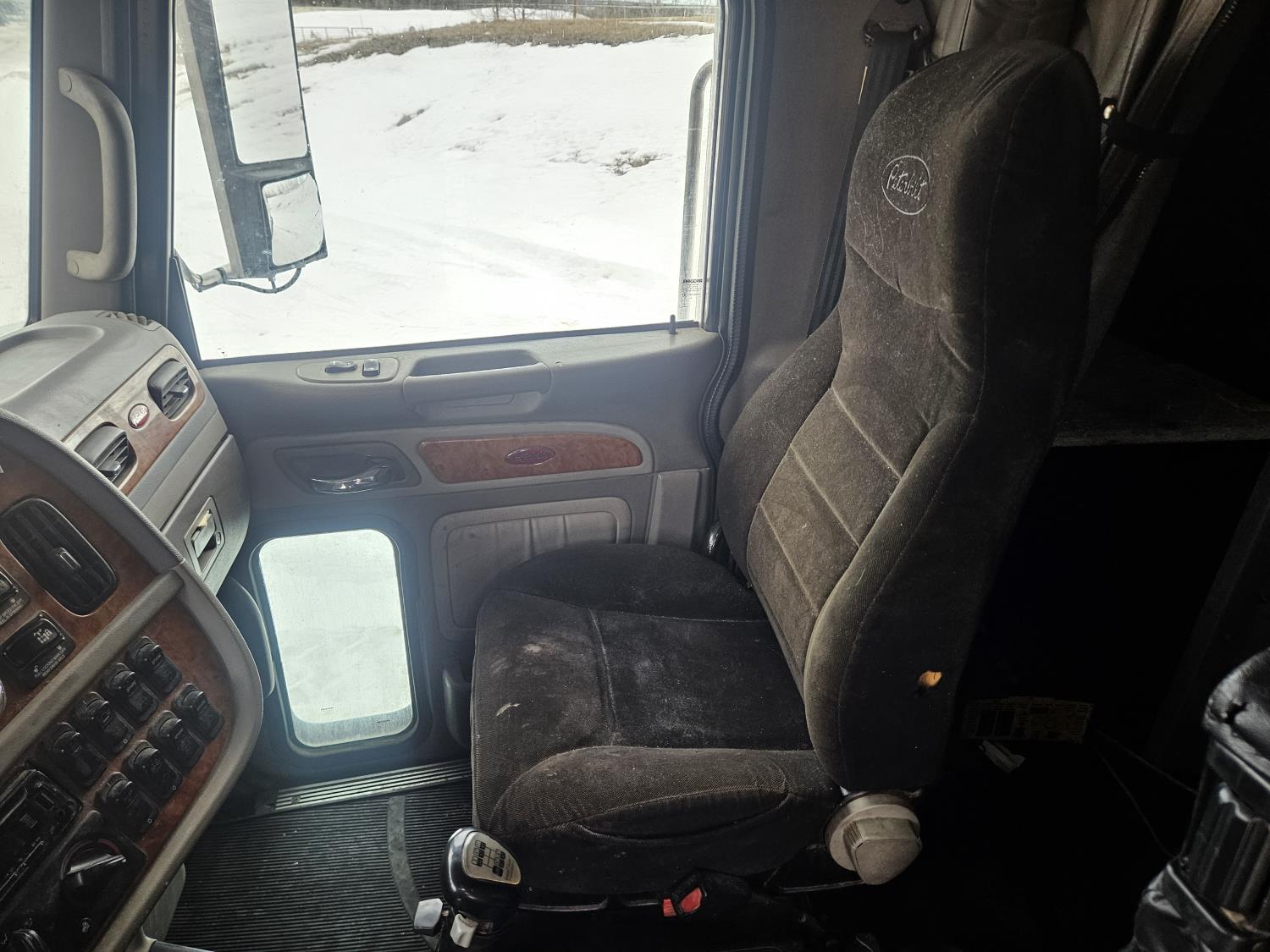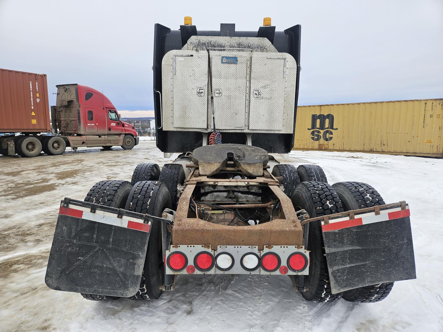 Caterpillar C-13 12.0 L 6 cylinder diesel engine, engine brake, engine block heater, Eaton Fuller 18 speed manual transmission, A/C, cruise control, leather interior, air ride seats, radio, aluminum headache rack, air ride suspension, 12,000 lb front axle, 38,000 lb rear axles, full lockers, 3.70 ratio, all aluminum wheels, 11R22.5 tires