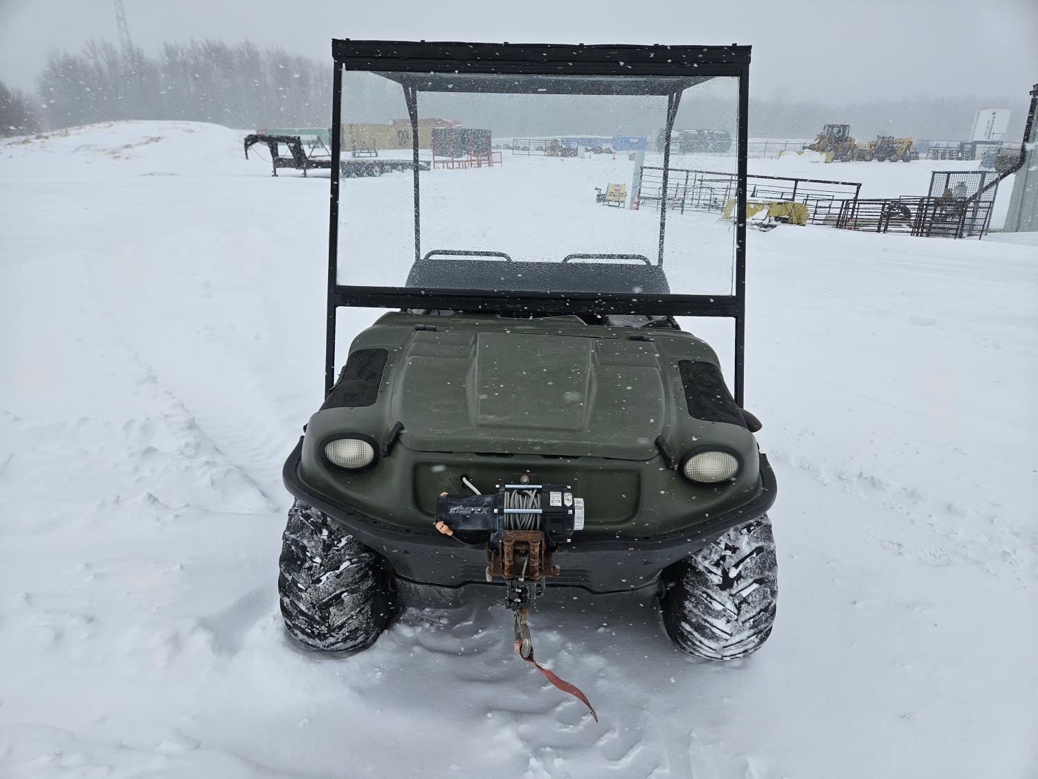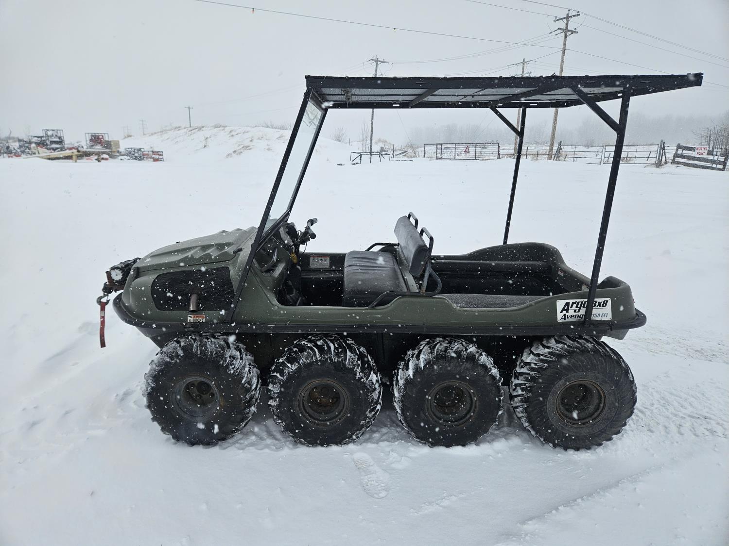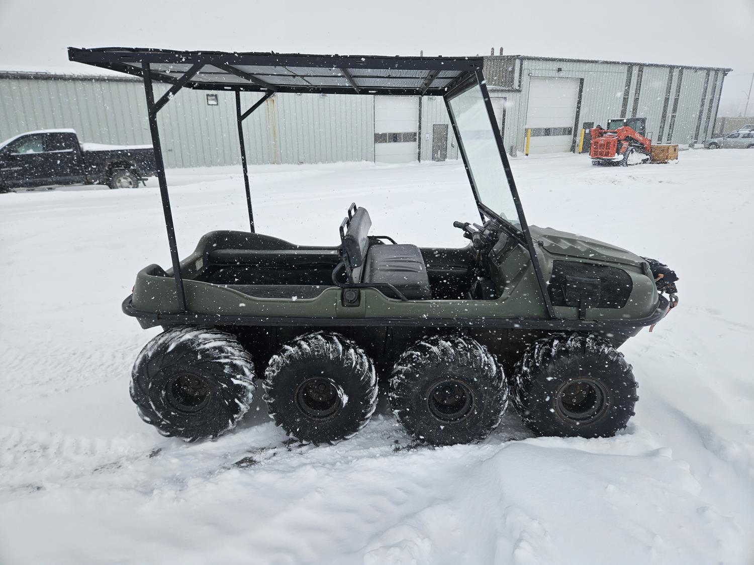 Kohler 750 cc EFI gas engine, Low/High reverse transmission, 3000 lb front mount winch, 2 inch receiver hitch, windshield, canopy, new Argo fuel pump, new steering master cylinder, 25x11.50-9 tires