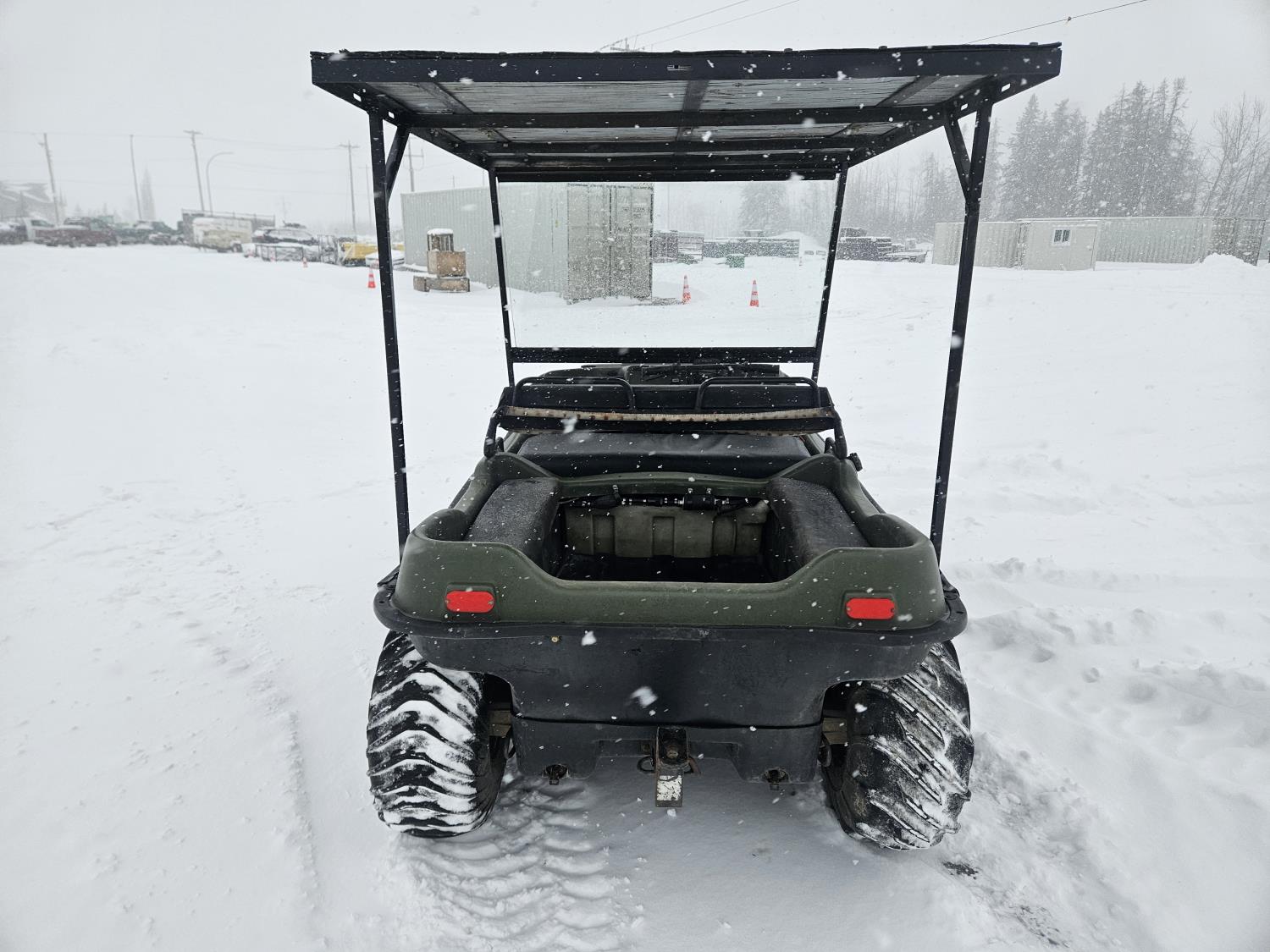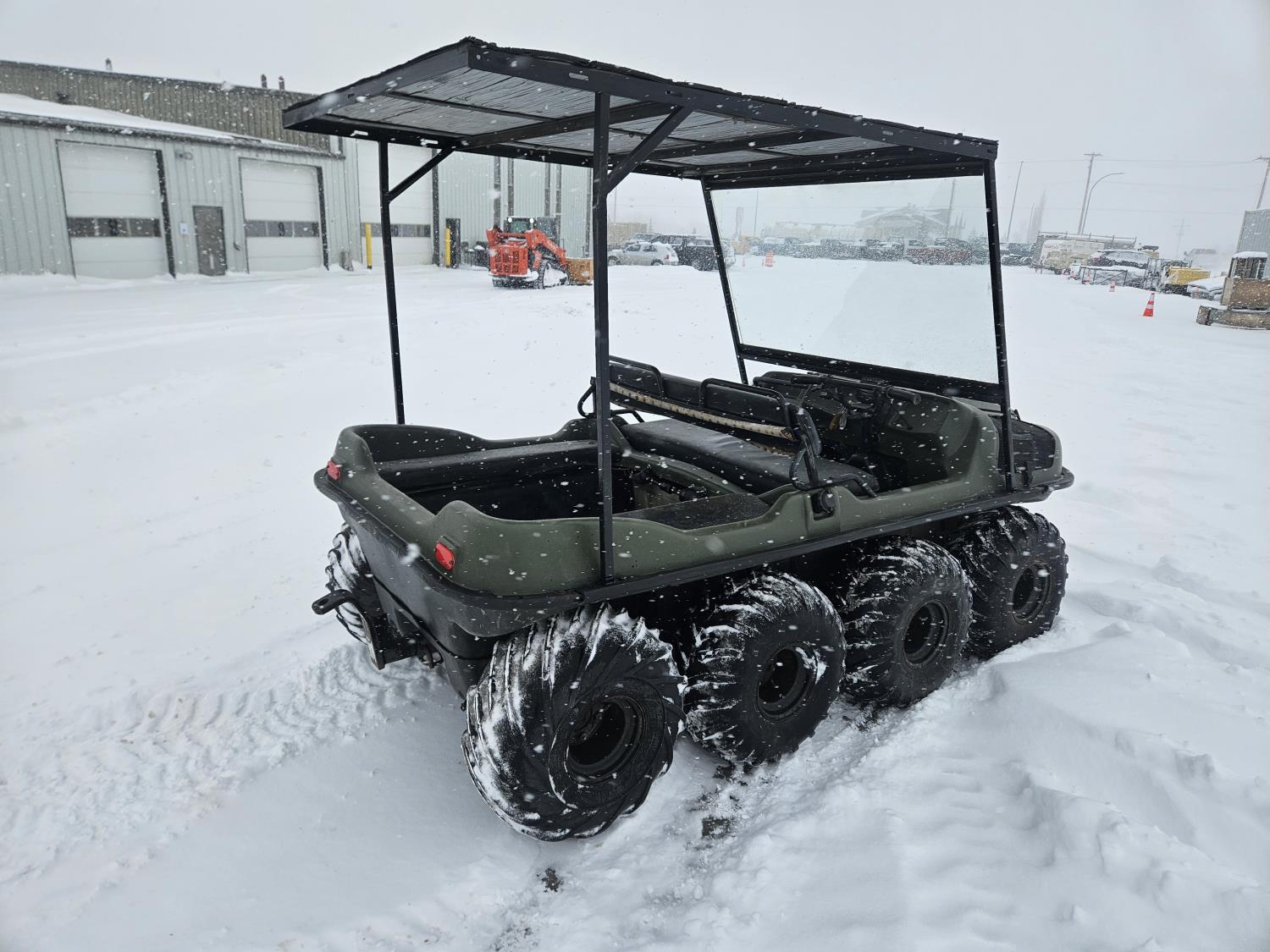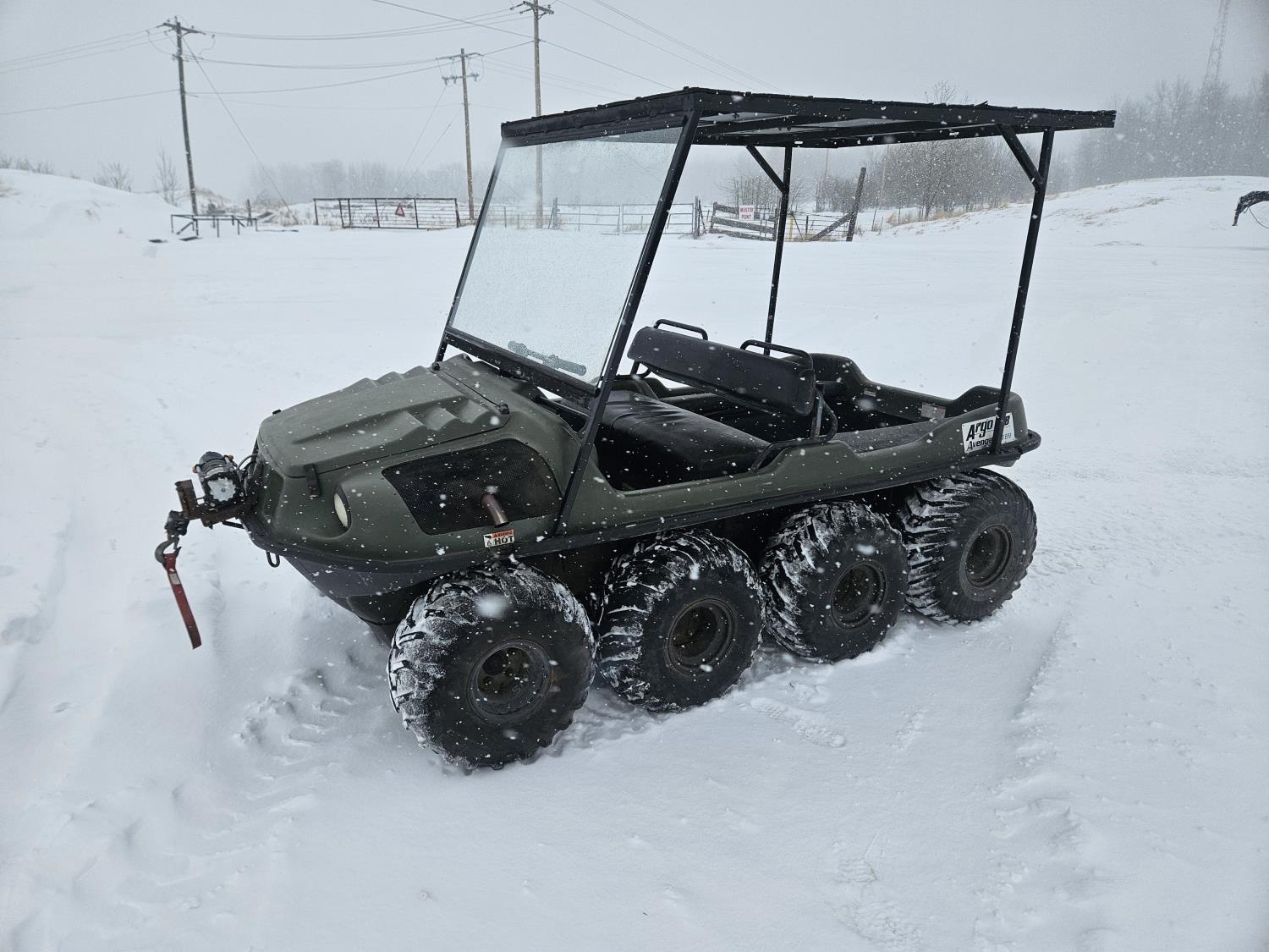Kohler 750 cc EFI gas engine, Low/High reverse transmission, 3000 lb front mount winch, 2 inch receiver hitch, windshield, canopy, new Argo fuel pump, new steering master cylinder, 25x11.50-9 tires