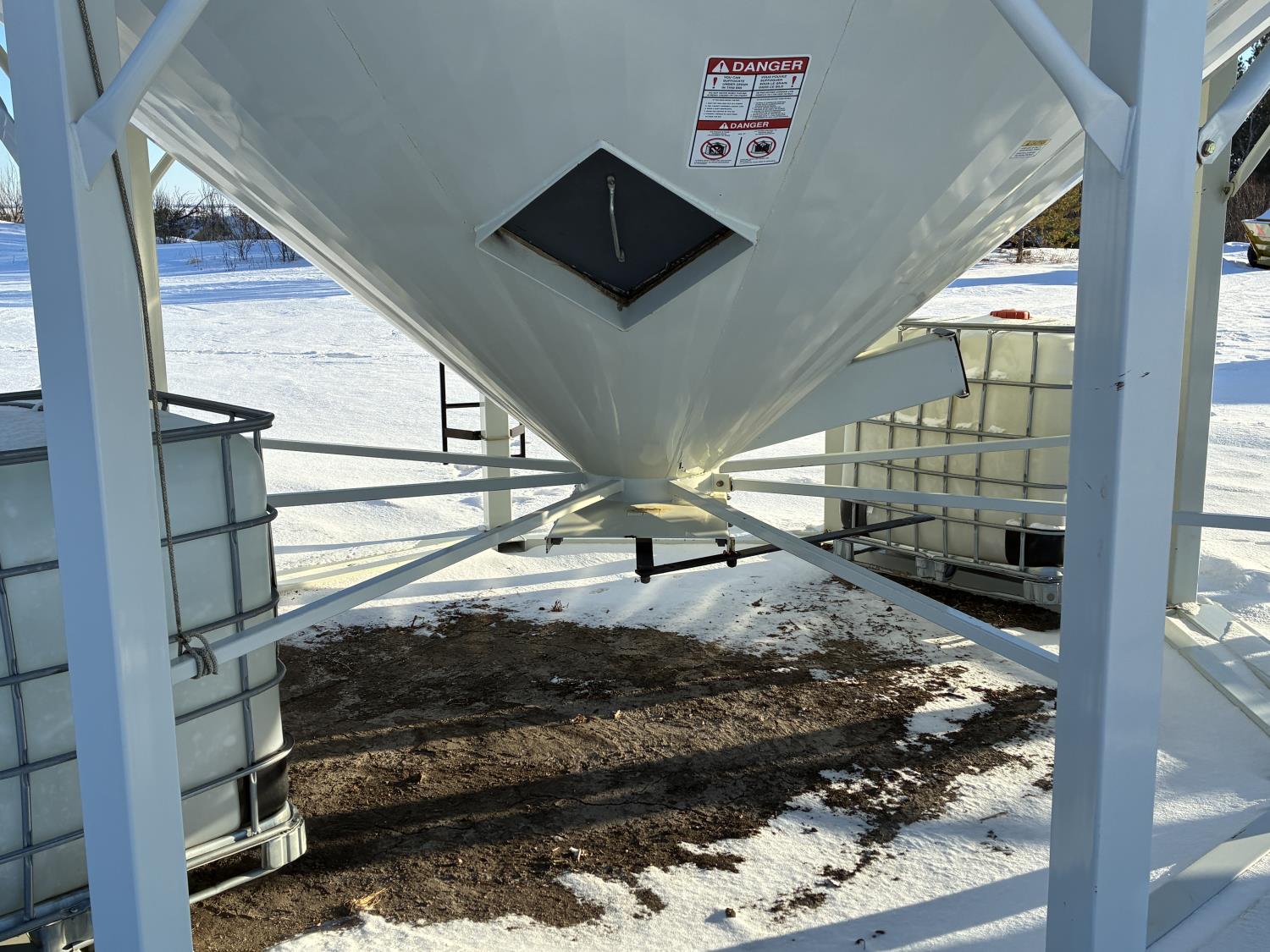 2,900± bu capacity, ladder, lid opener, unload chute, full indicator, site glasses, ***damage from fertilizer hang up*** but still a very functional bin.