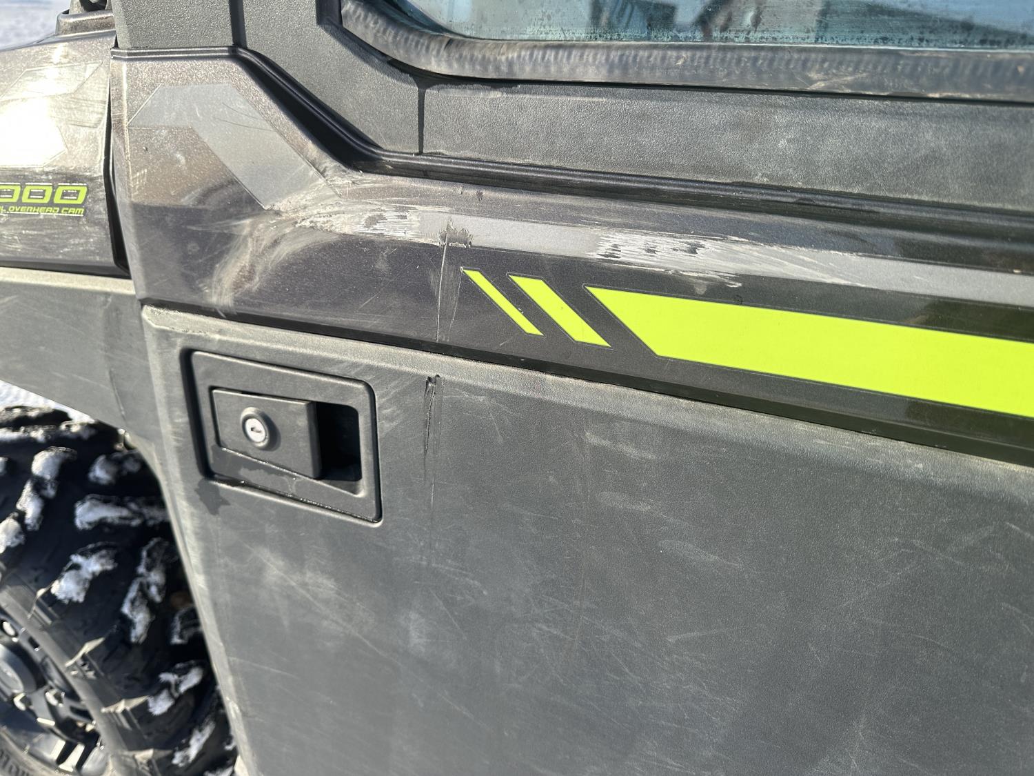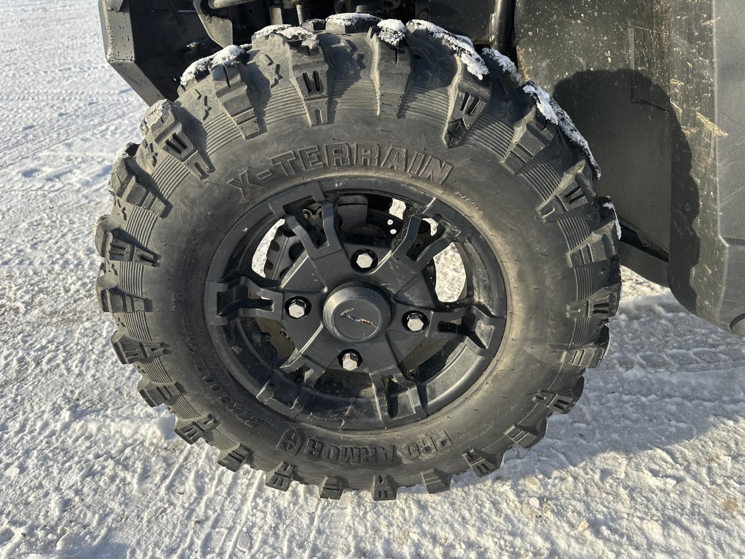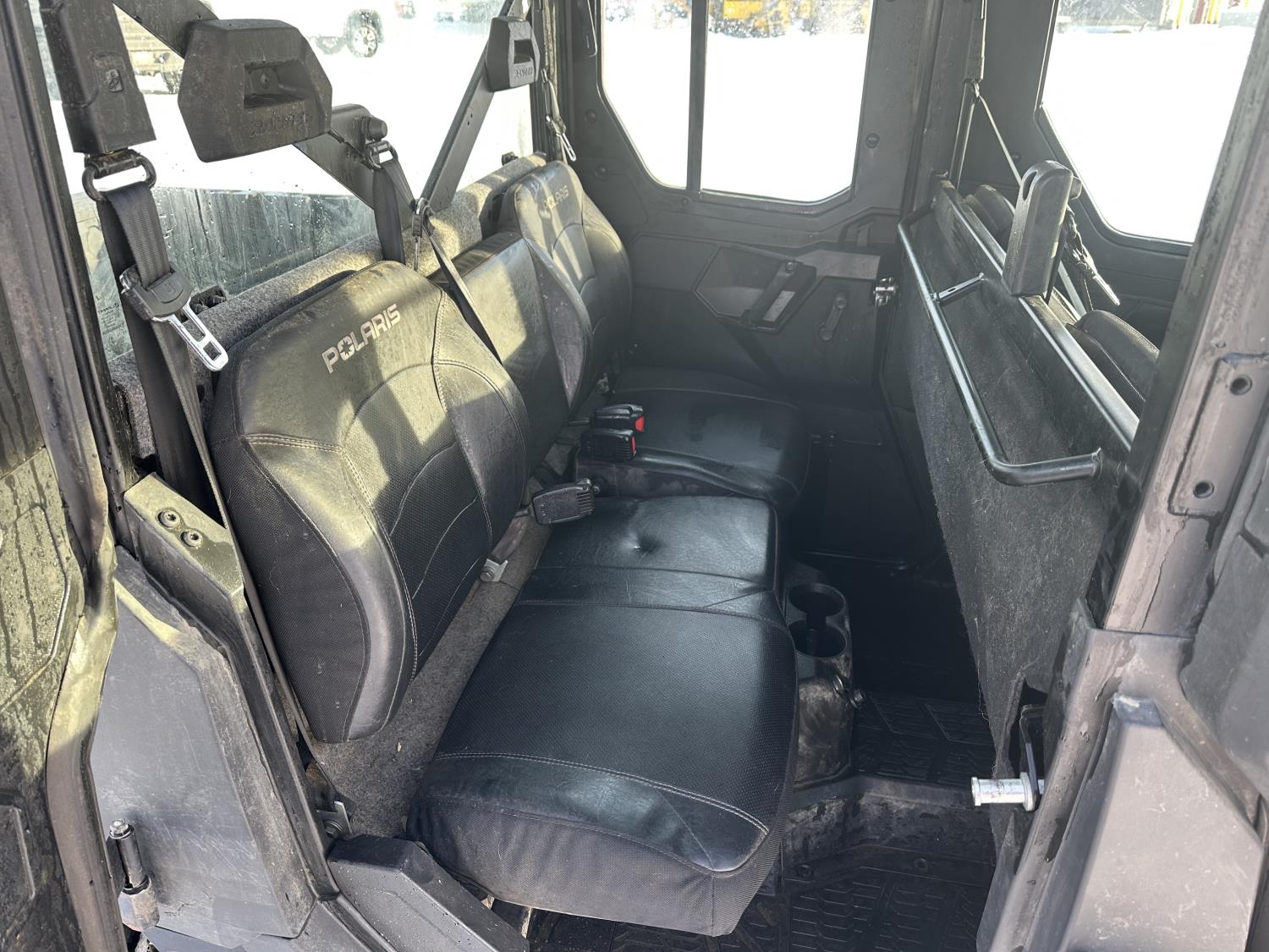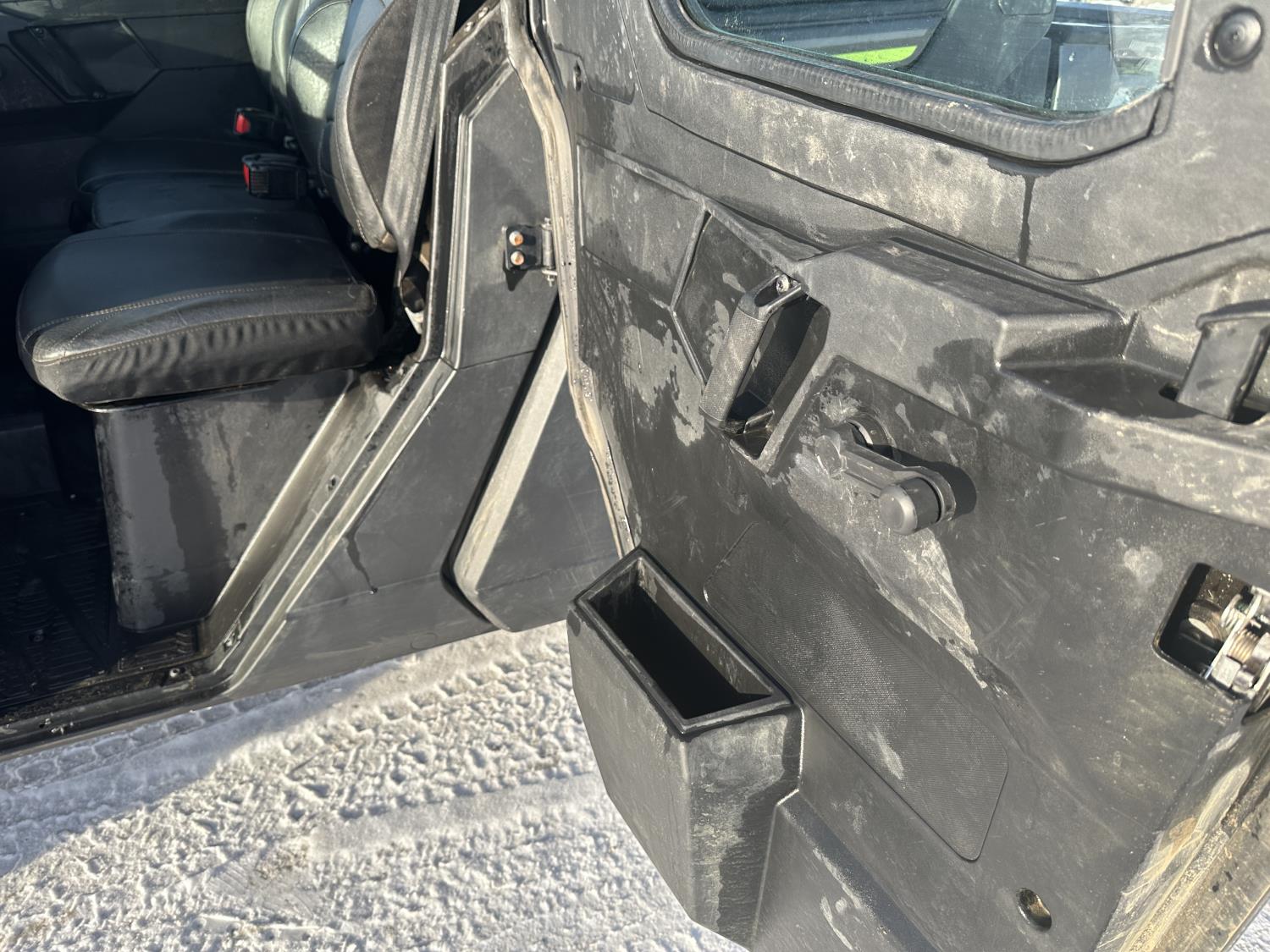1000 cc engine, automatic transmission, Hi/Lo range, reverse, 4 door enclosed cab, 5 passengers, A/C, heater, windshield, power steering, front winch, front brush guard, manual dump box, receiver hitch, Personal inspection is recommended before purchasing, 27X9.00R14 front tires, 27X11.00R14 rear tires