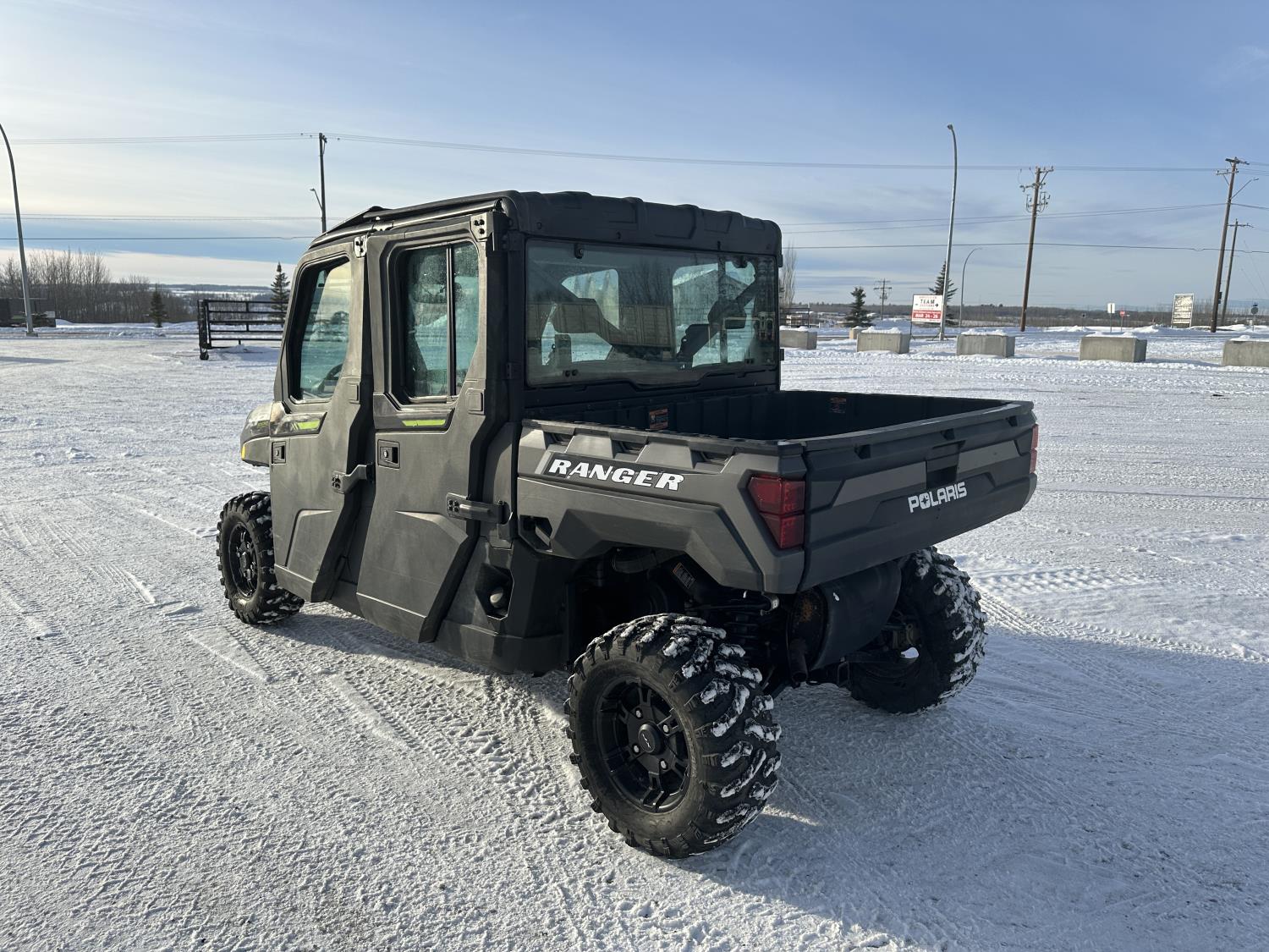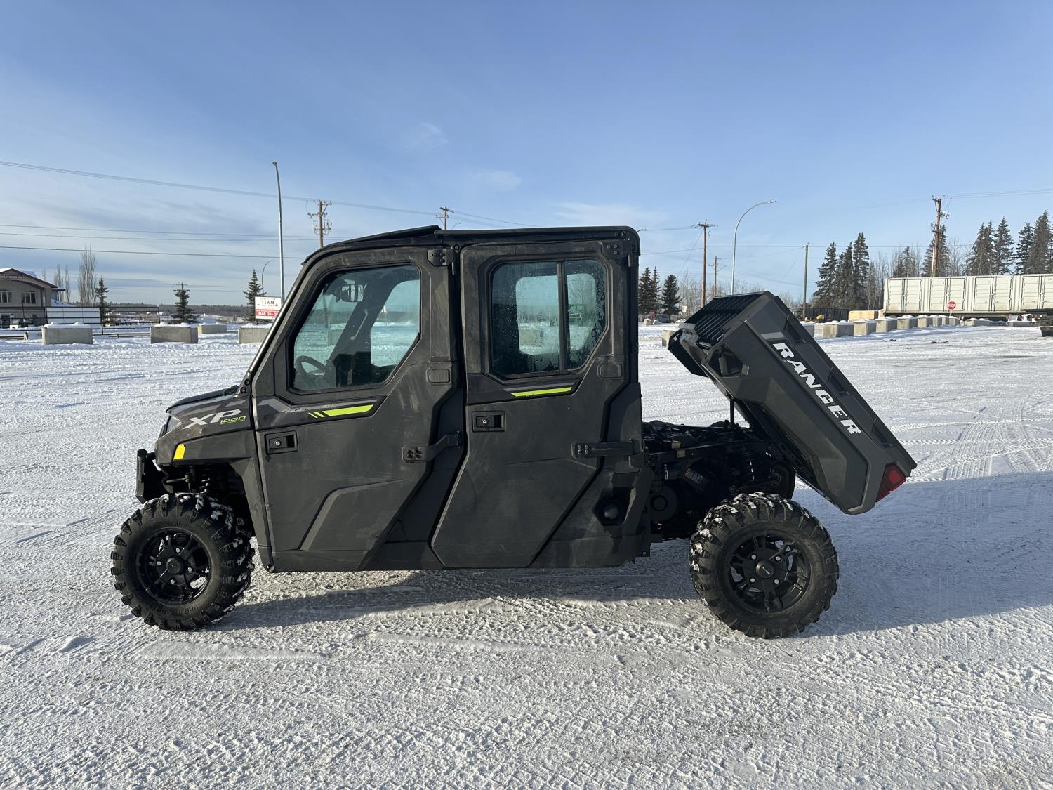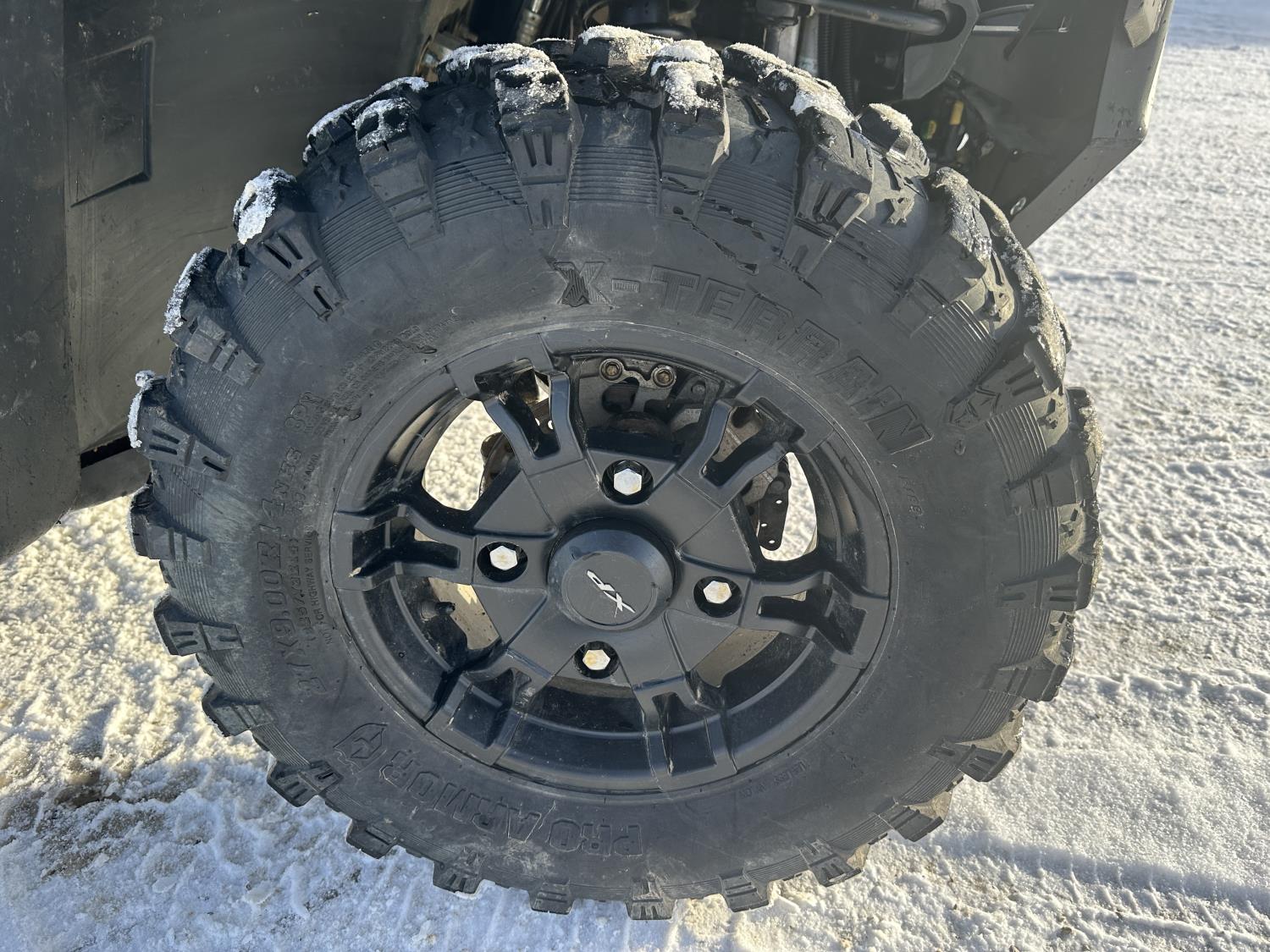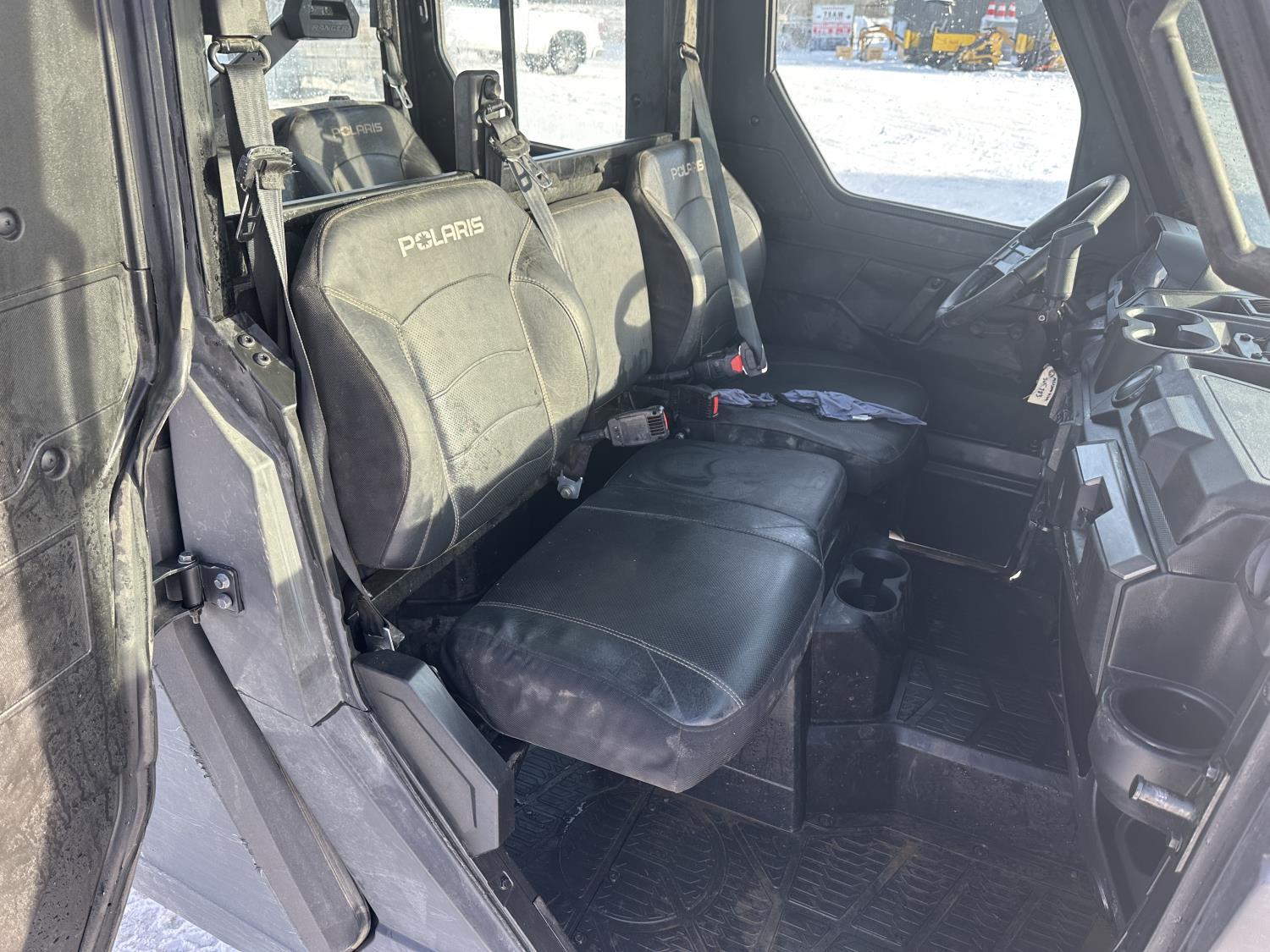 1000 cc engine, automatic transmission, Hi/Lo range, reverse, 4 door enclosed cab, 5 passengers, A/C, heater, windshield, power steering, front winch, front brush guard, manual dump box, receiver hitch, Personal inspection is recommended before purchasing, 27X9.00R14 front tires, 27X11.00R14 rear tires