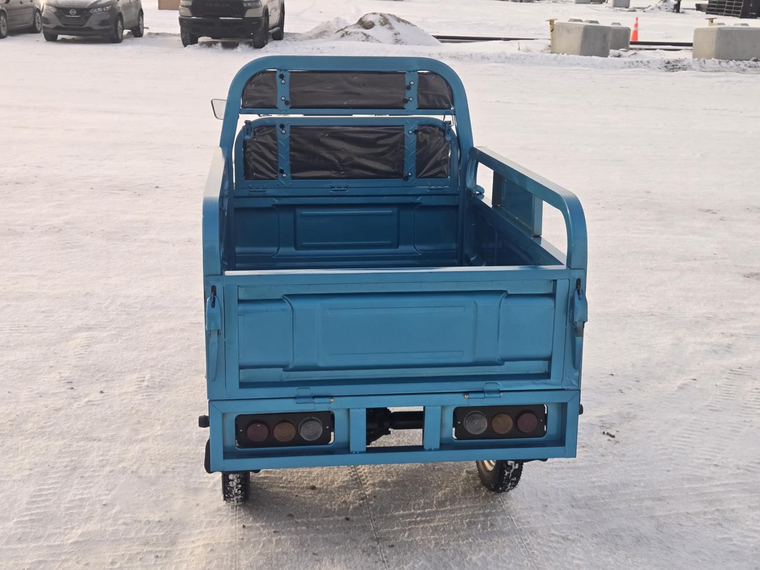 Motor Power: 800W; Battery: 60V20A large-capacity battery; Controls: Three-speed adjustable system; Display: LCD digital instrument panel; Lighting: LED headlights; Suspension: hydraulic front fork; Features: luxury double seat, cargo compartment, water cup holder; Vehicle Size: 2700 × 970 × 1325 mm; tailgate and sides drop down; brake lights, turn signals, horn, reverse. NEEDS ASSEMBLY