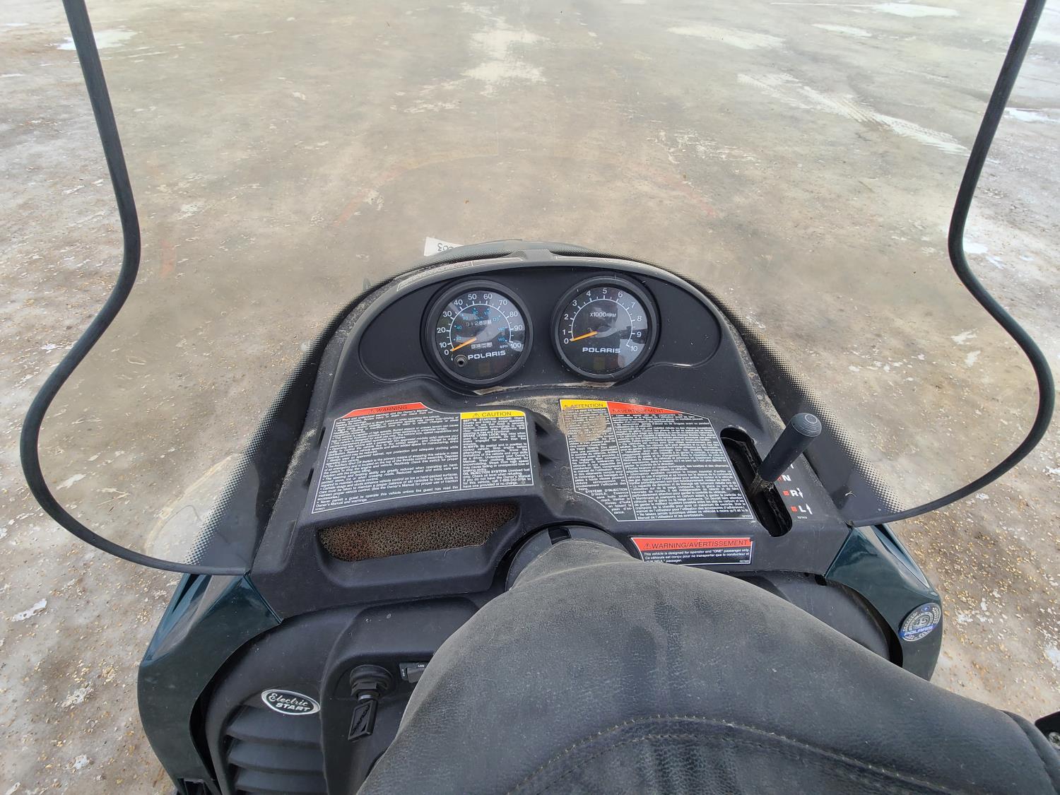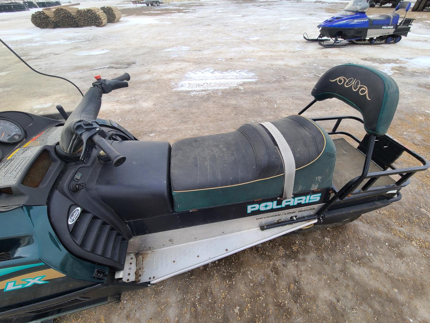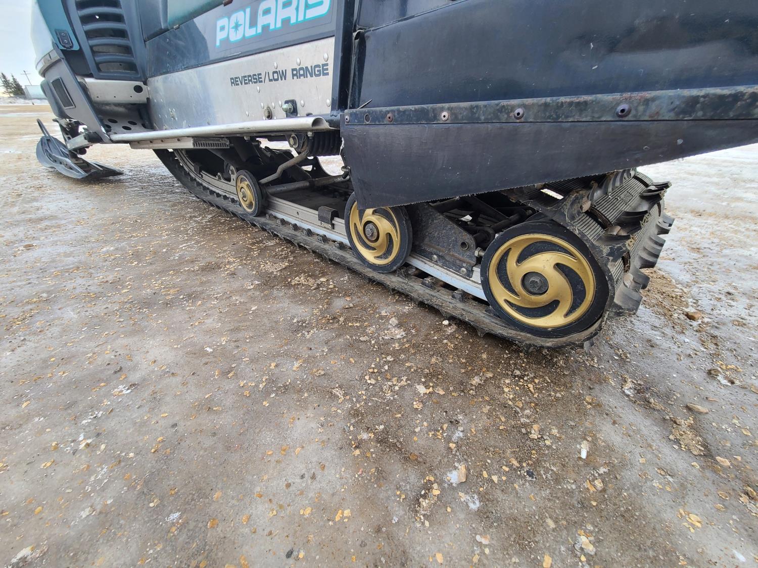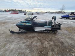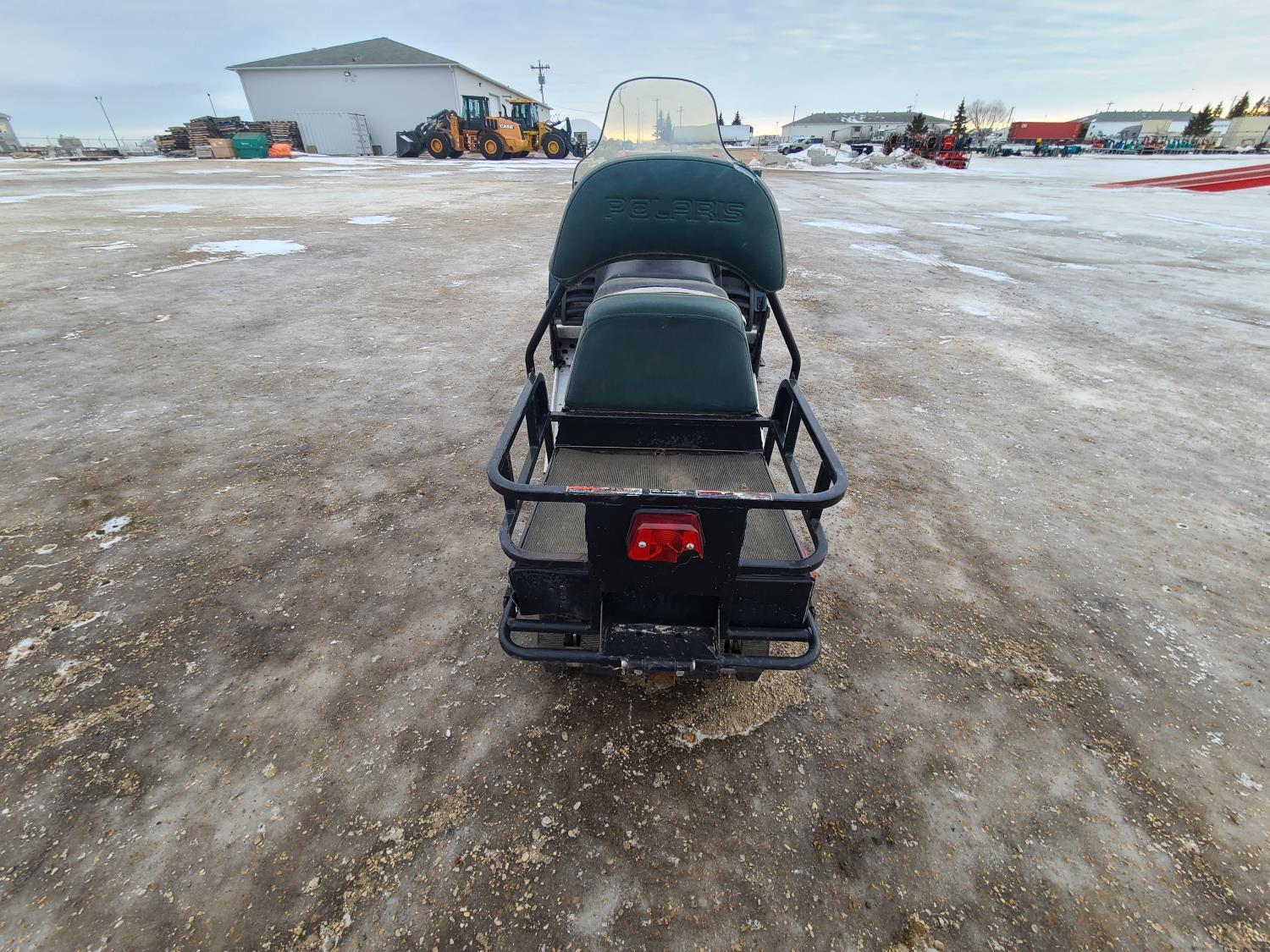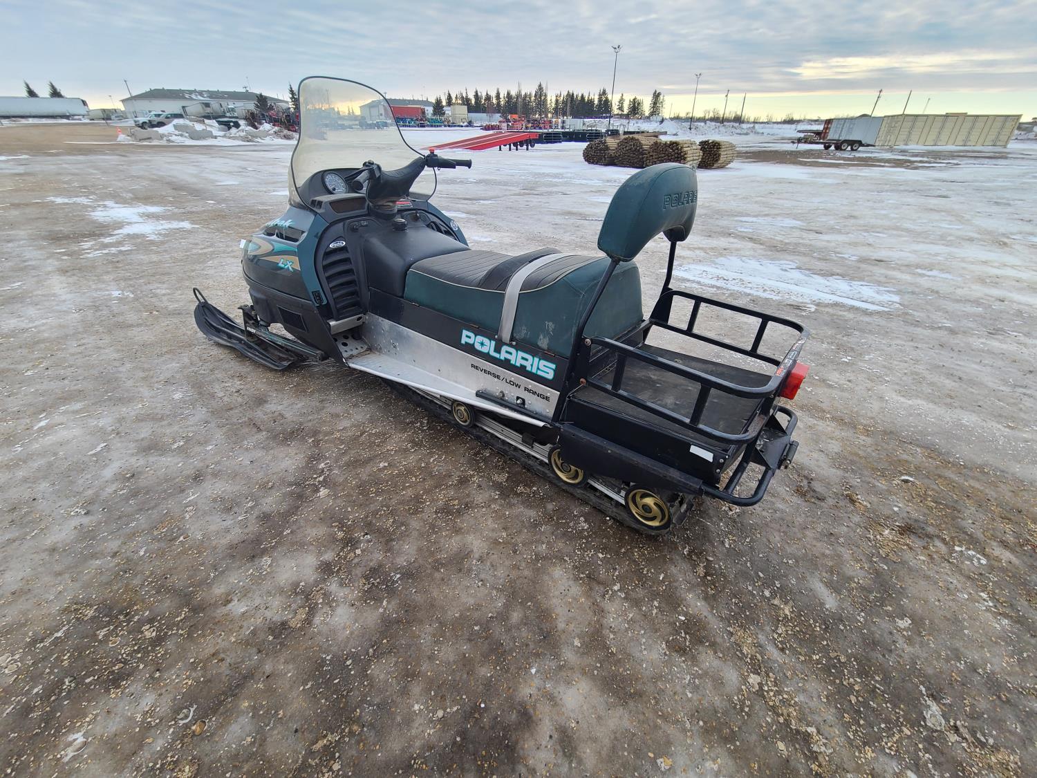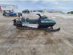 500 cc Polaris 2 cylinder 2 stroke engine, electric start, reverse, windshield, hand and thumb warmers, 2 up seat with backrest, 156 inch long track, 1 inch paddles