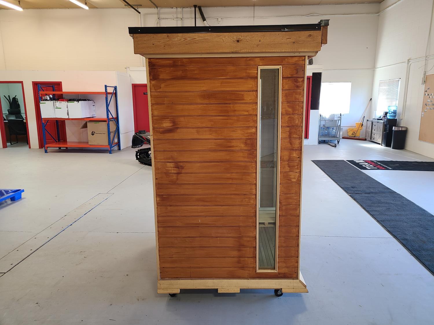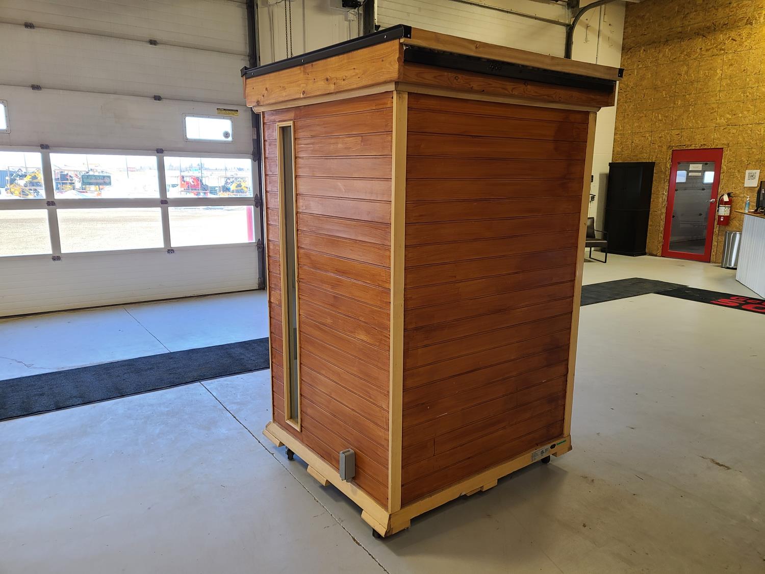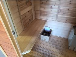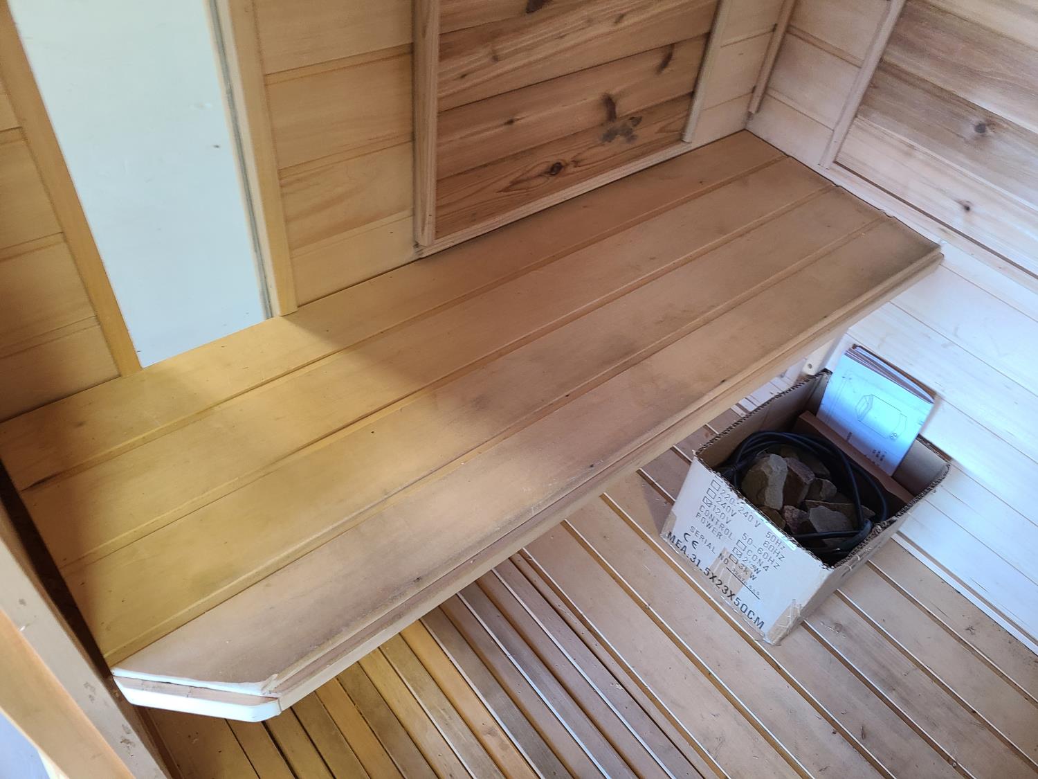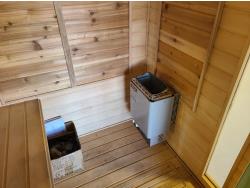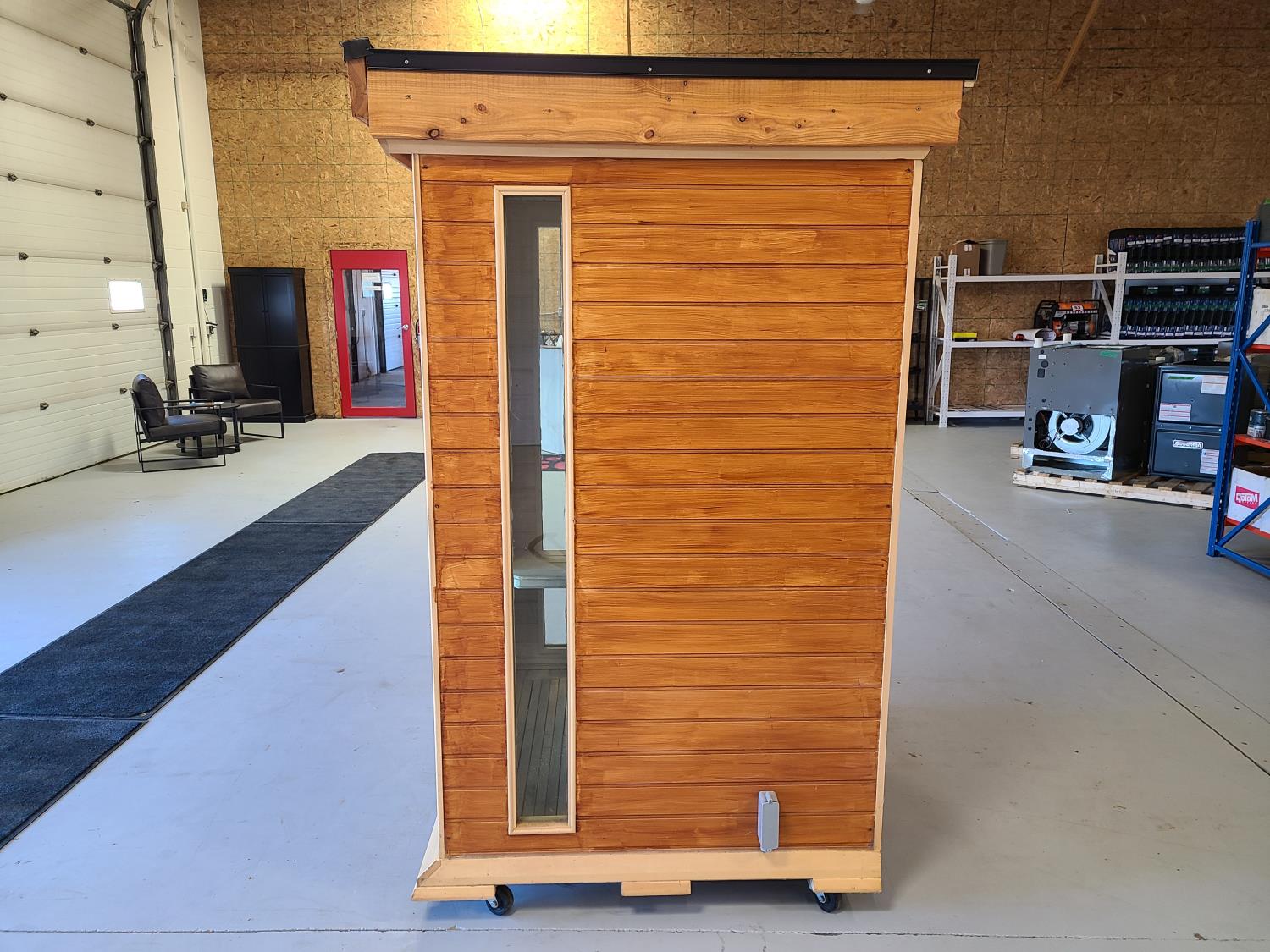 electric 2 kW heater, 10 v, 2 amp, sauna rocks, aspen/cedar interior, LED interior & exterior lights, full glass door, on castors for moving around on smooth floor, flat roof with seamless EPDM rubber, roof installed for outdoor use with rock ballast, larch/tamarack exterior trim