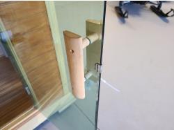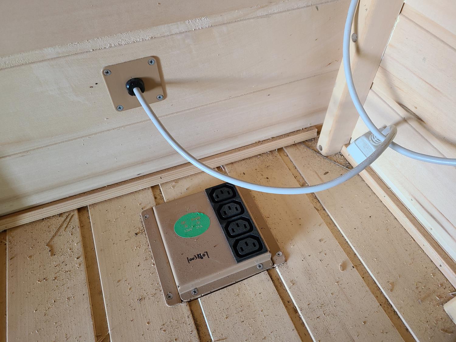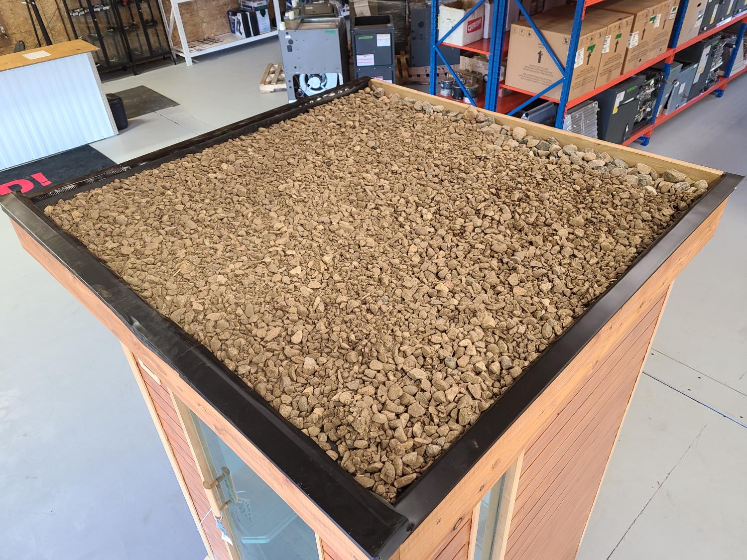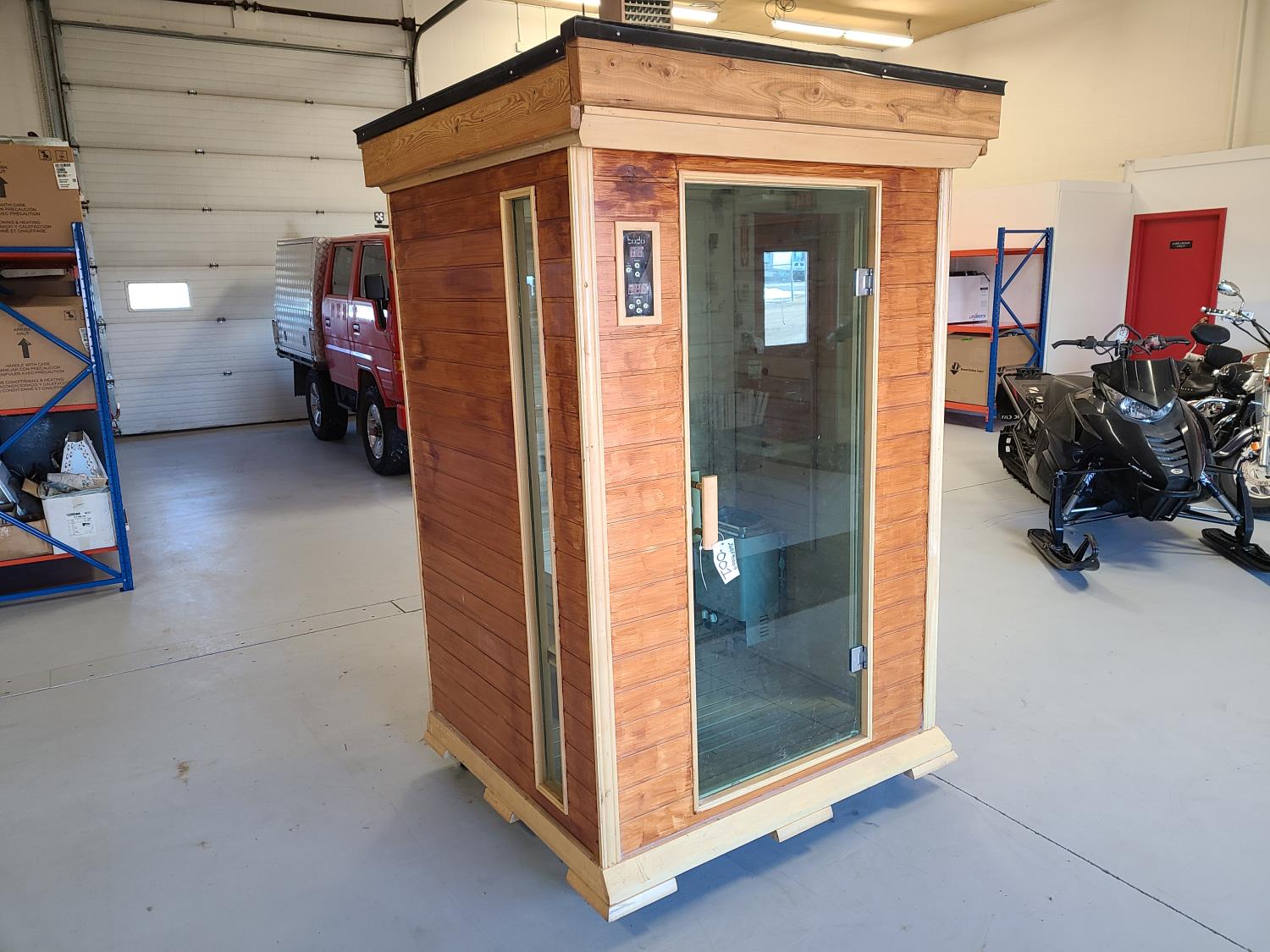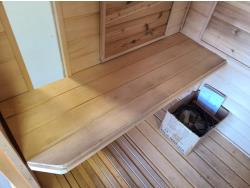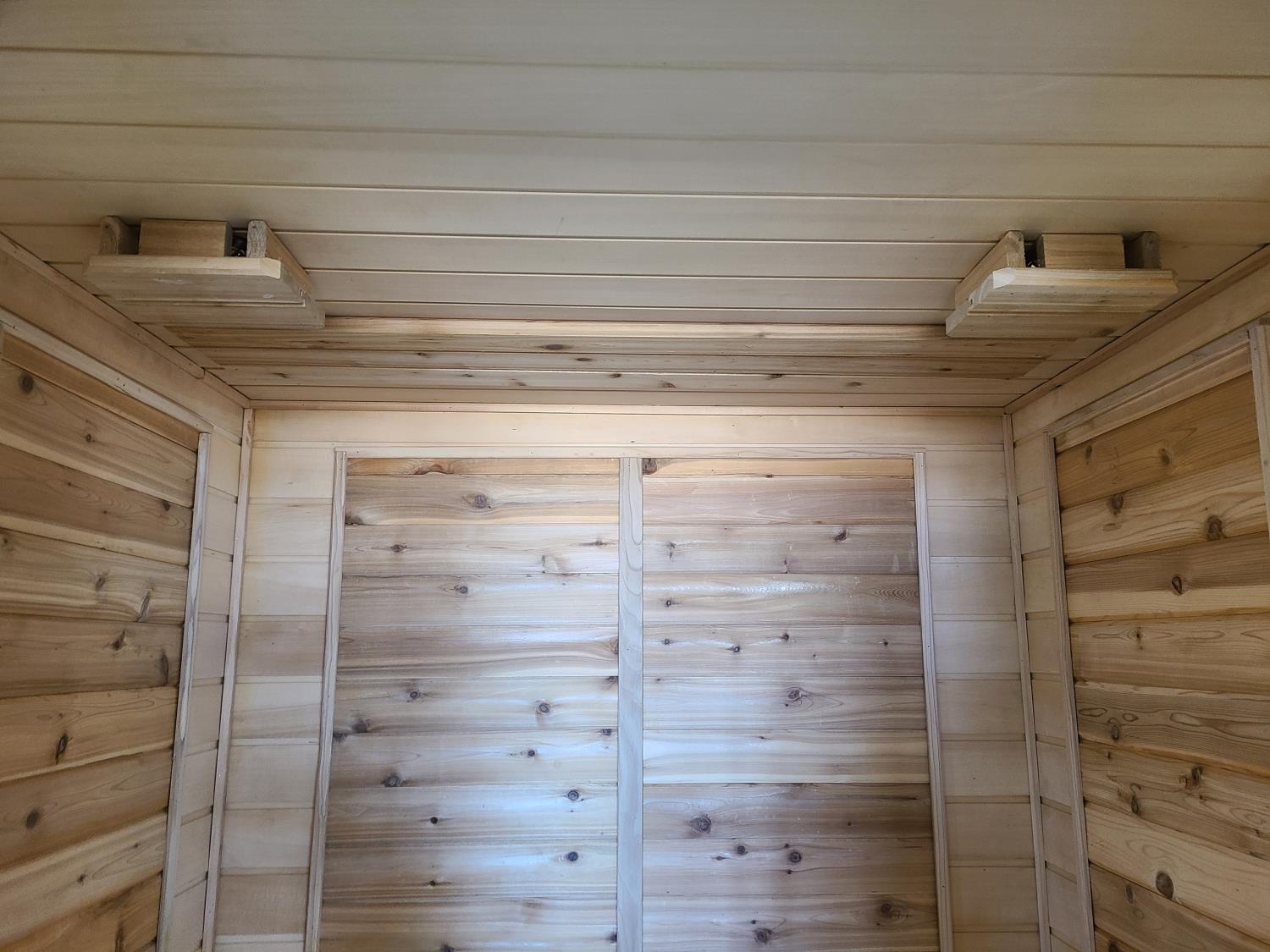 electric 2 kW heater, 10 v, 2 amp, sauna rocks, aspen/cedar interior, LED interior & exterior lights, full glass door, on castors for moving around on smooth floor, flat roof with seamless EPDM rubber, roof installed for outdoor use with rock ballast, larch/tamarack exterior trim