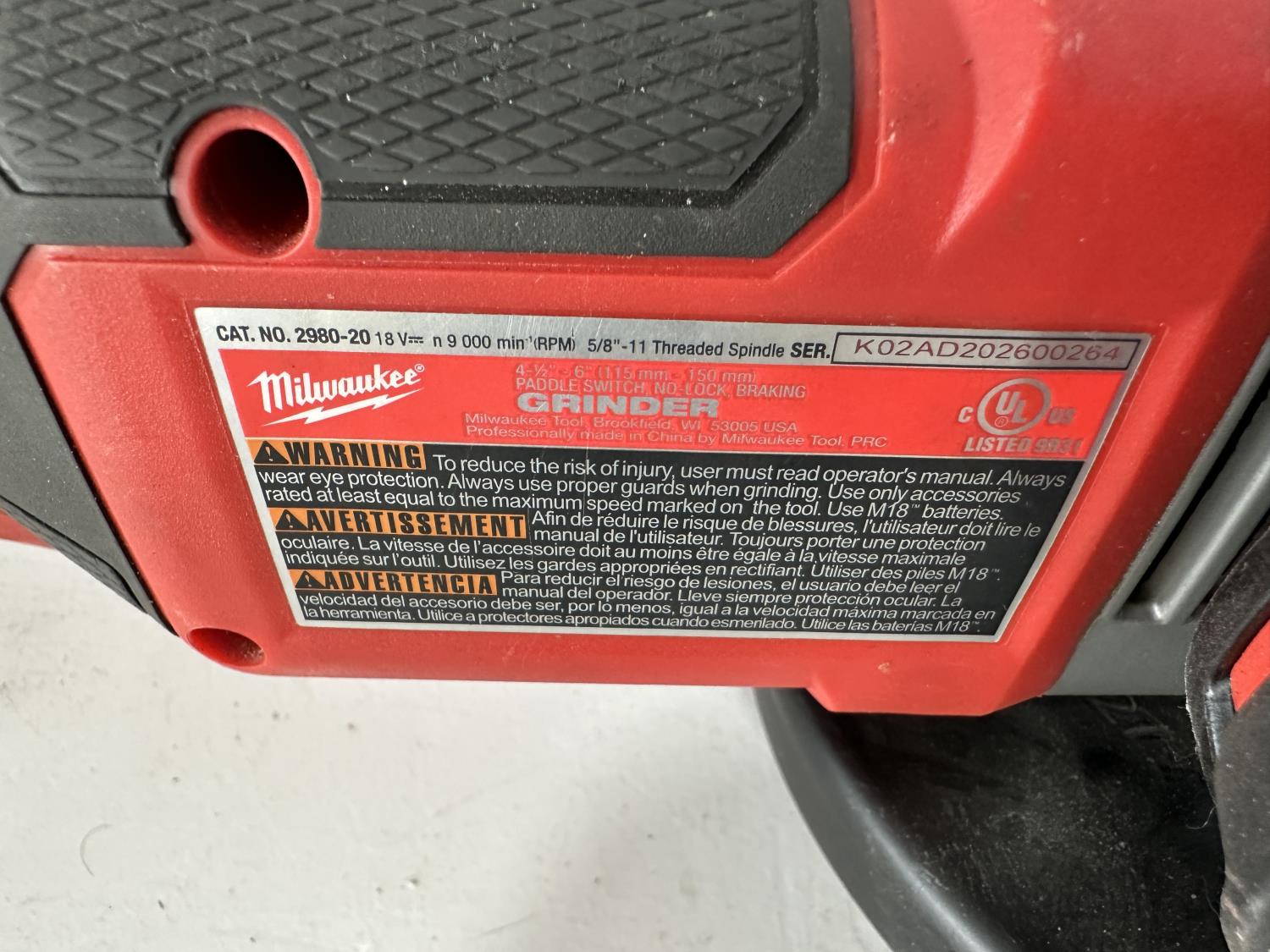 1092 Milwaukee M18 4-1/2 to 6 Inch Grinder