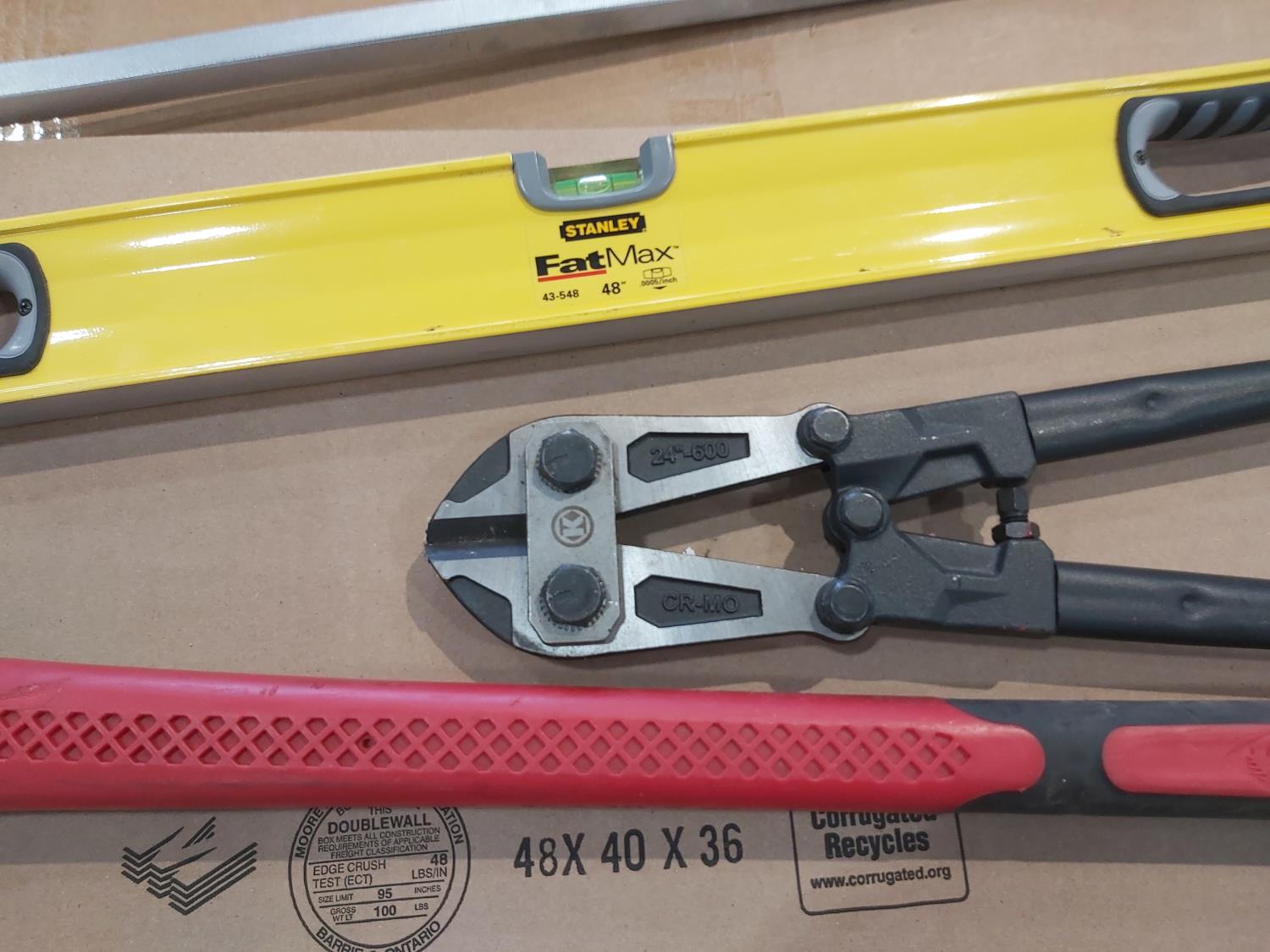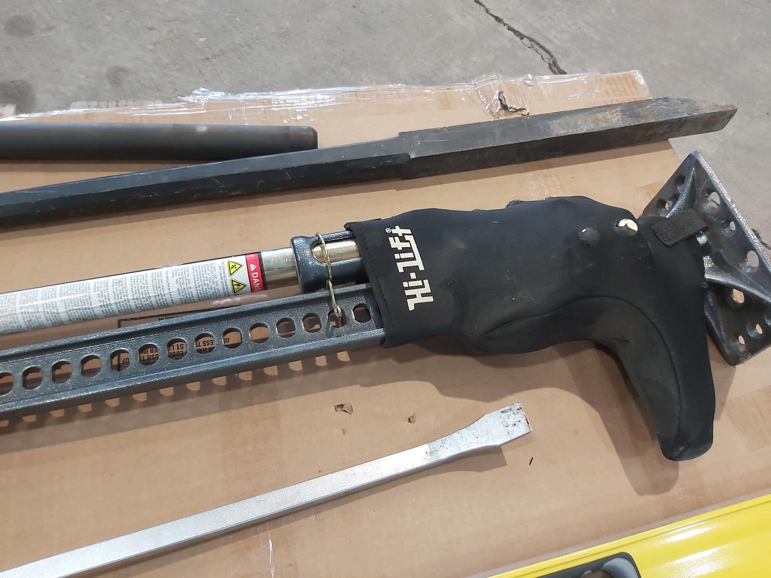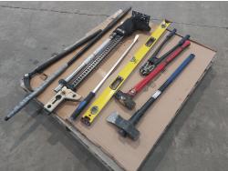 Hi-Lift jack-all, gear wrench bar, 48 inch level, 24 inch bolt cutters, sledge hammer, 8 lb splitting maul, (2) pry bars