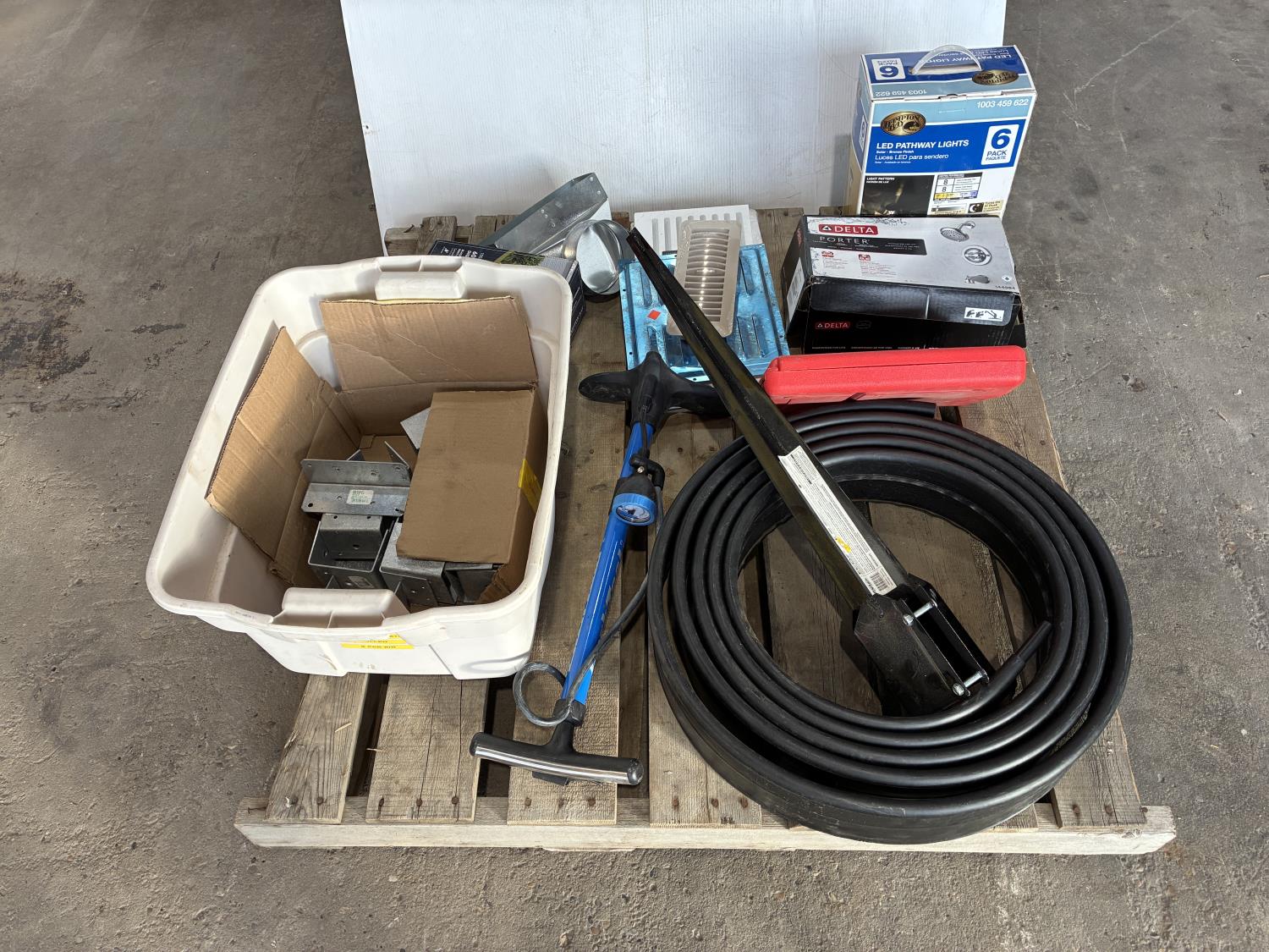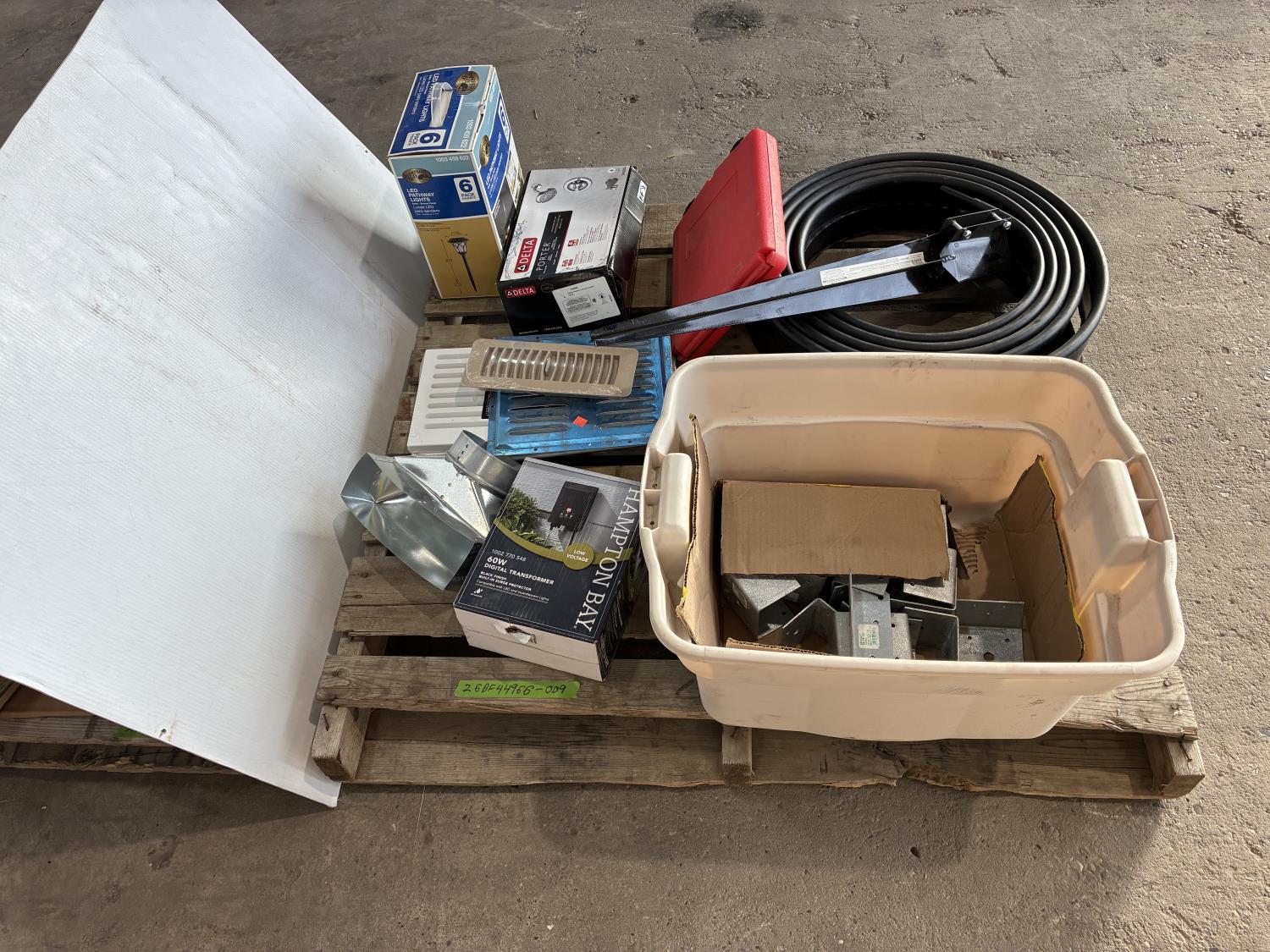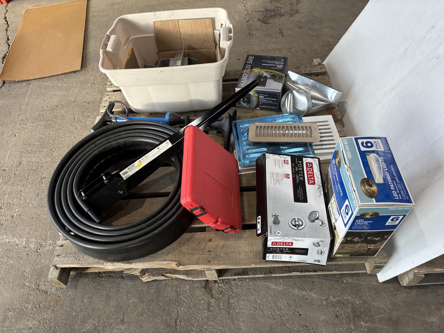 garden edging, post caps, eco-spike, Delta shower valve, LED solar path lights, 40W digital transformer, air pump, floor vent covers