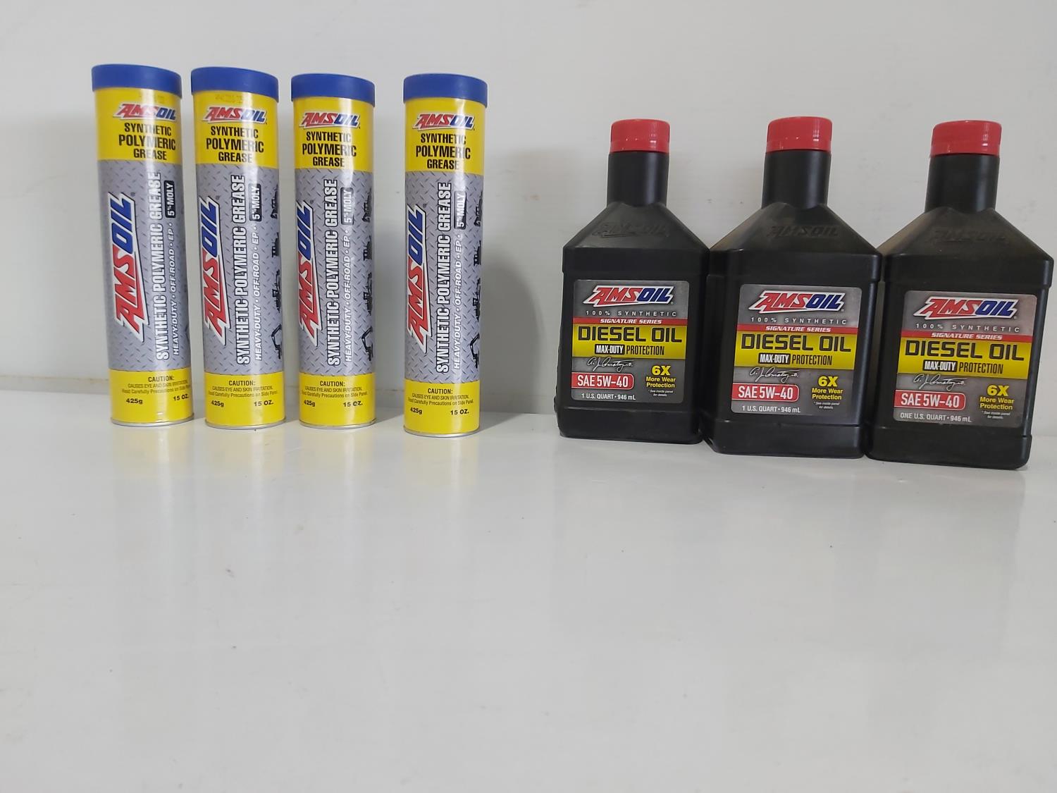 (3) 946ml Amsoil 5W-40 Diesel Oil and (4) Tubes of Amsoil Synthetic Polymeric Grease