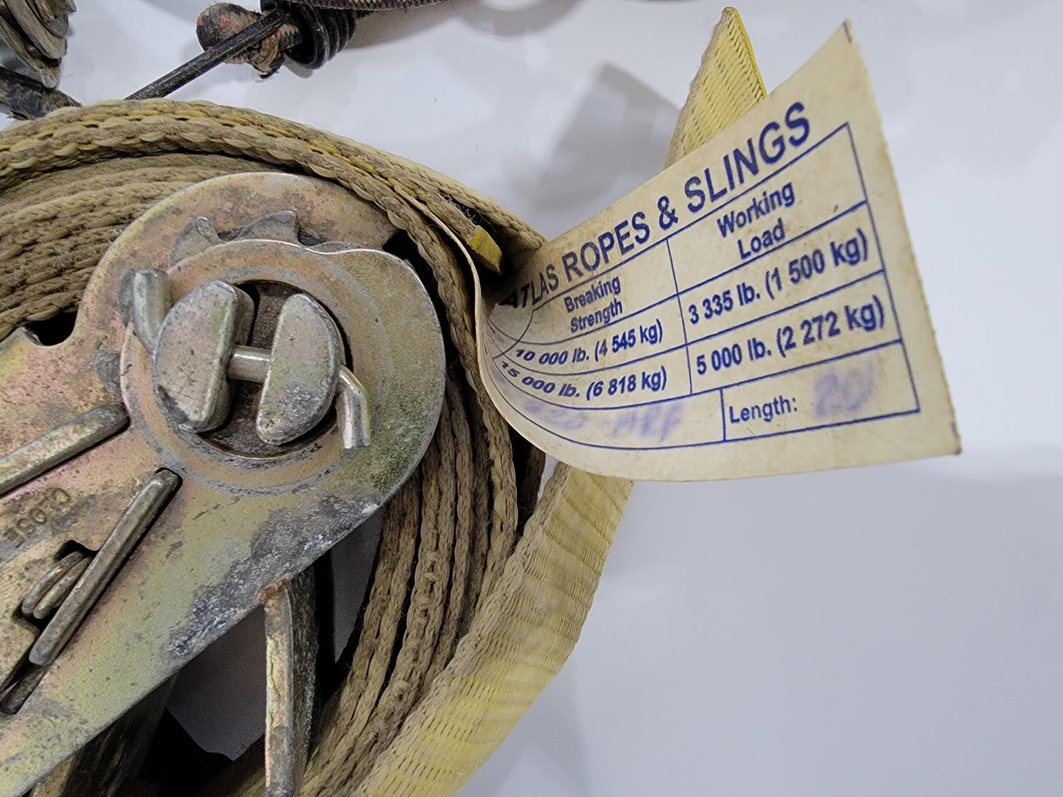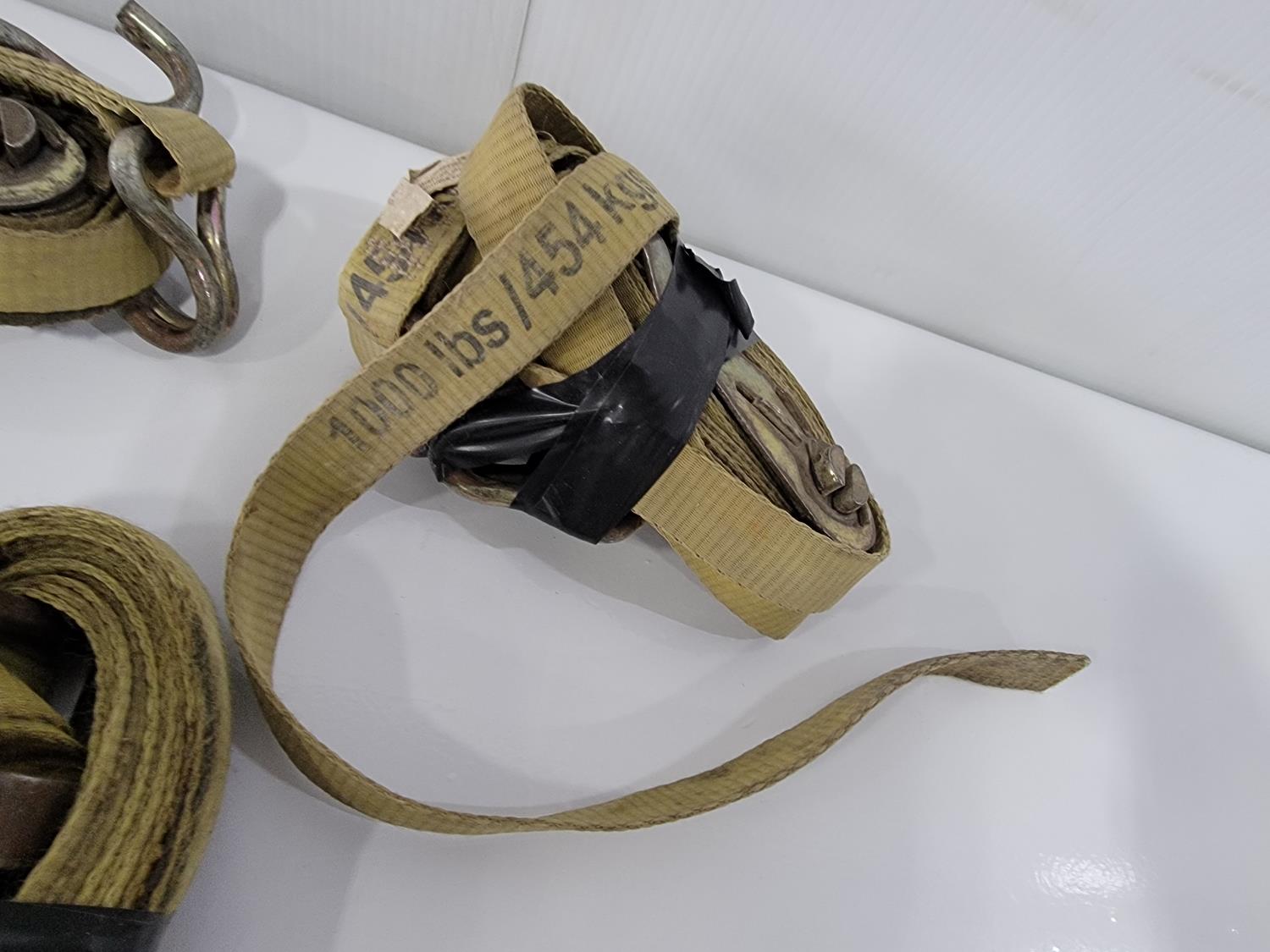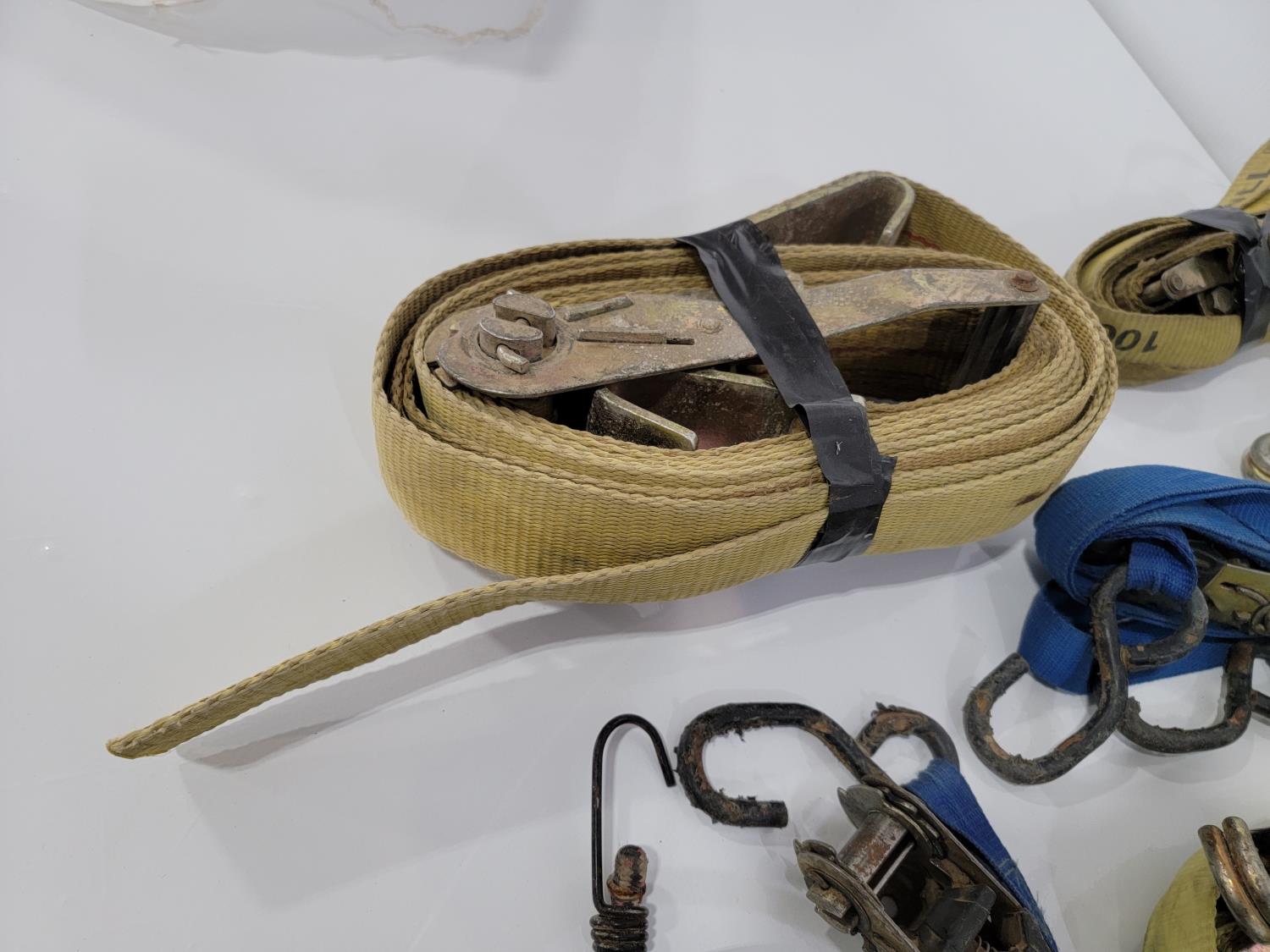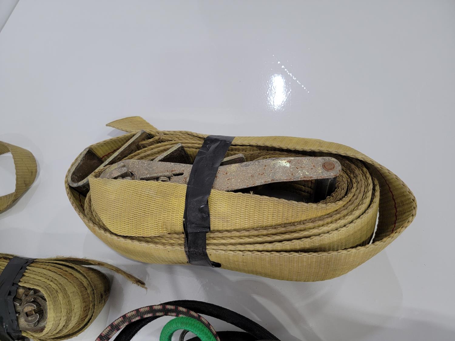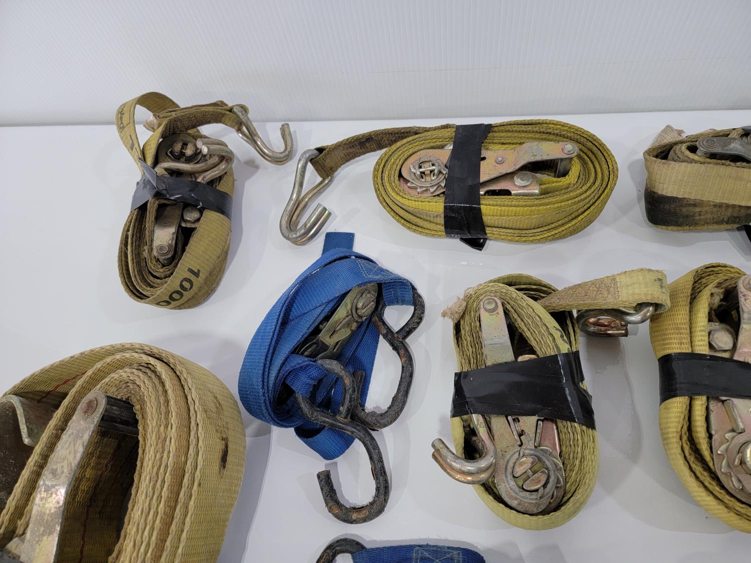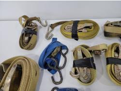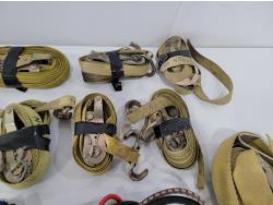 (2) 2 inch x 20 ft 10,000 lb ratchet straps, (8) 1 inch x 15 ft 1,000 lb ratchet straps