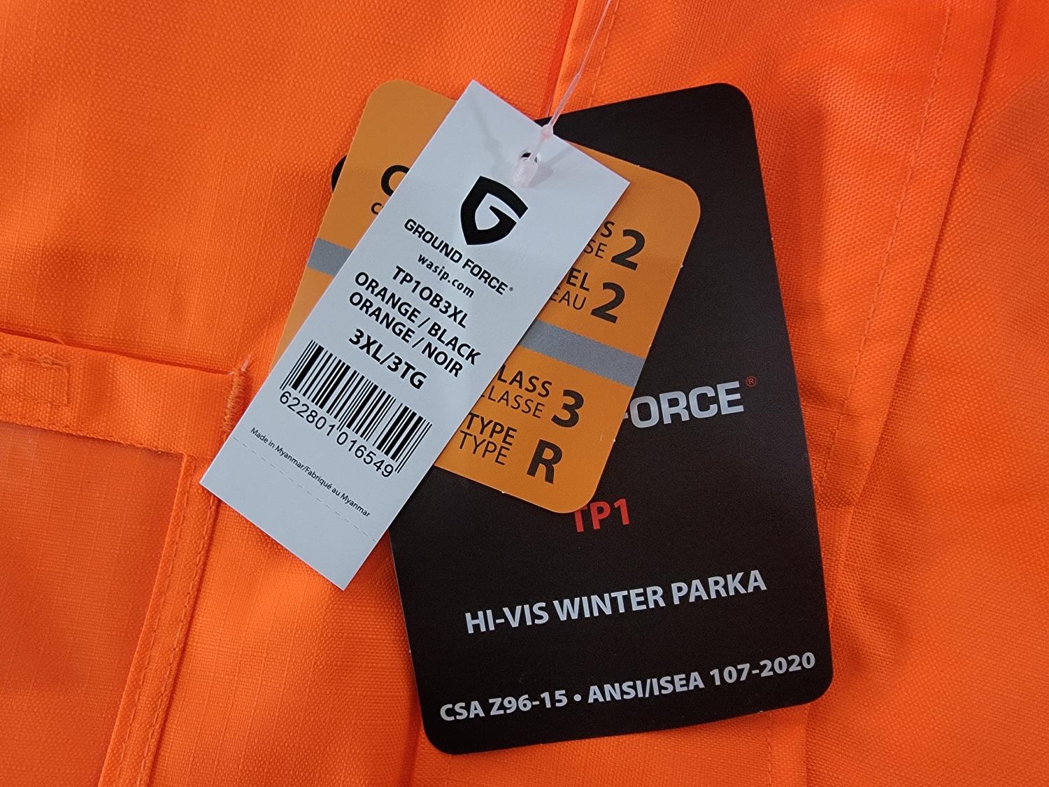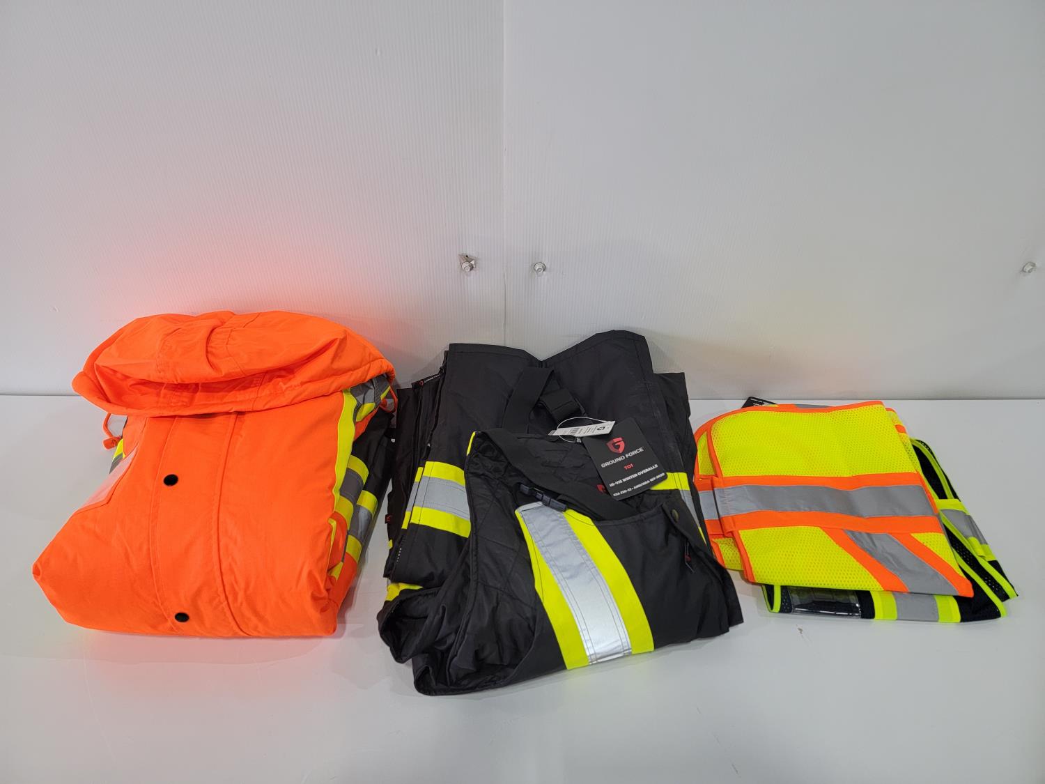 (2) Hi-Vis Mesh Traffic Vests, (1) Size 3XL Winter Bibs and (1) Size 3XL Hi-Vis Winter Parka