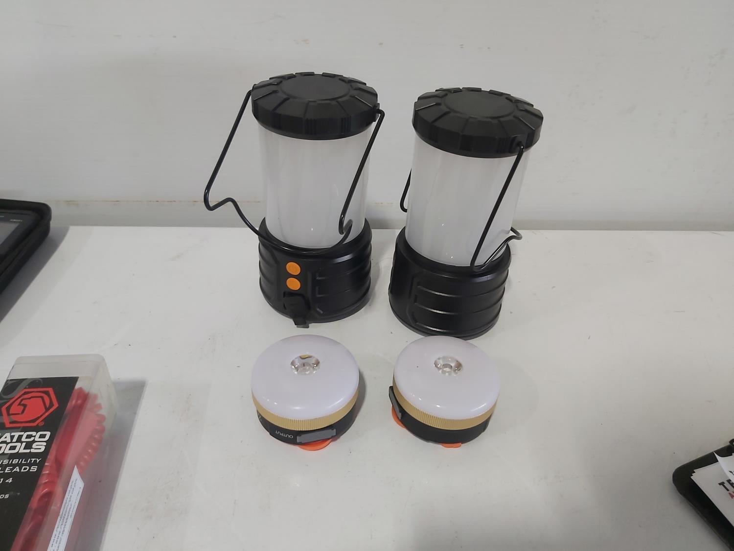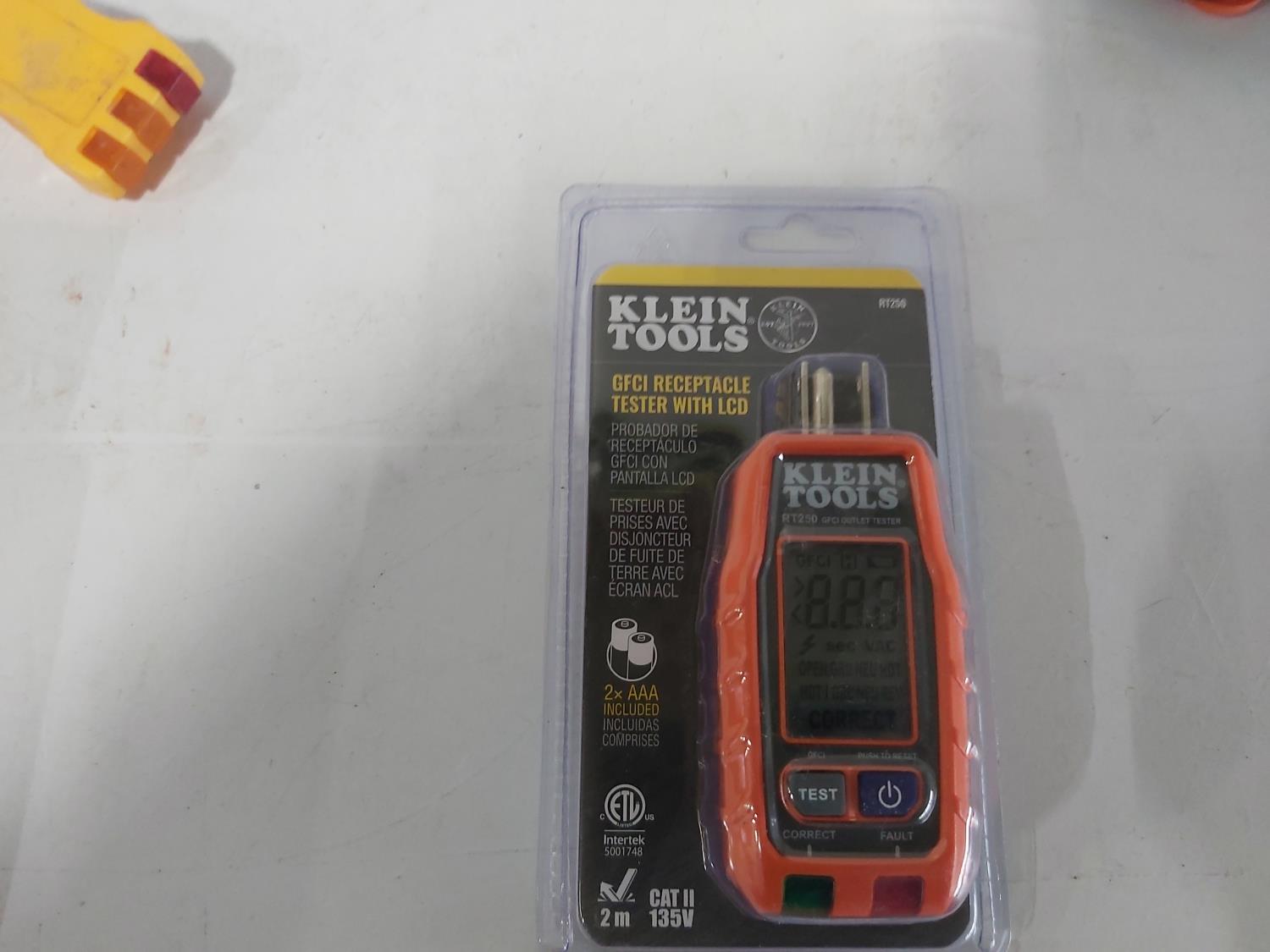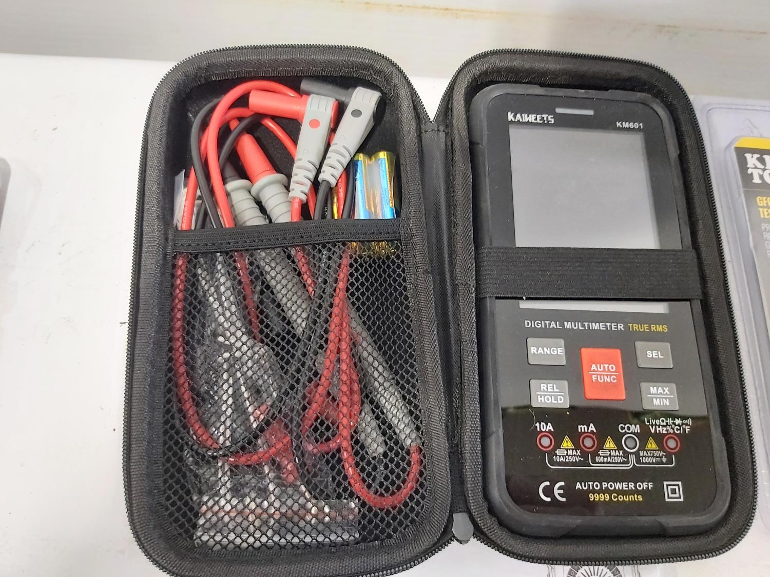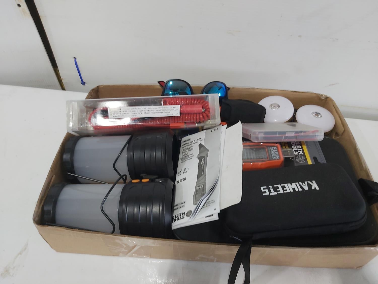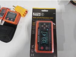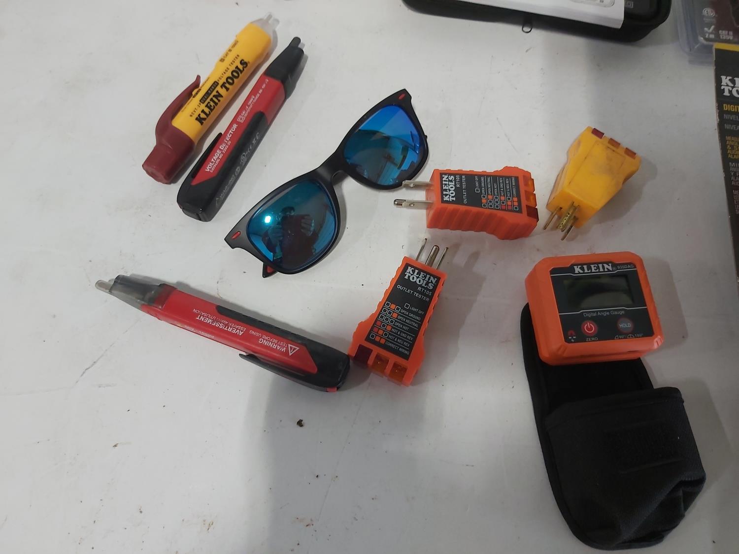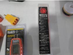 (4) work lamps, Matco Tools test leads, Klein Tools receiver, Klein Tools GFCI receptacle tester, Klein Tools digital level, Kaiweets digital multimeter, Klein digital angle gauge, Snap-on test lead kits, (3) outlet testers, (3) voltage detectors