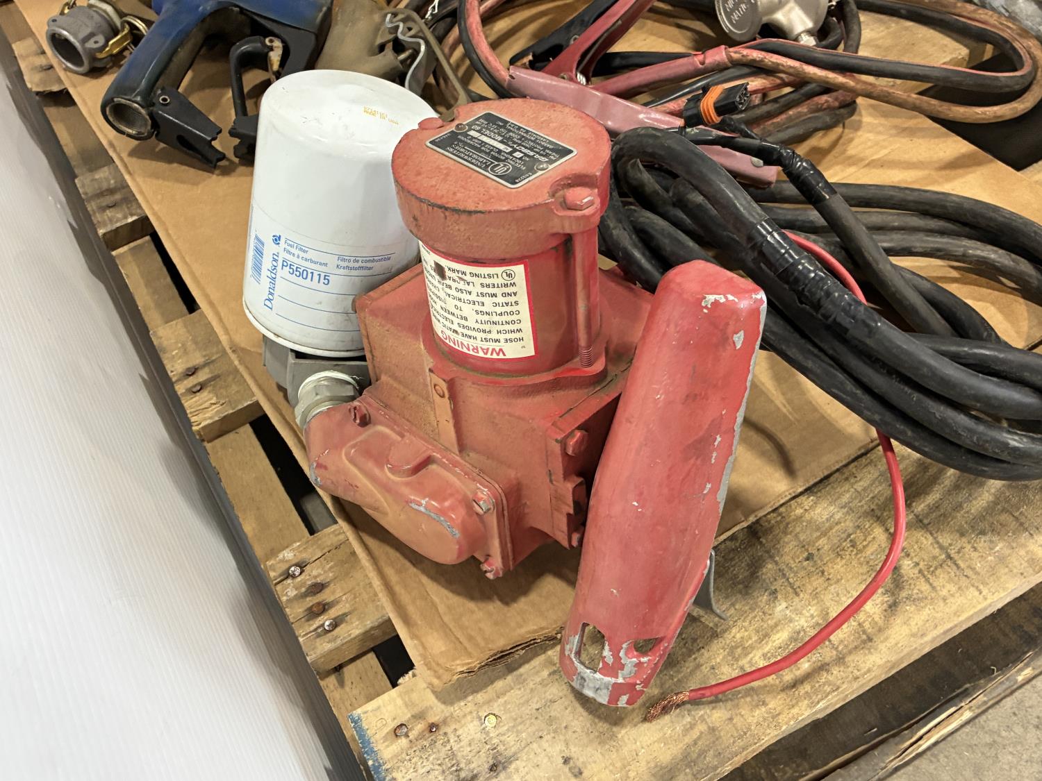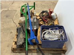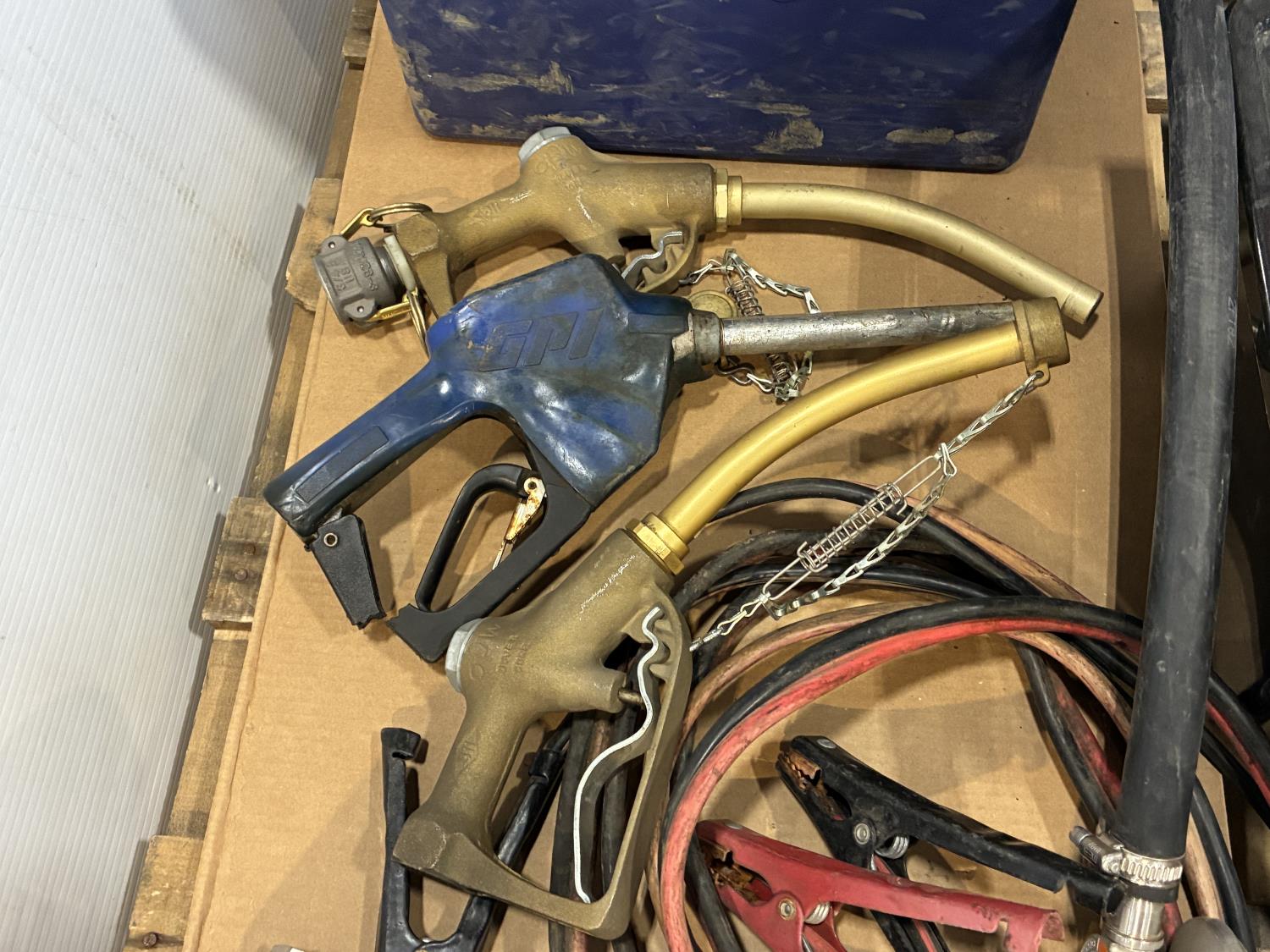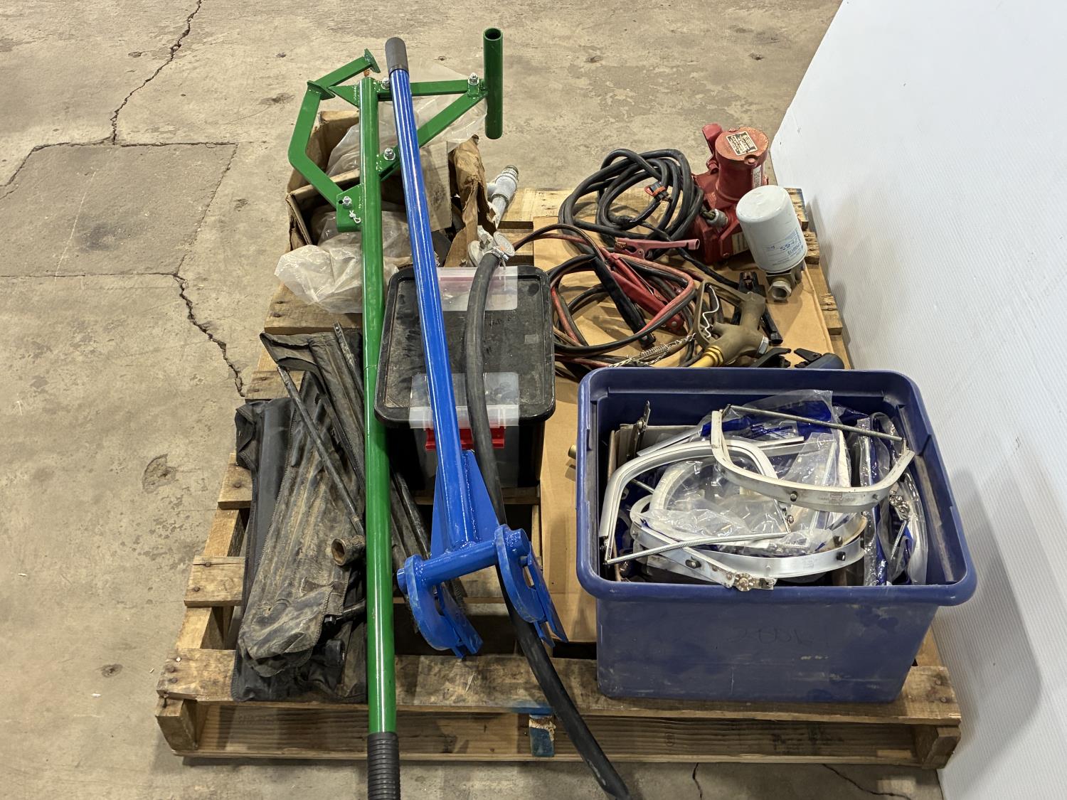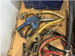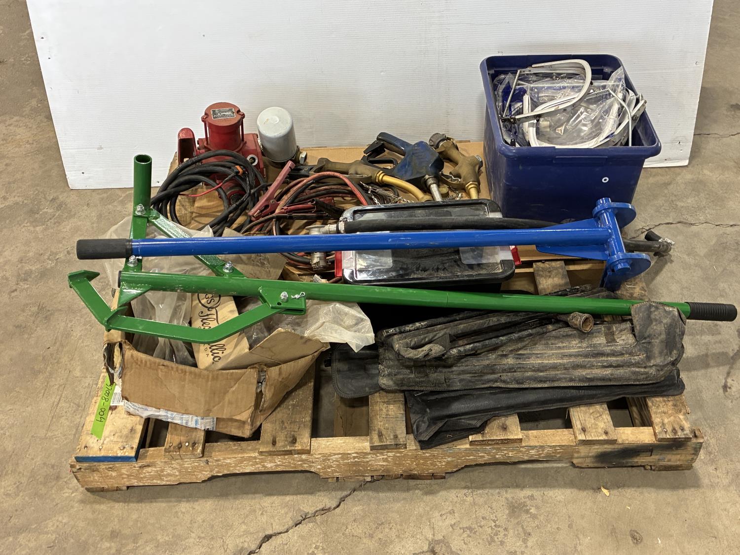 log jack (unused), pallet buster, tire irons, drill handles, face shield brackets, fuel nozzle, (2) brass fuel nozzles, booster cables, 12V transfer pump with filter