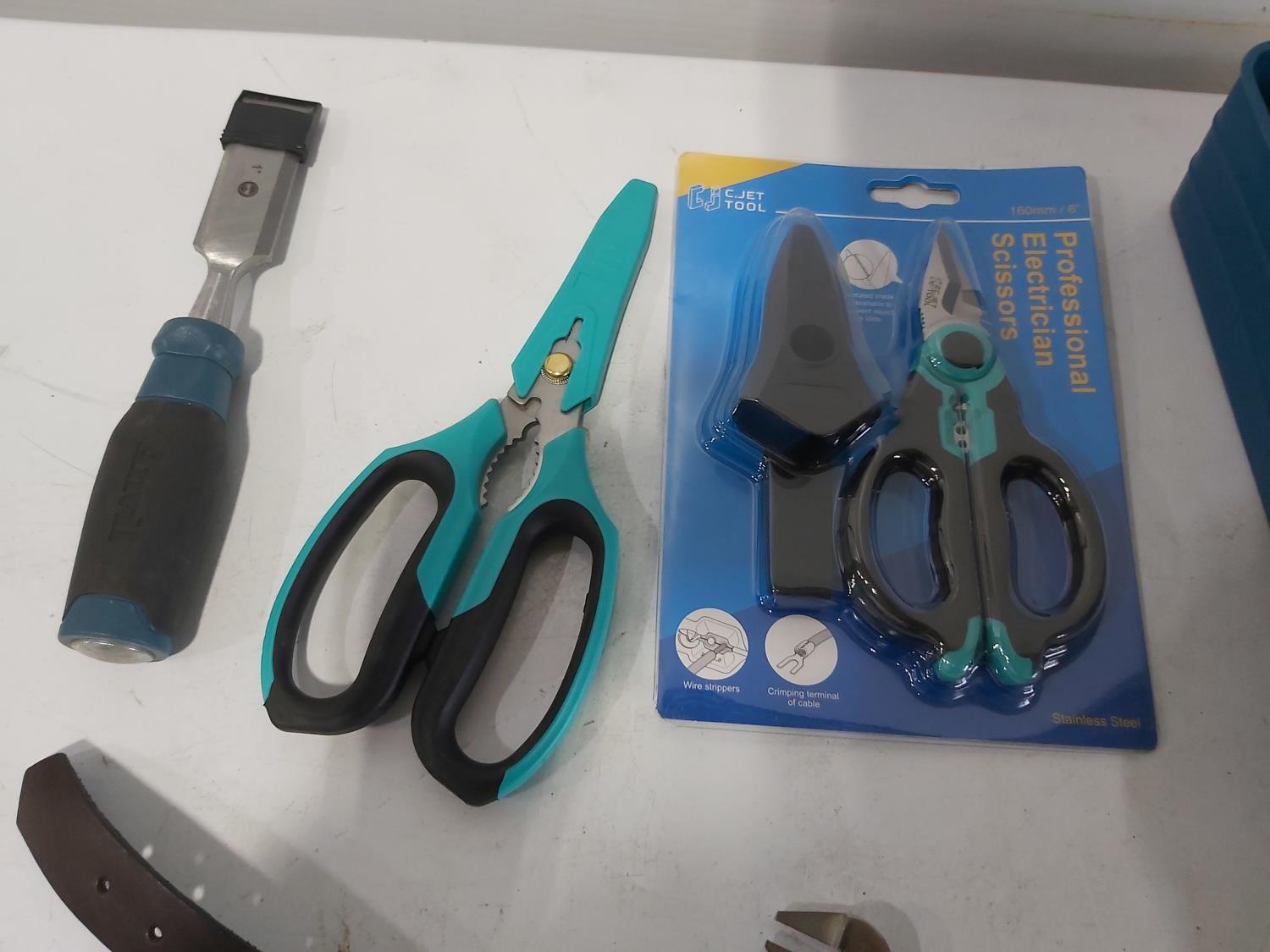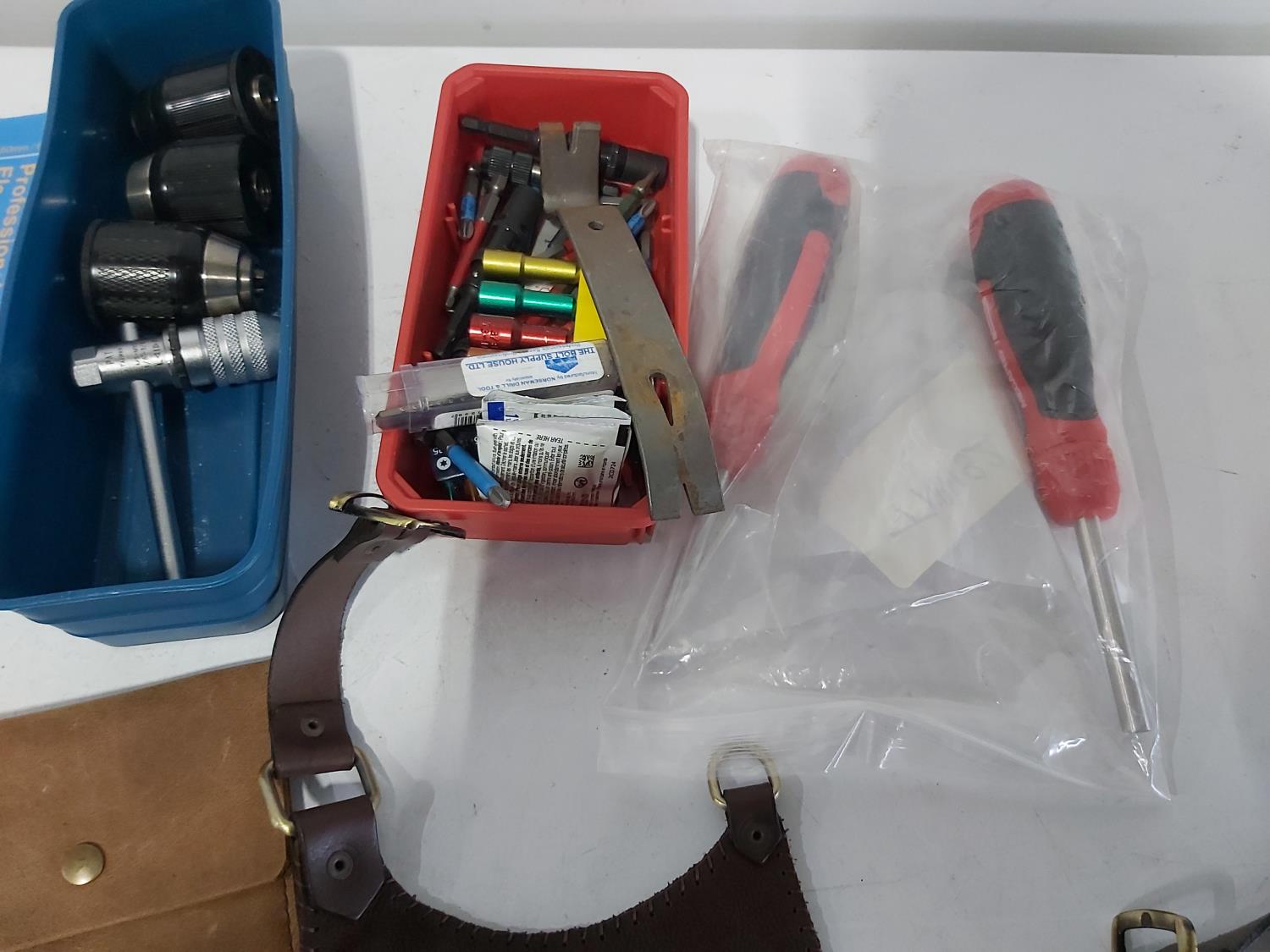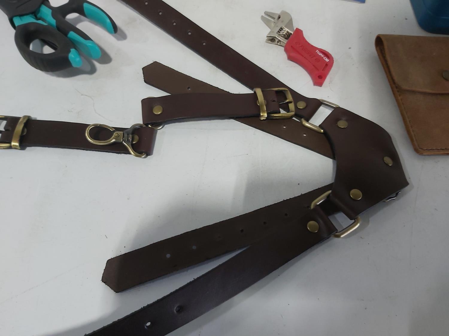 leather tool belts, leather wallet, industrial scissors, mini adjustable wrench, drill drive set, chisel, (4) chucks, (2) screwdrivers