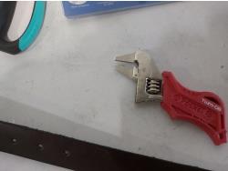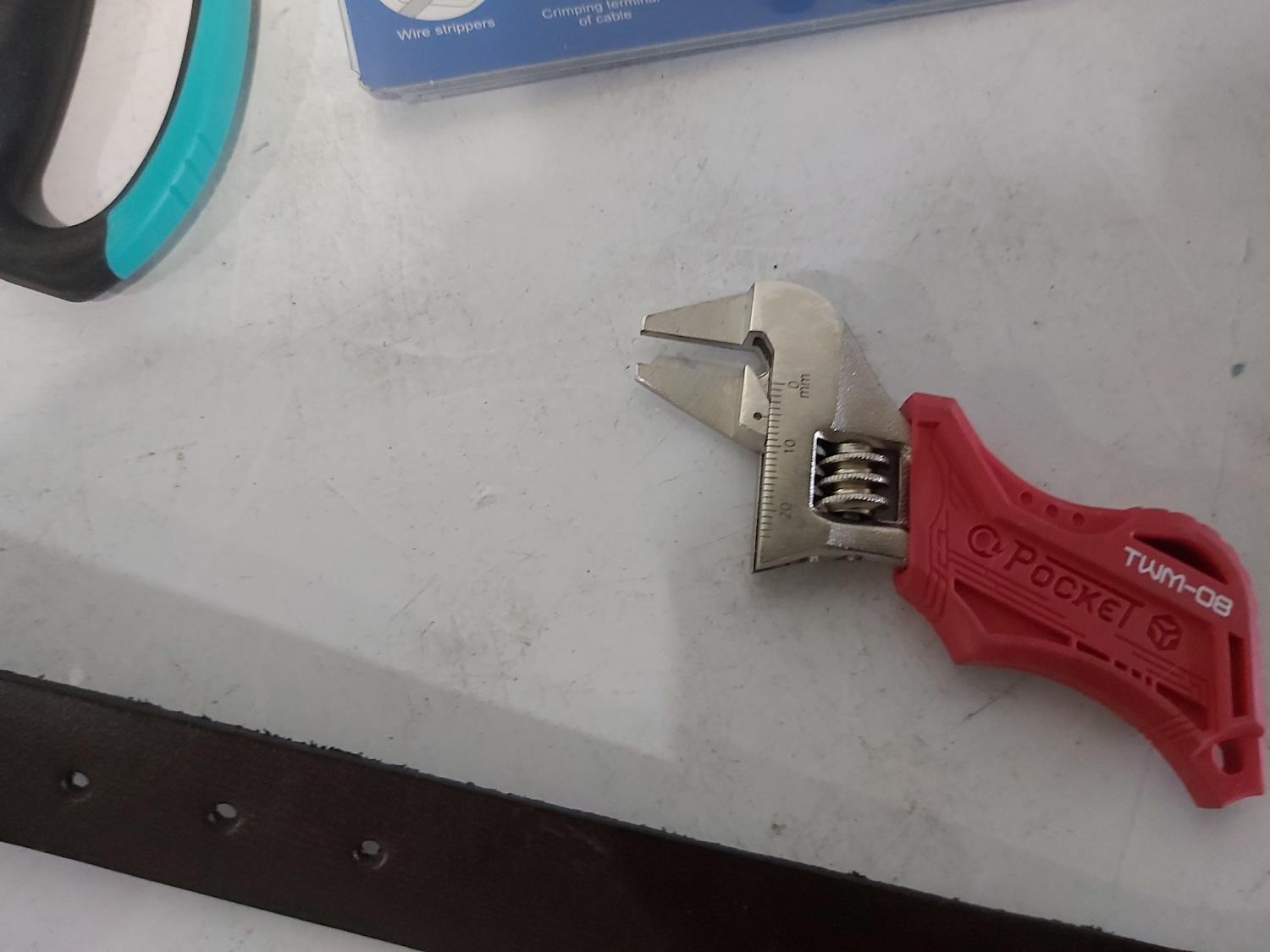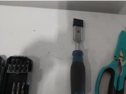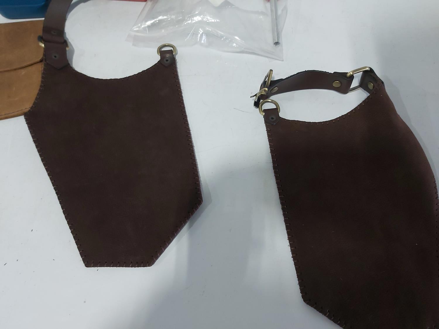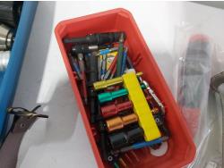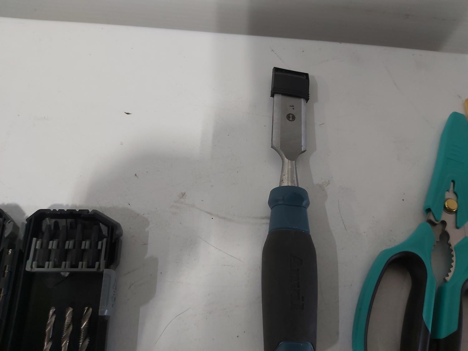 leather tool belts, leather wallet, industrial scissors, mini adjustable wrench, drill drive set, chisel, (4) chucks, (2) screwdrivers