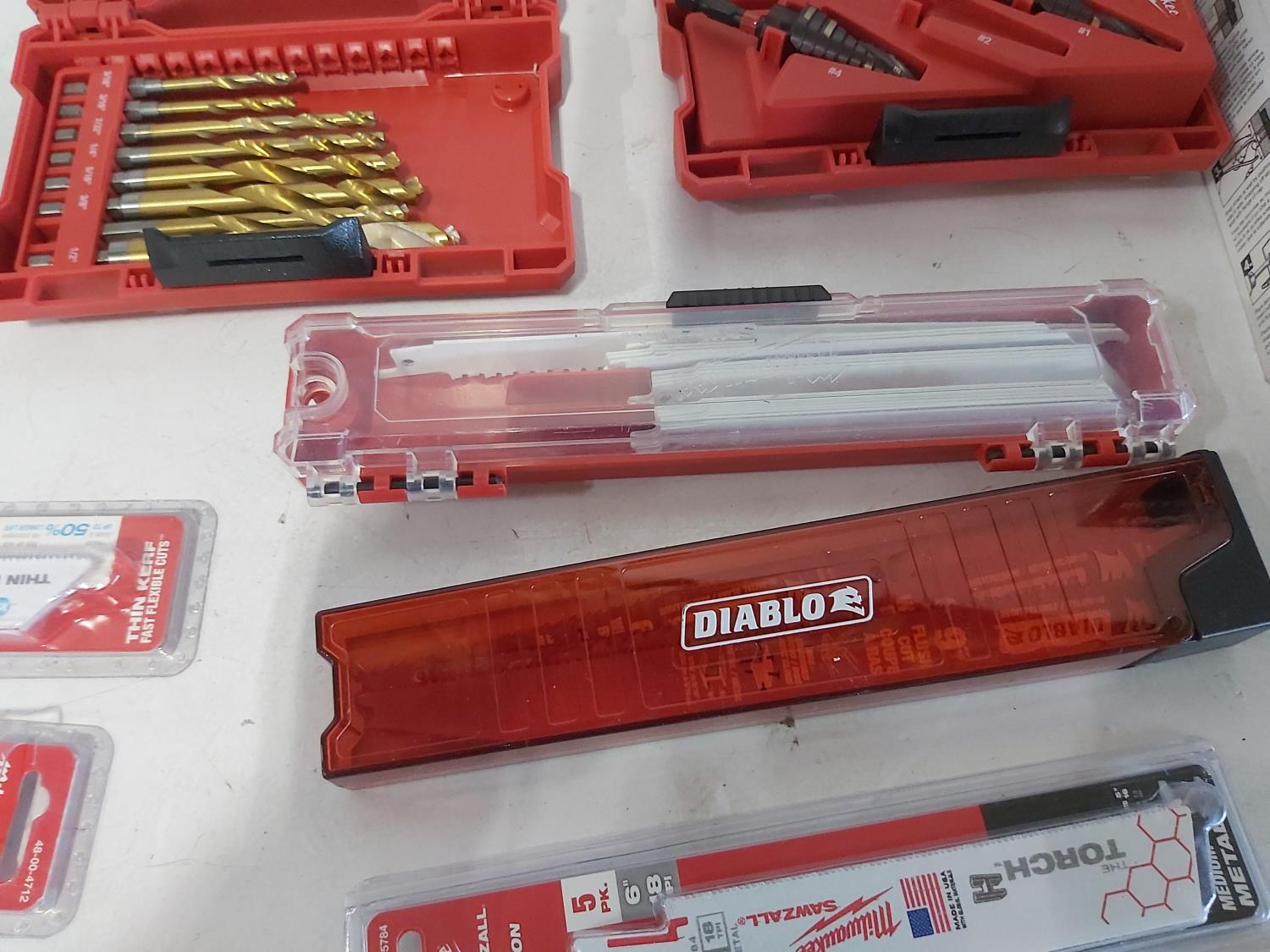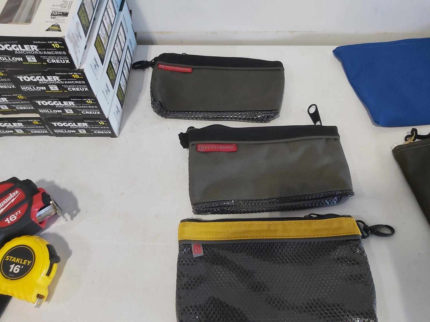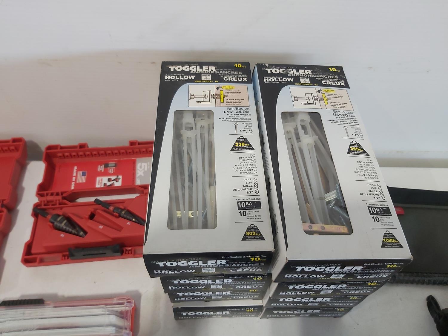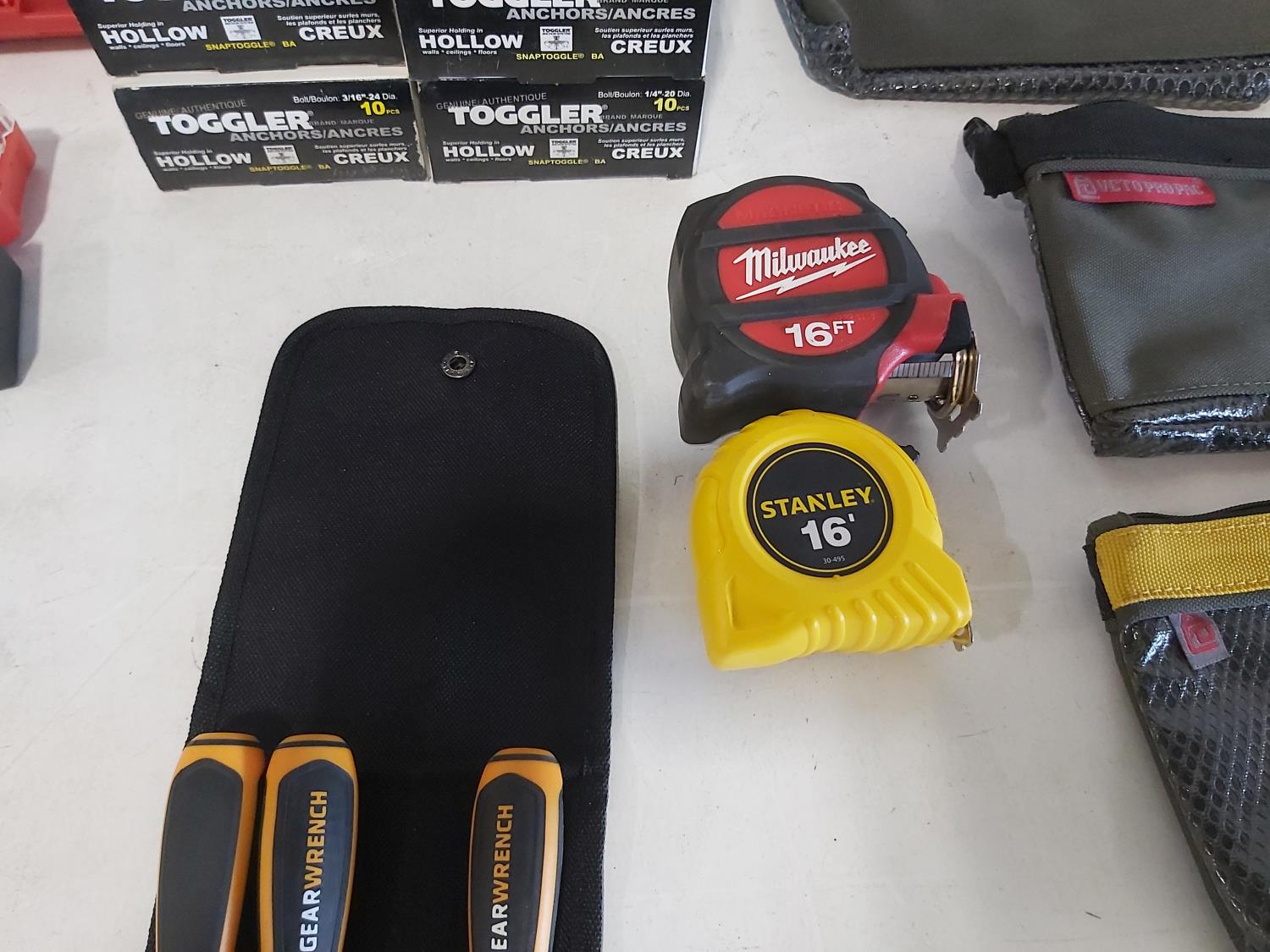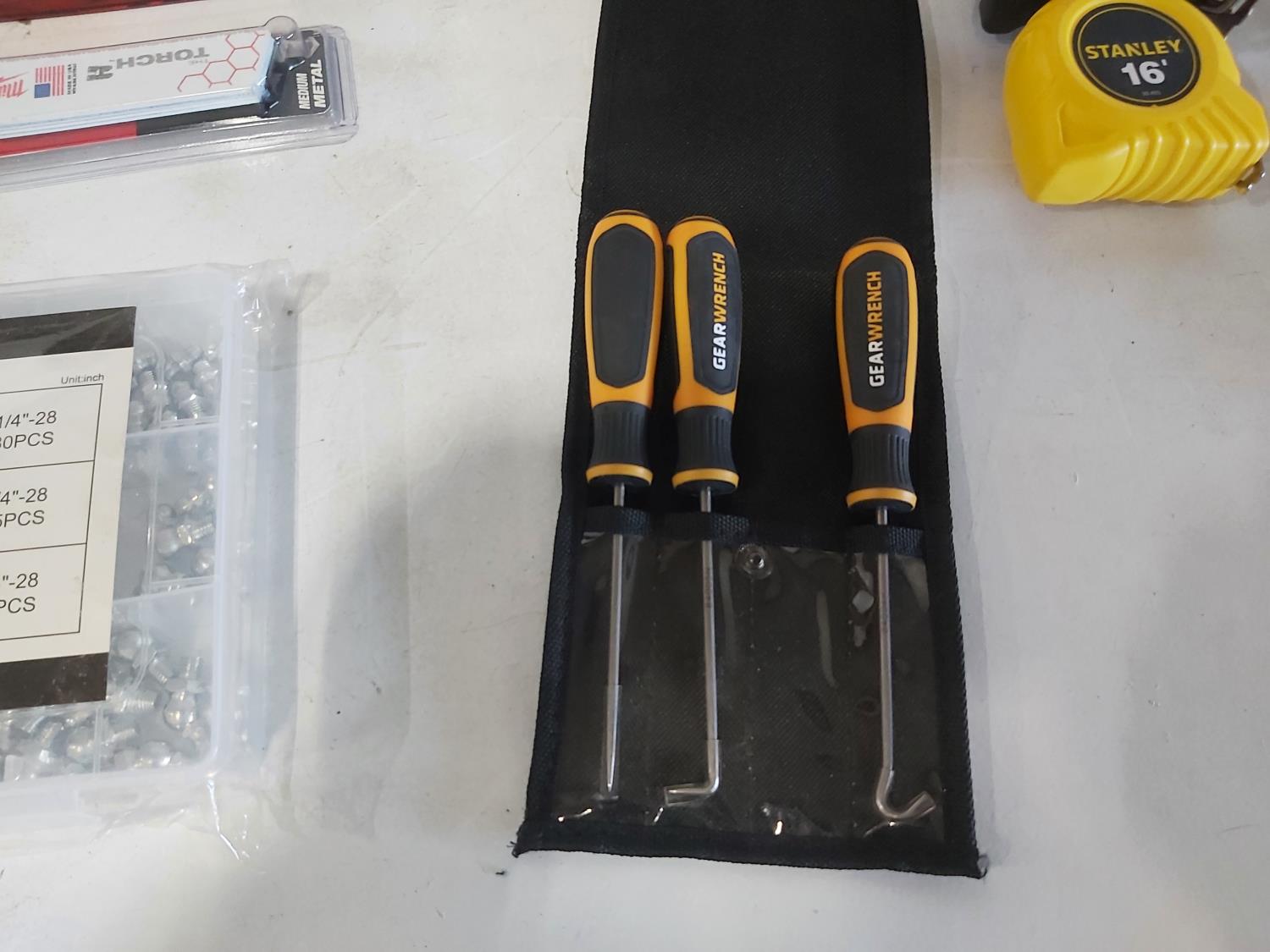 toggler anchors, (2) 16 ft measuring tapes, (6) small tool bags, 120 piece hydraulic grease fitting kit, Milwaukee sawzall blades, Milwaukee drill bit kit, Milwaukee shockwave kit, Milwaukee driver kit