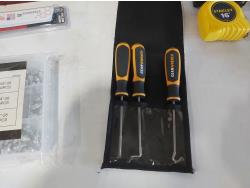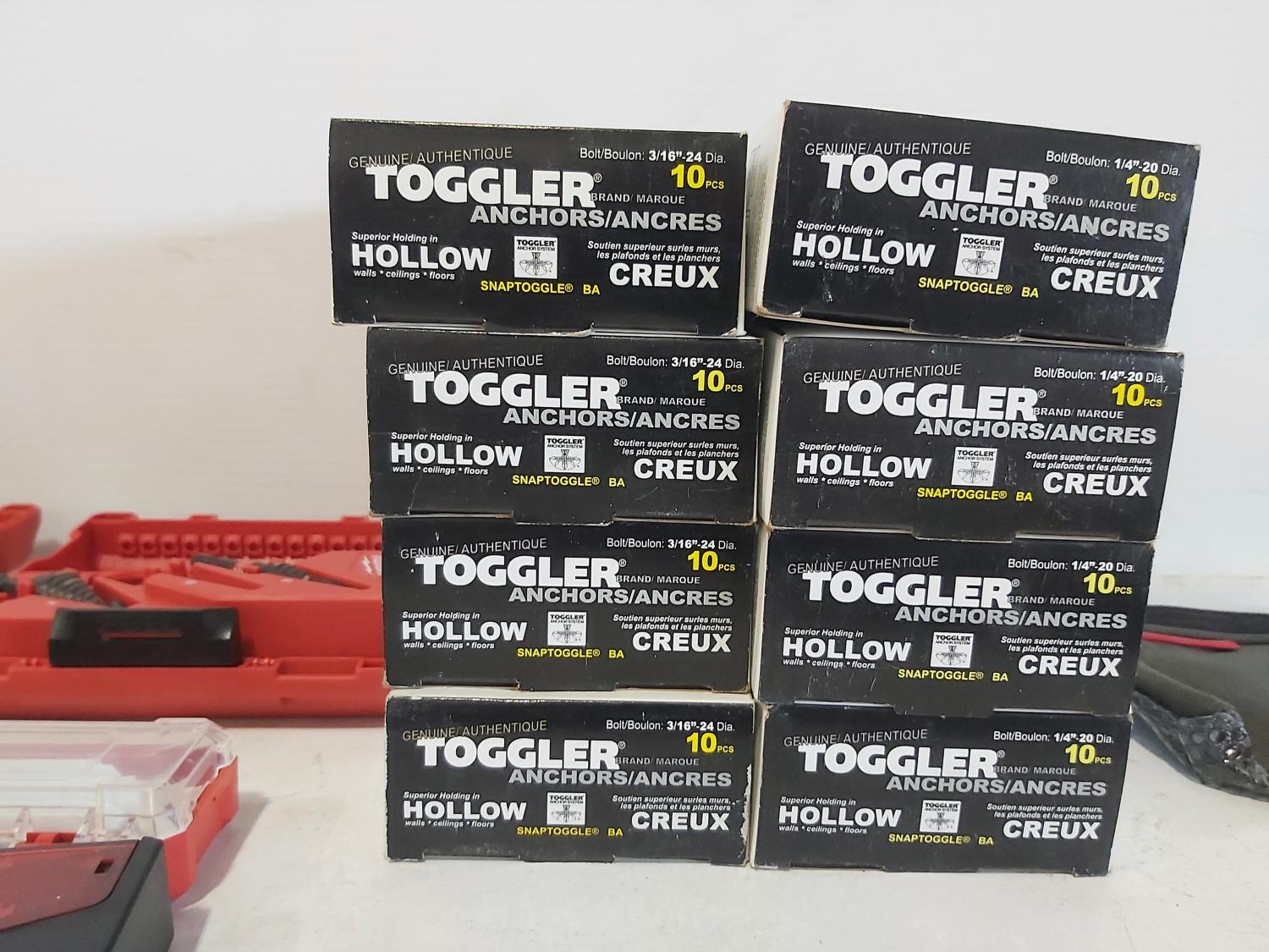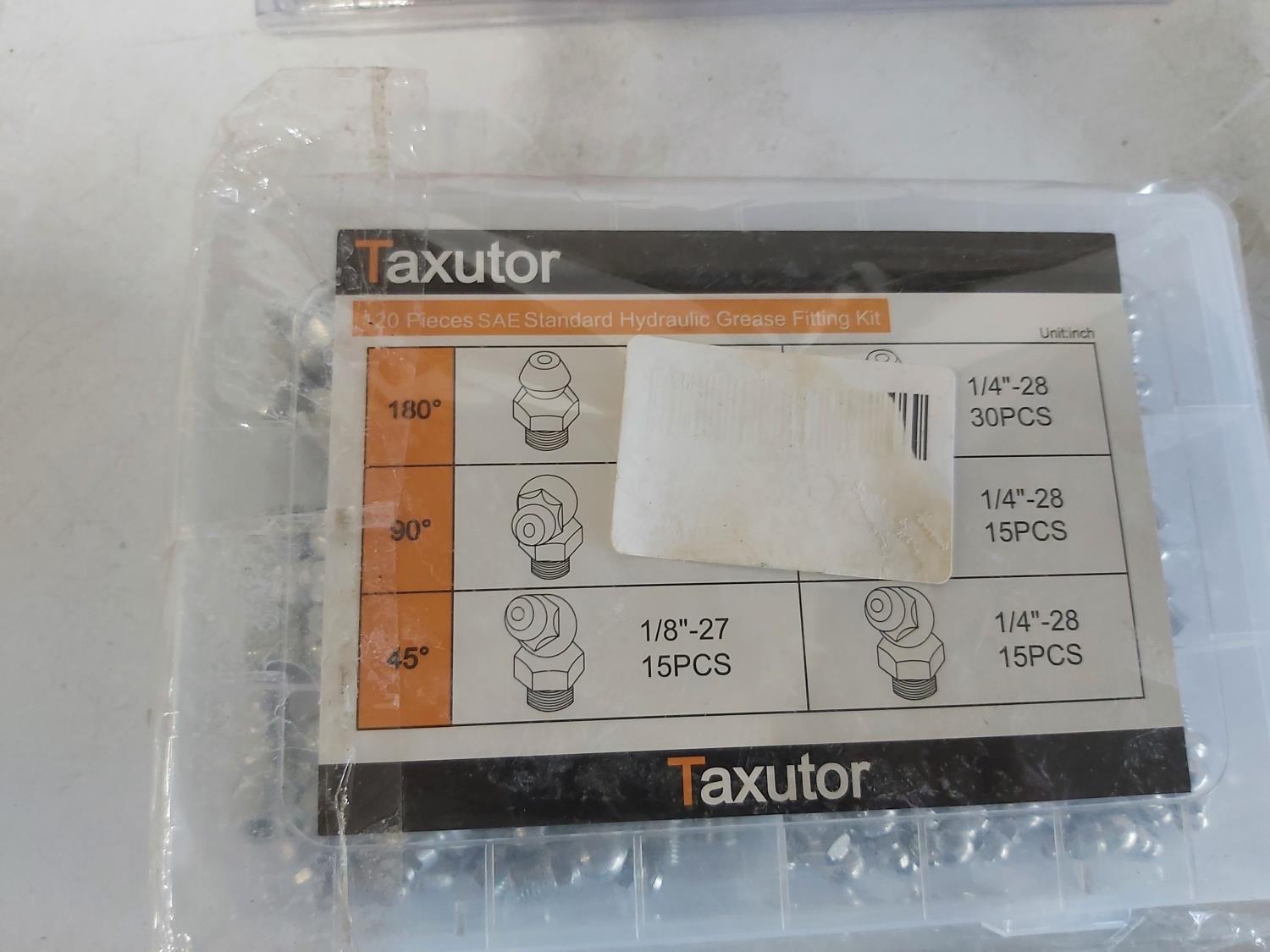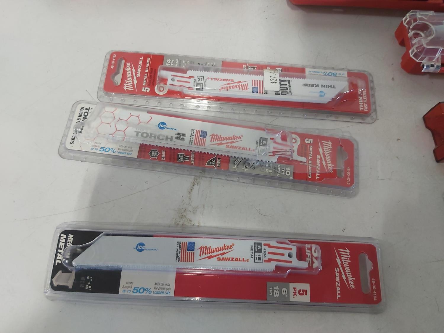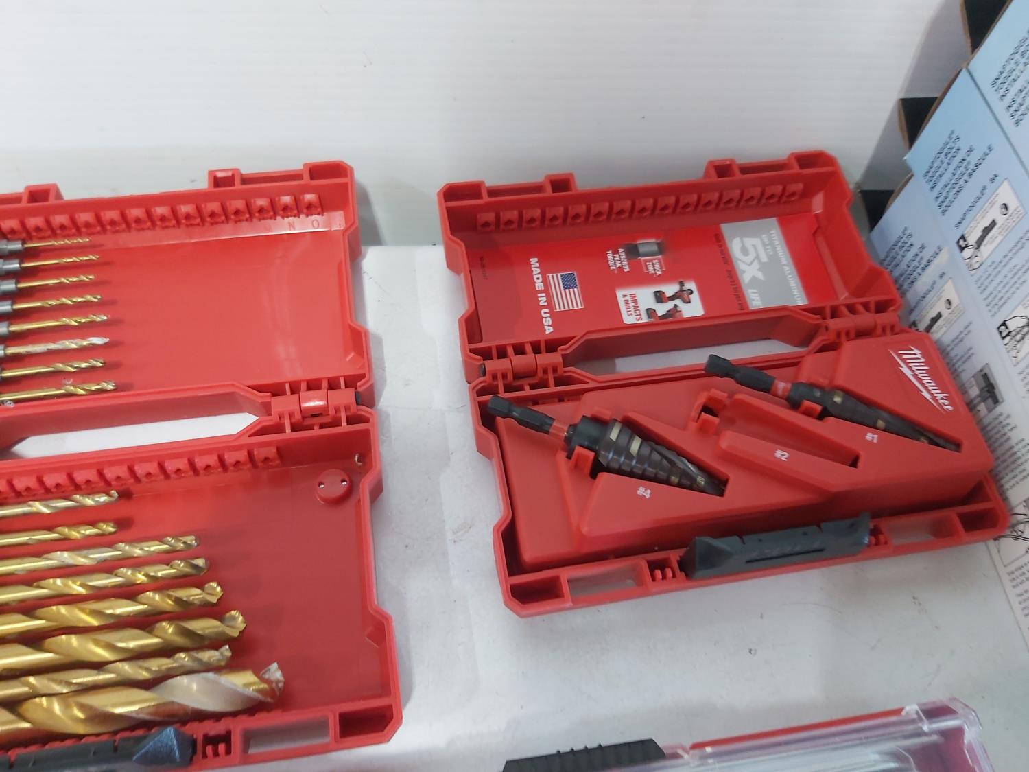 toggler anchors, (2) 16 ft measuring tapes, (6) small tool bags, 120 piece hydraulic grease fitting kit, Milwaukee sawzall blades, Milwaukee drill bit kit, Milwaukee shockwave kit, Milwaukee driver kit