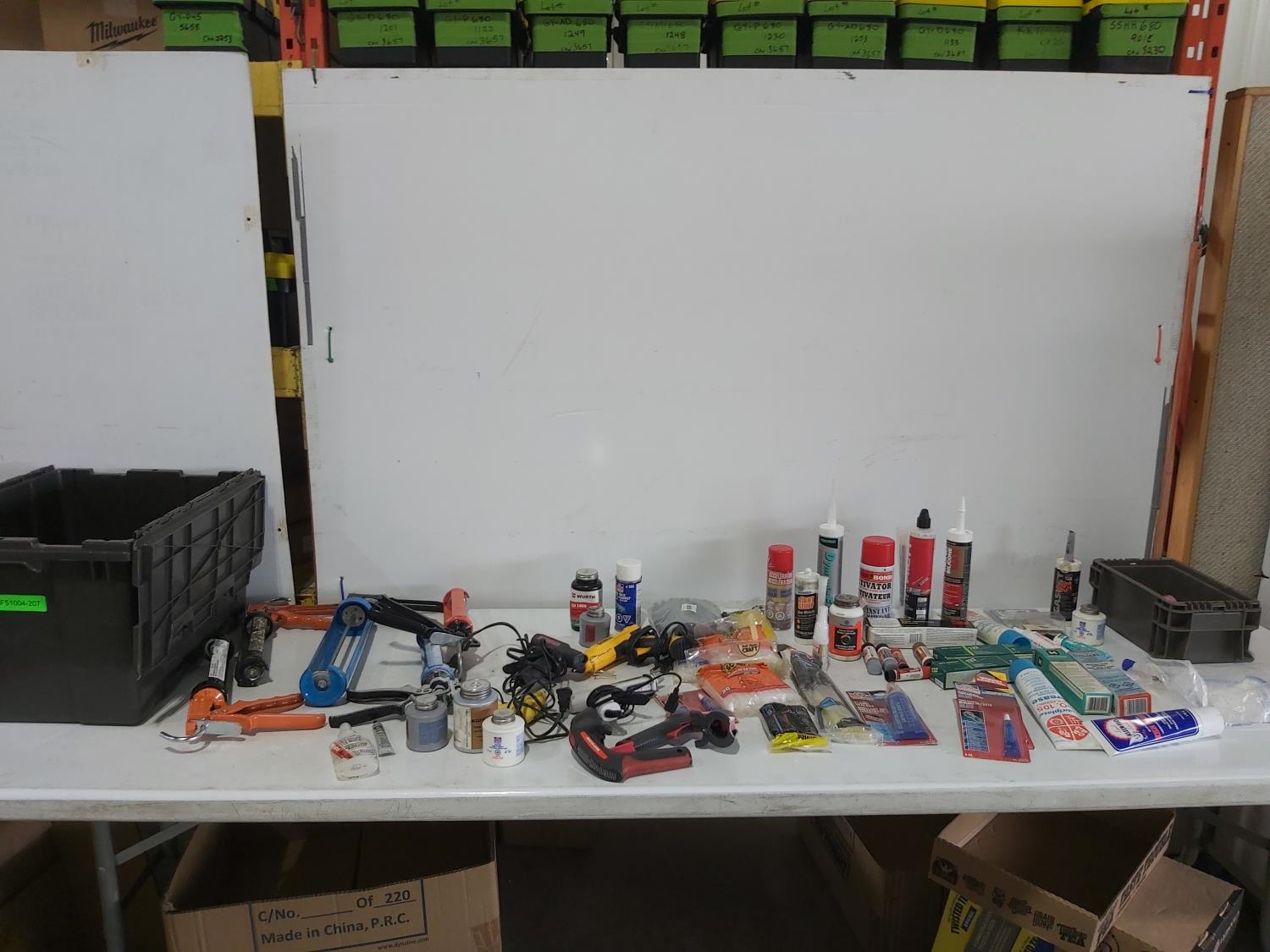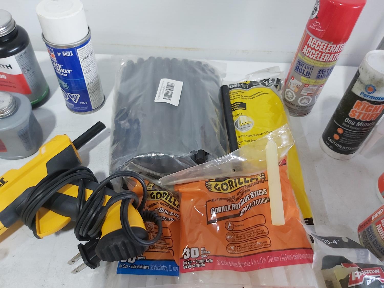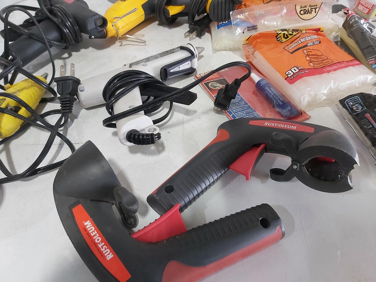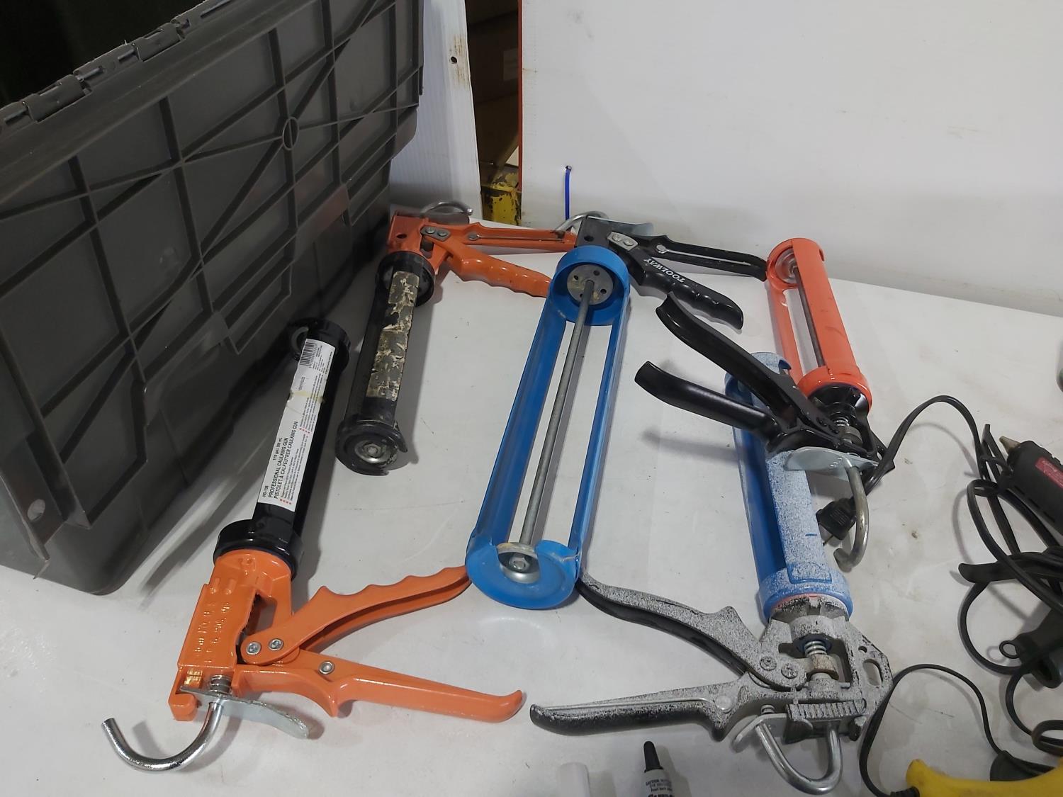 (5) caulking guns, (4) glue guns, glue sticks