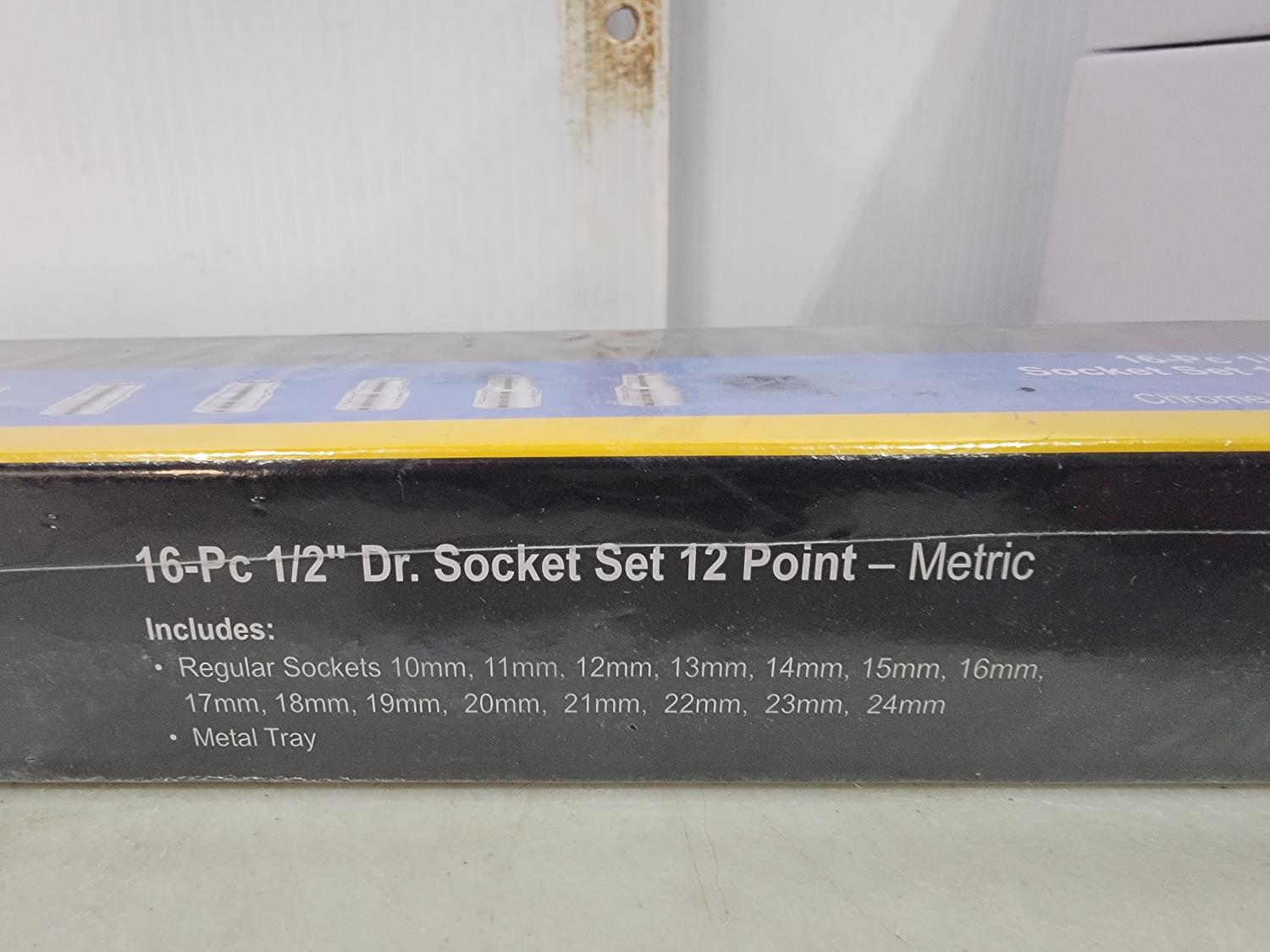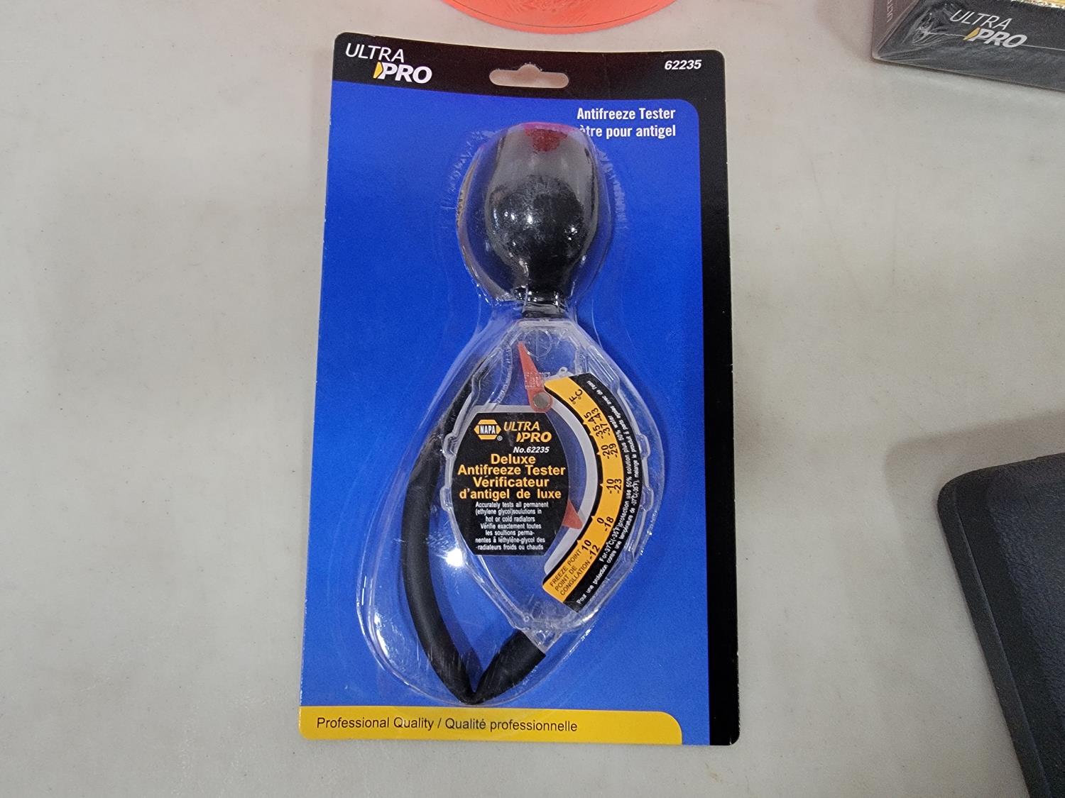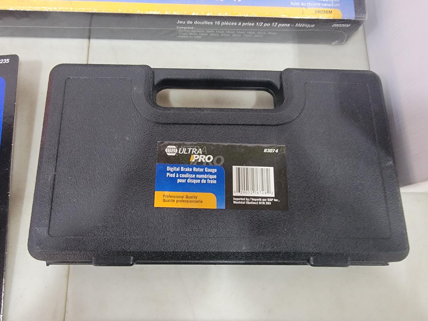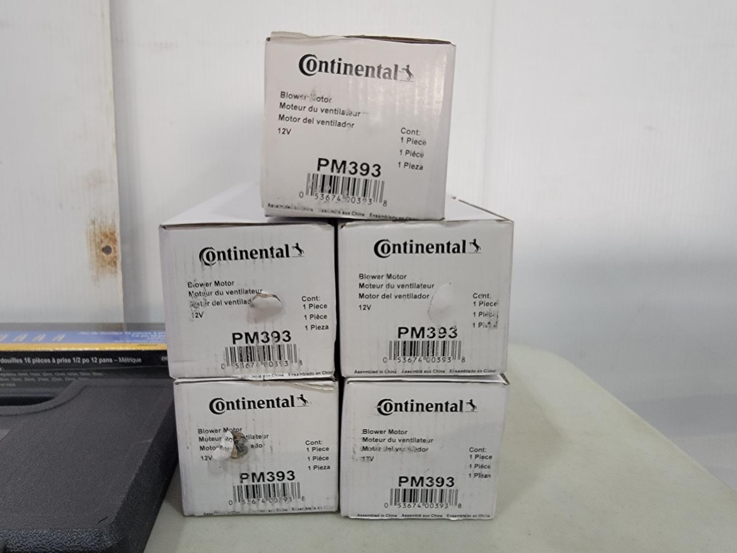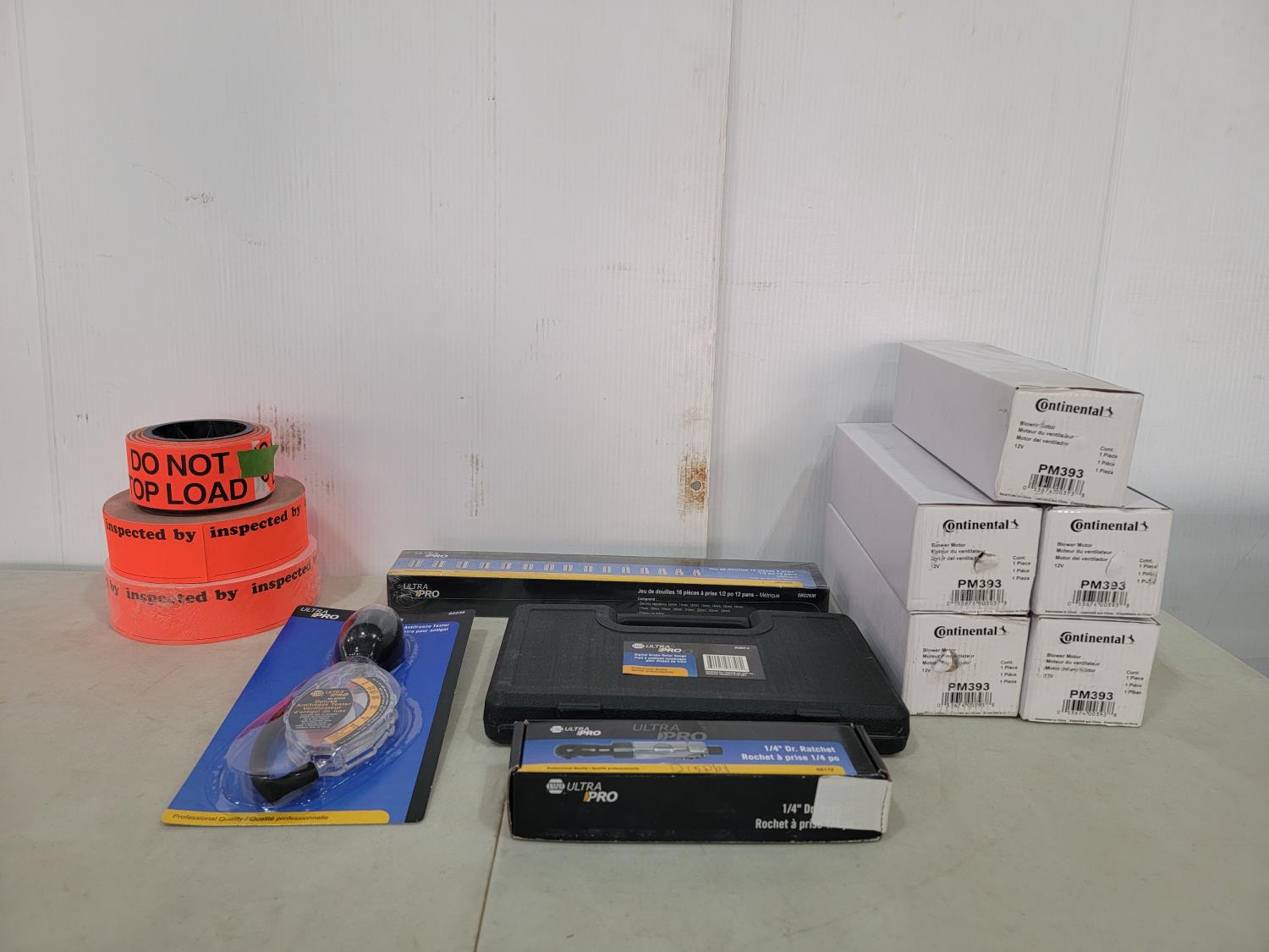 (5) Continental 12V blower motors, digital brake rotor gauge, 16 piece 1/2 inch drive socket set, 1/4 inch drive ratchet, antifreeze tester
