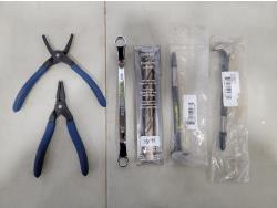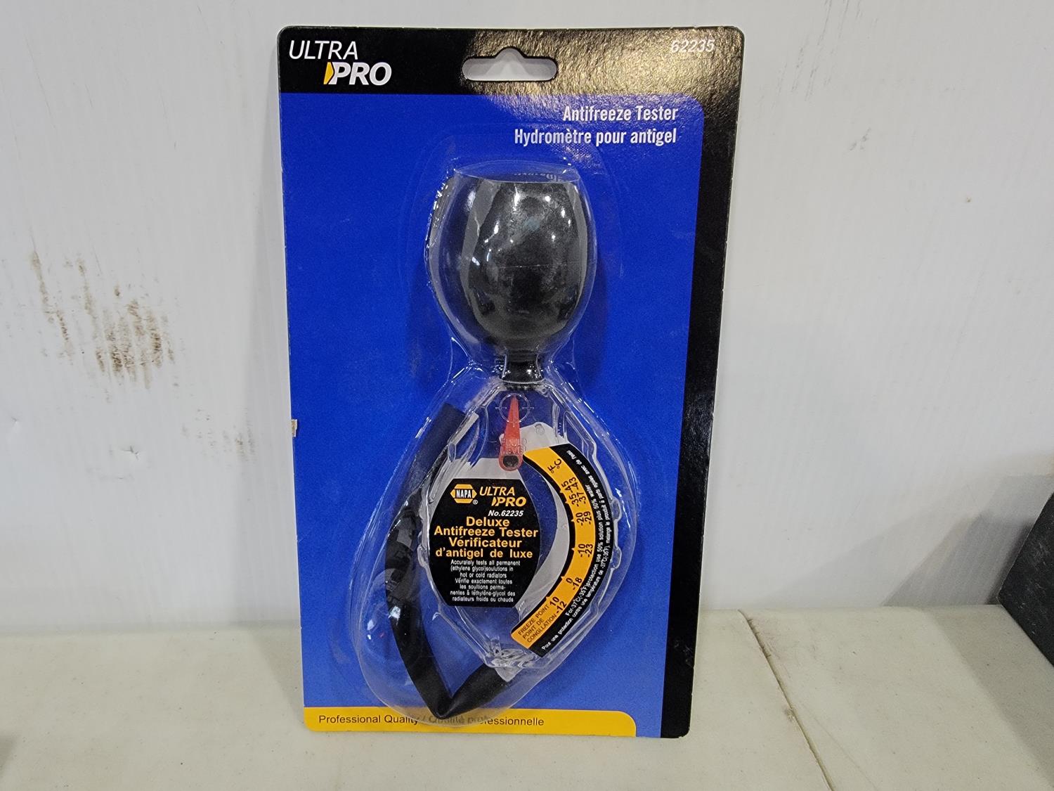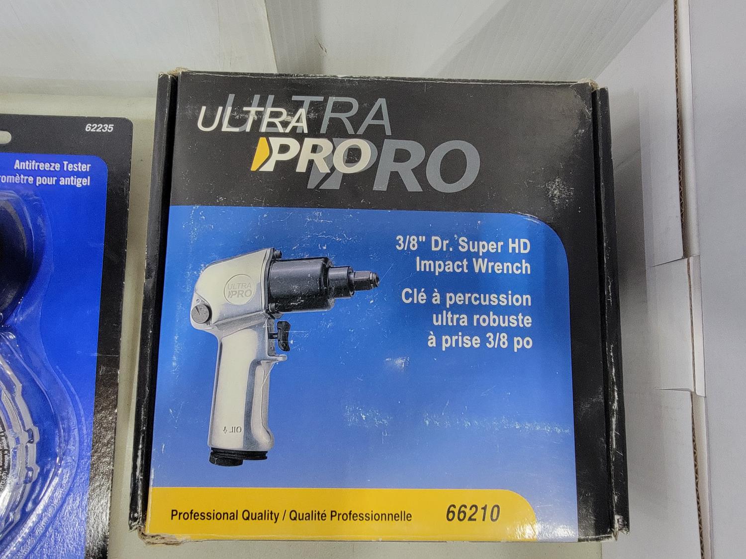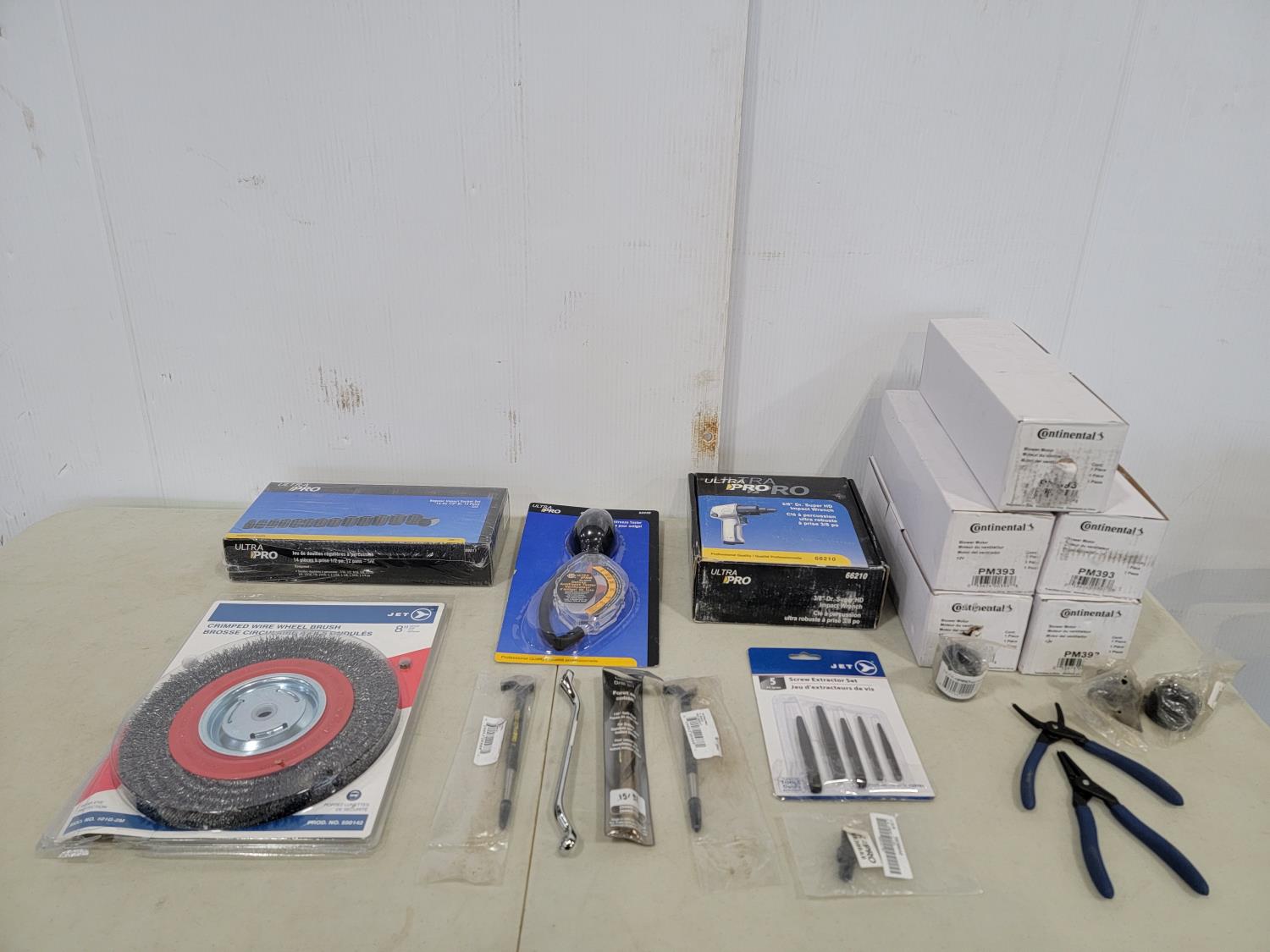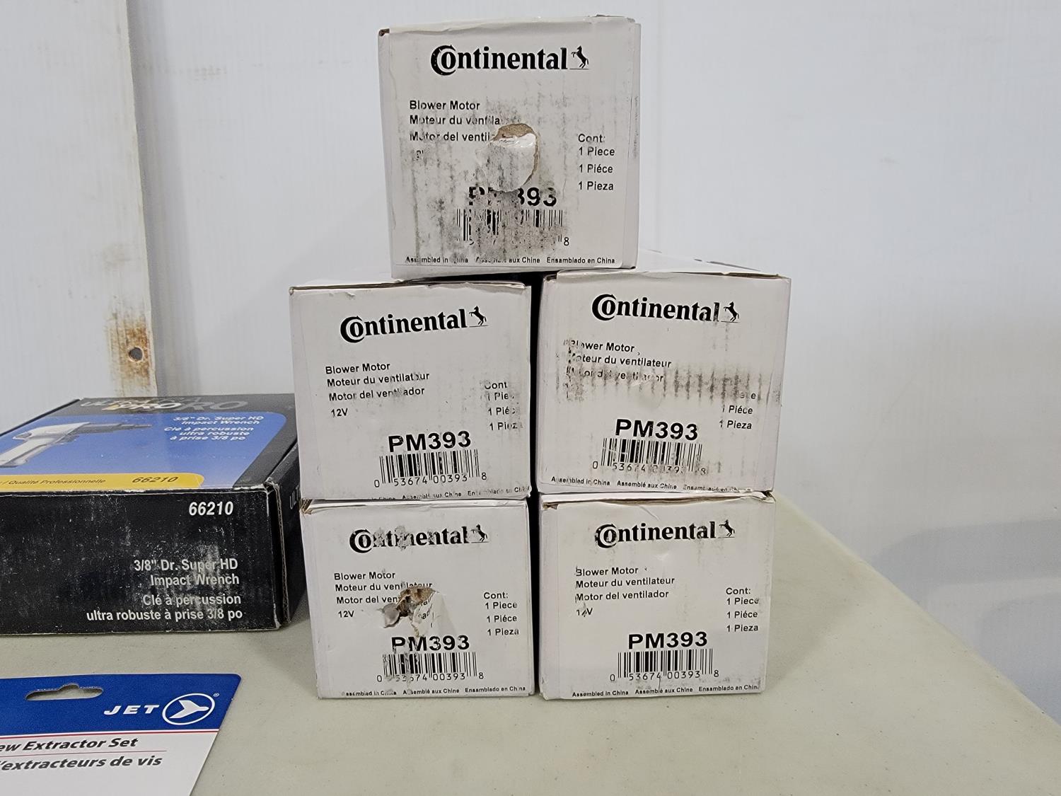 (5) Continental 12V blower motors, 3/8 inch drive super HD impact wrench, screw extractor set, 8 inch crimped wire wheel brush, 14 piece 1/2 inch drive impact socket set, antifreeze tester, hand tools