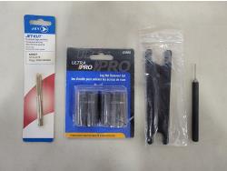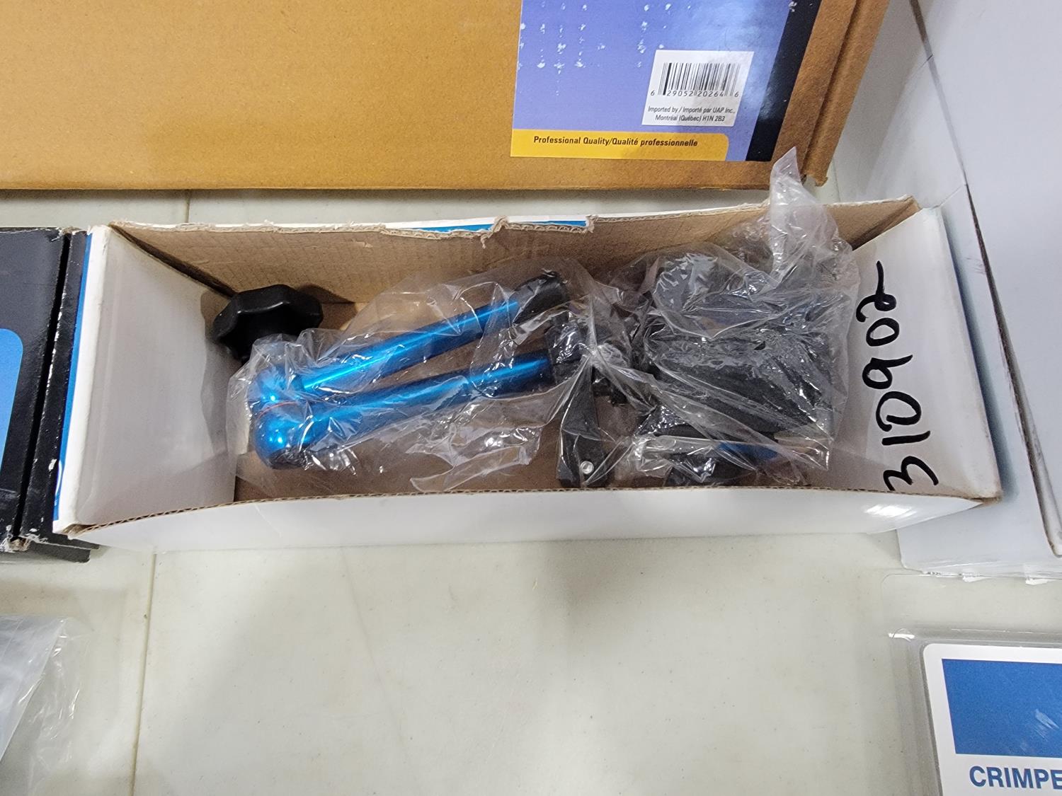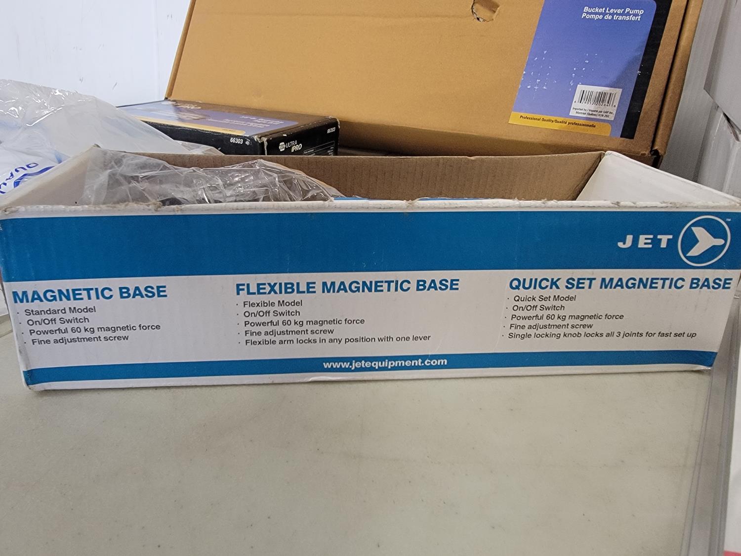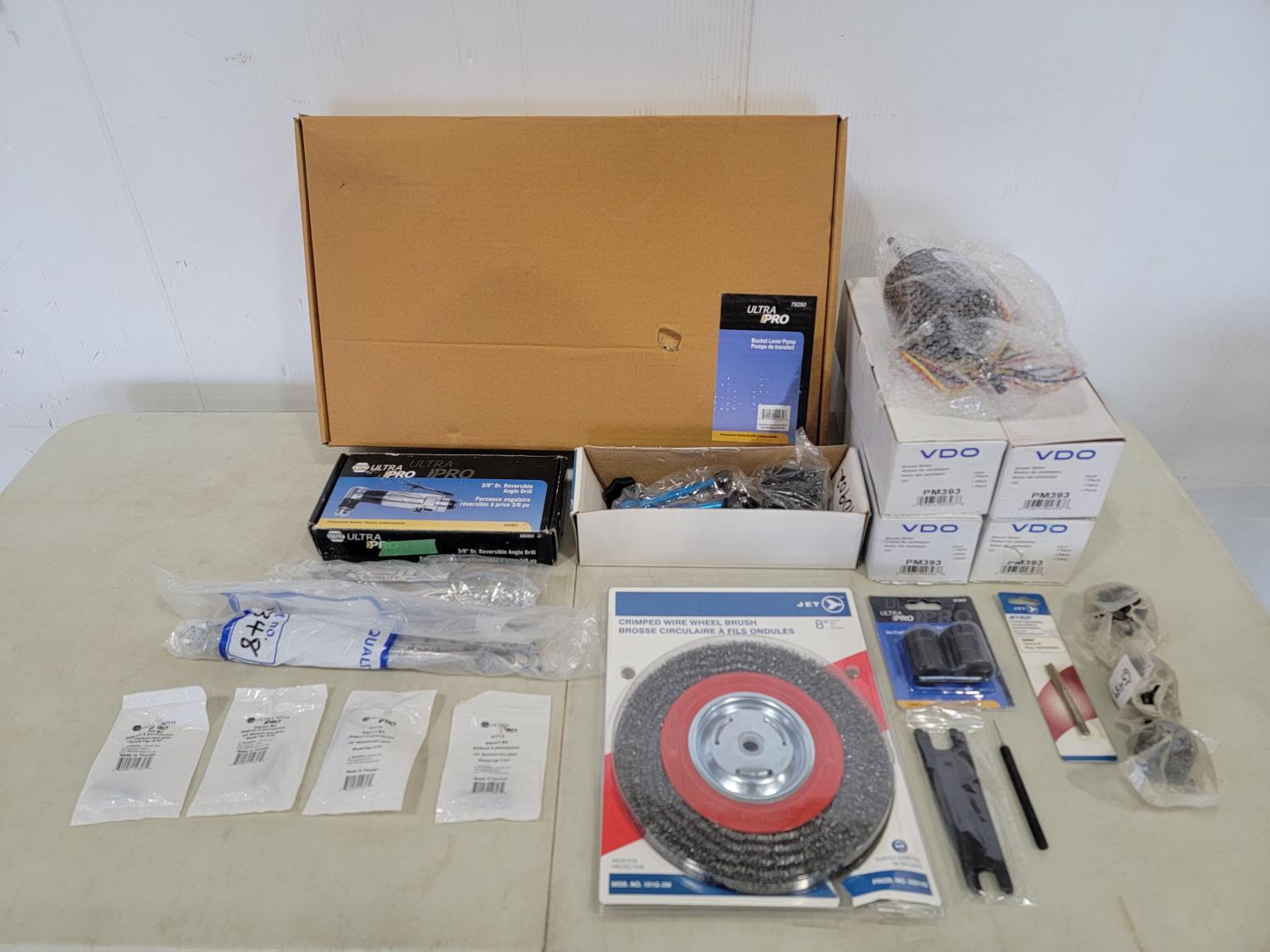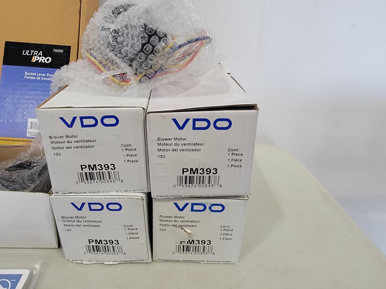 (5) 12V blower motors, 8 inch crimped wire wheel brush, flexible magnetic base, 3/8 inch drive reversible angle drill, impact bits, lug nut remover set, files, bucket lever pump