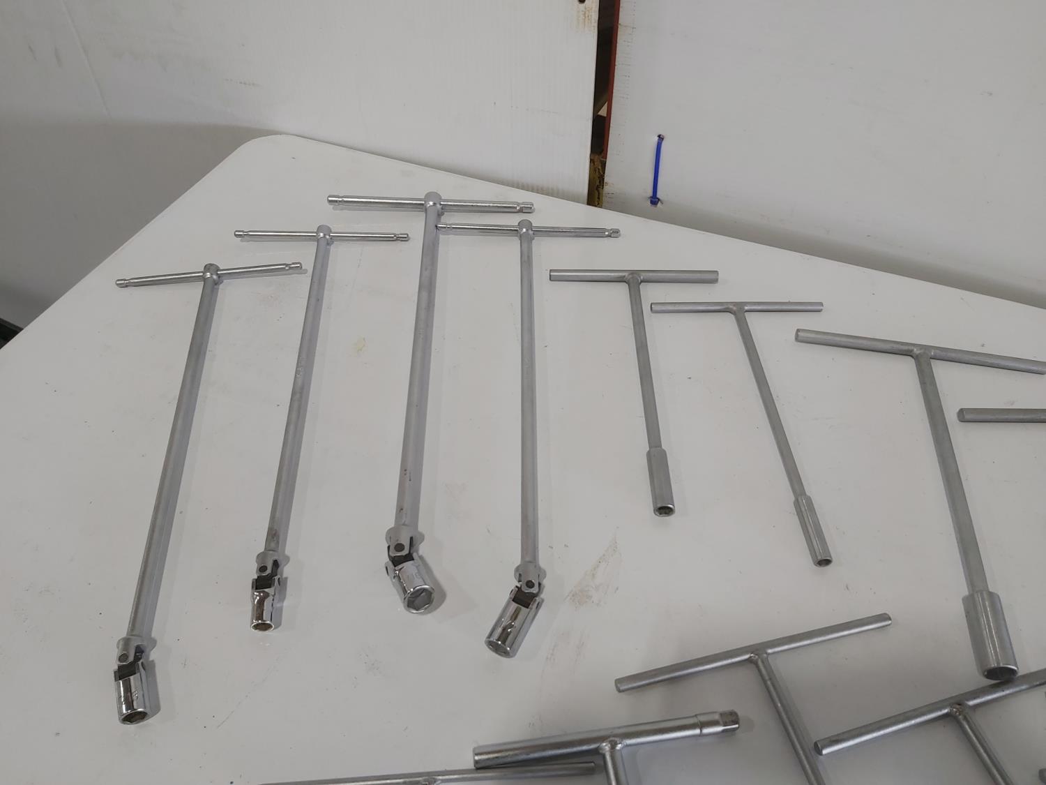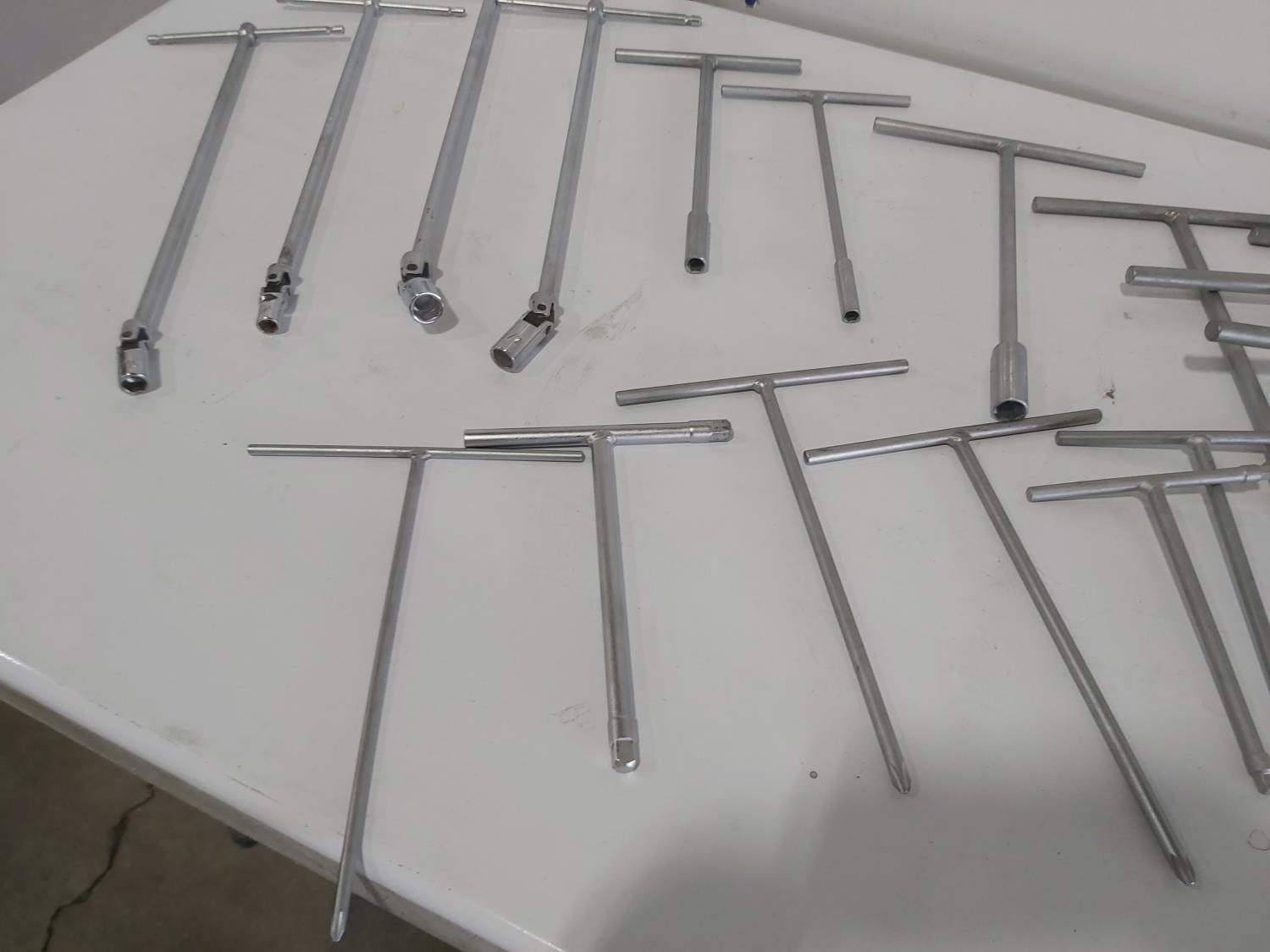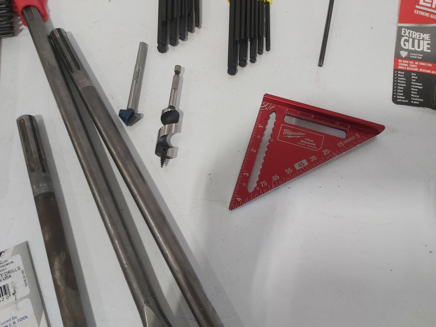 (17) T-handle socket wrenches and drivers, wire brush, Milwaukee 1 inch x 18 inch flat concrete chisel (unused), quick attach flat chisel, (2) sets of Allen keys