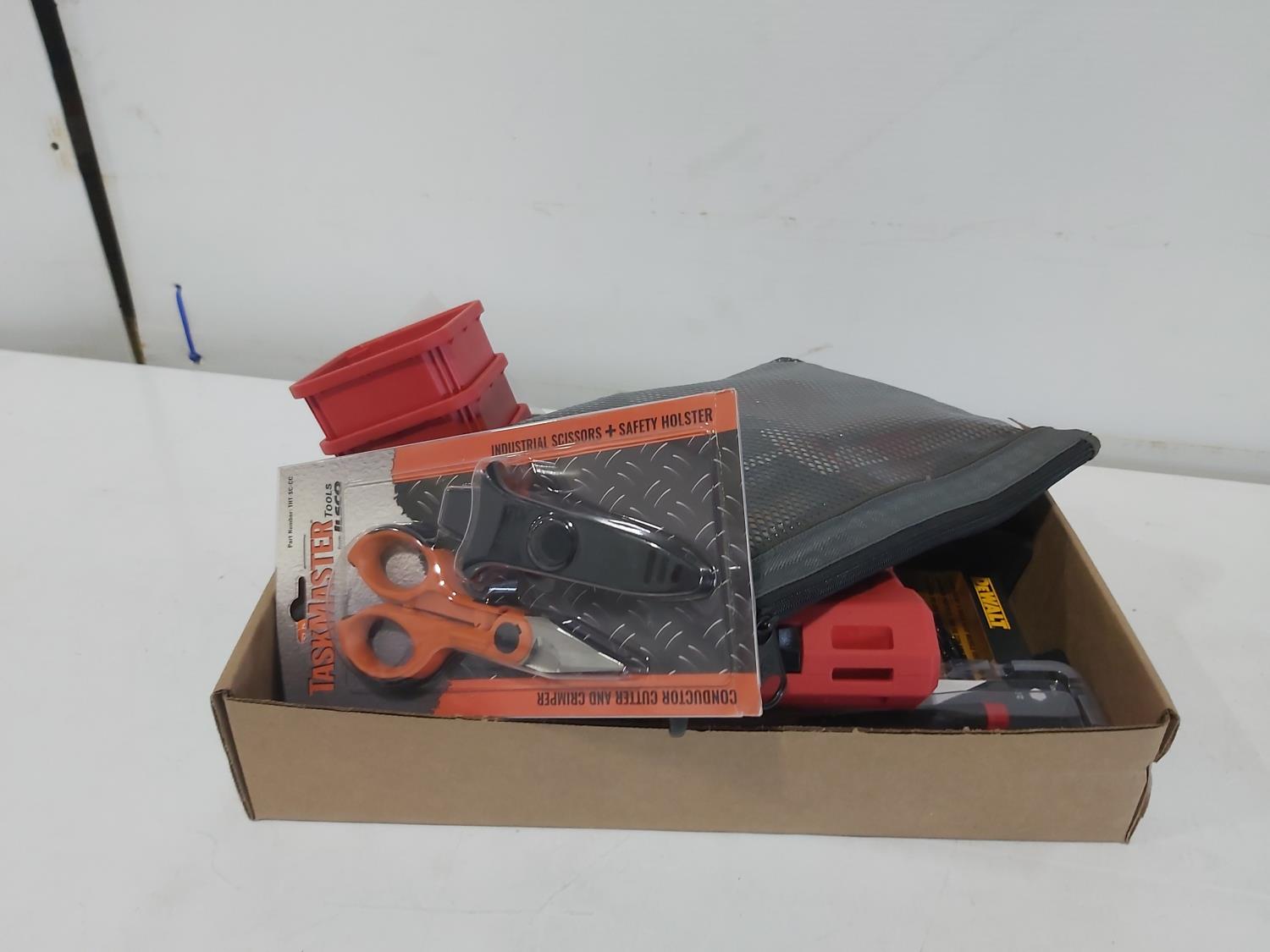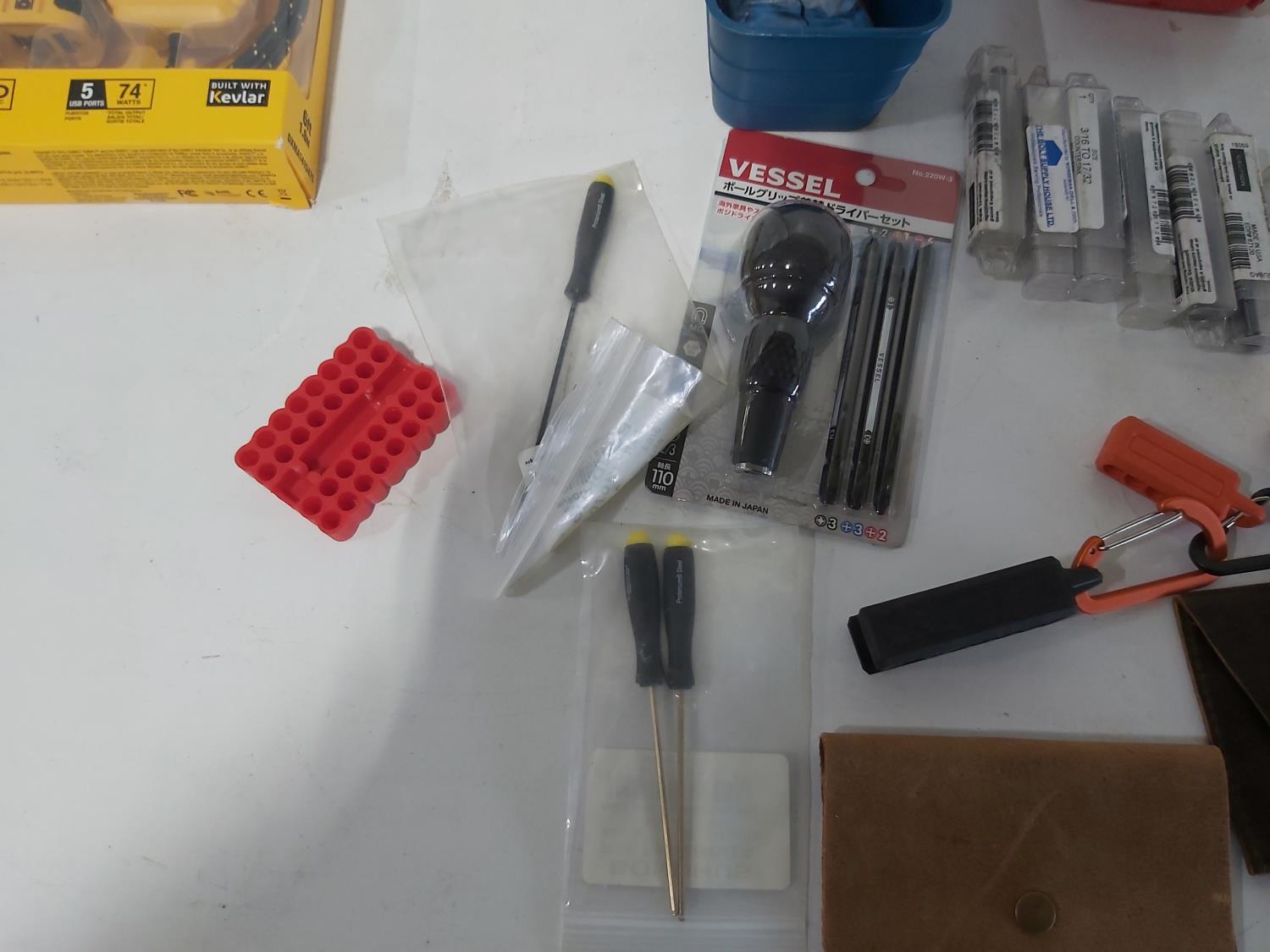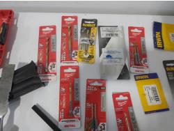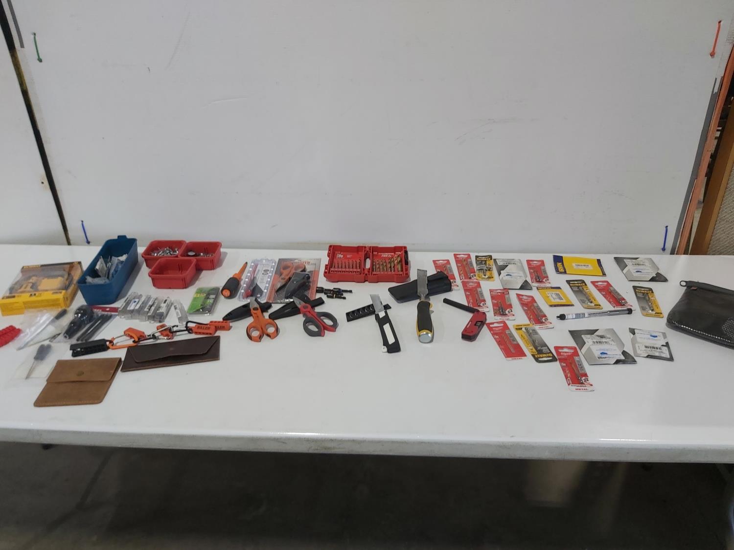 (3) industrial scissors, DeWalt mobile USB charger (usused), (2) wallets, (2) chisels, Steelman driver kit, vessel screwdriver kit (usused)