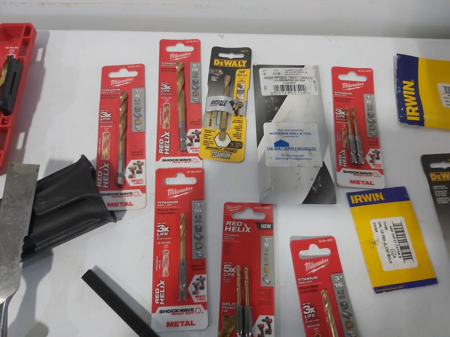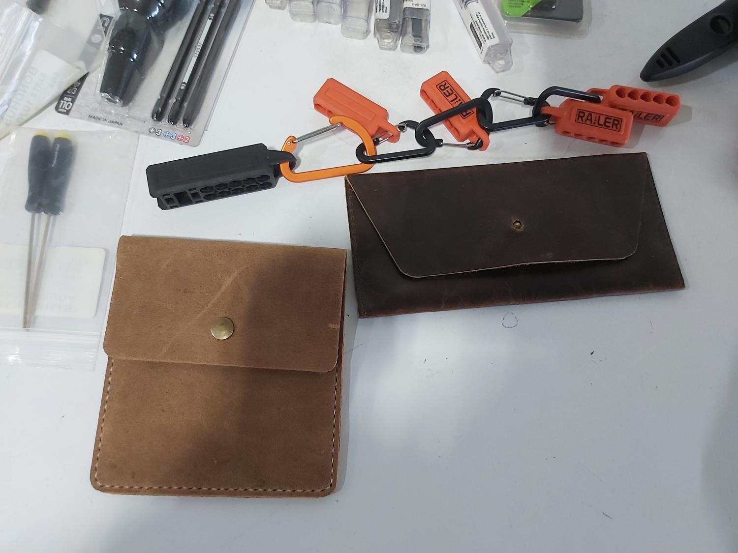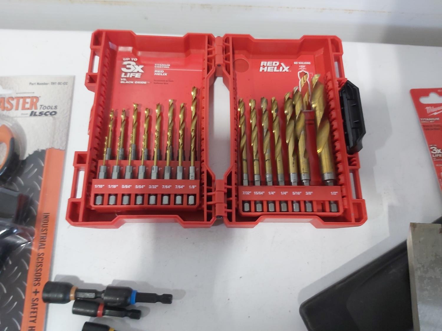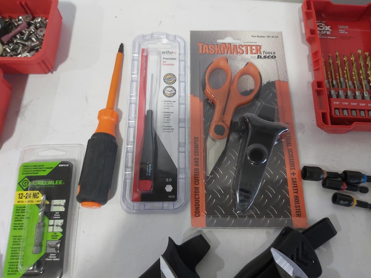 (3) industrial scissors, DeWalt mobile USB charger (usused), (2) wallets, (2) chisels, Steelman driver kit, vessel screwdriver kit (usused)