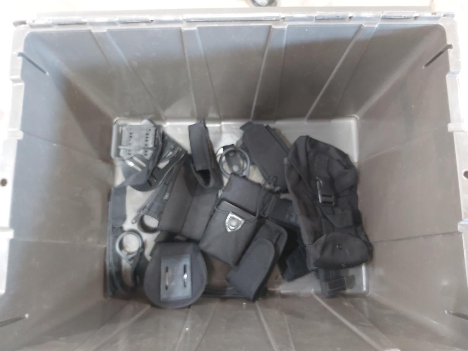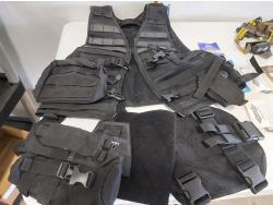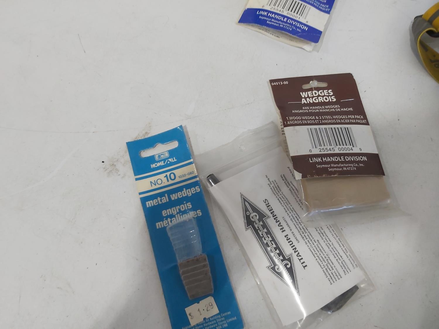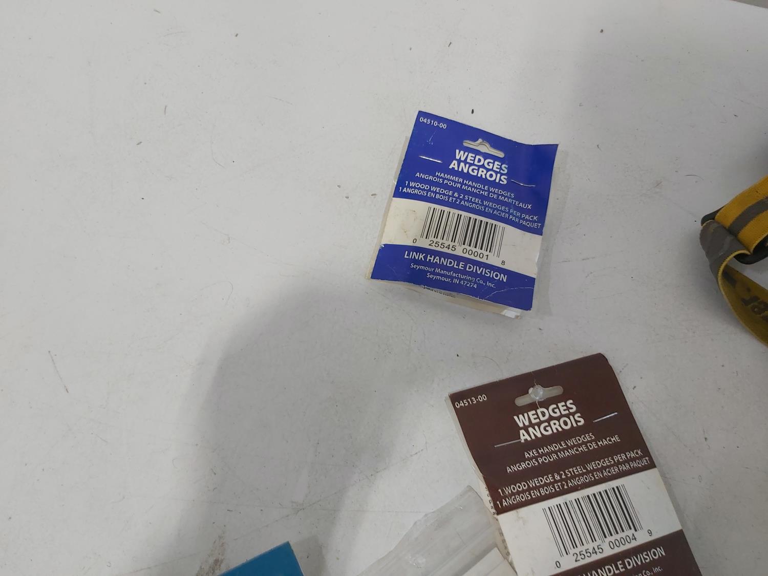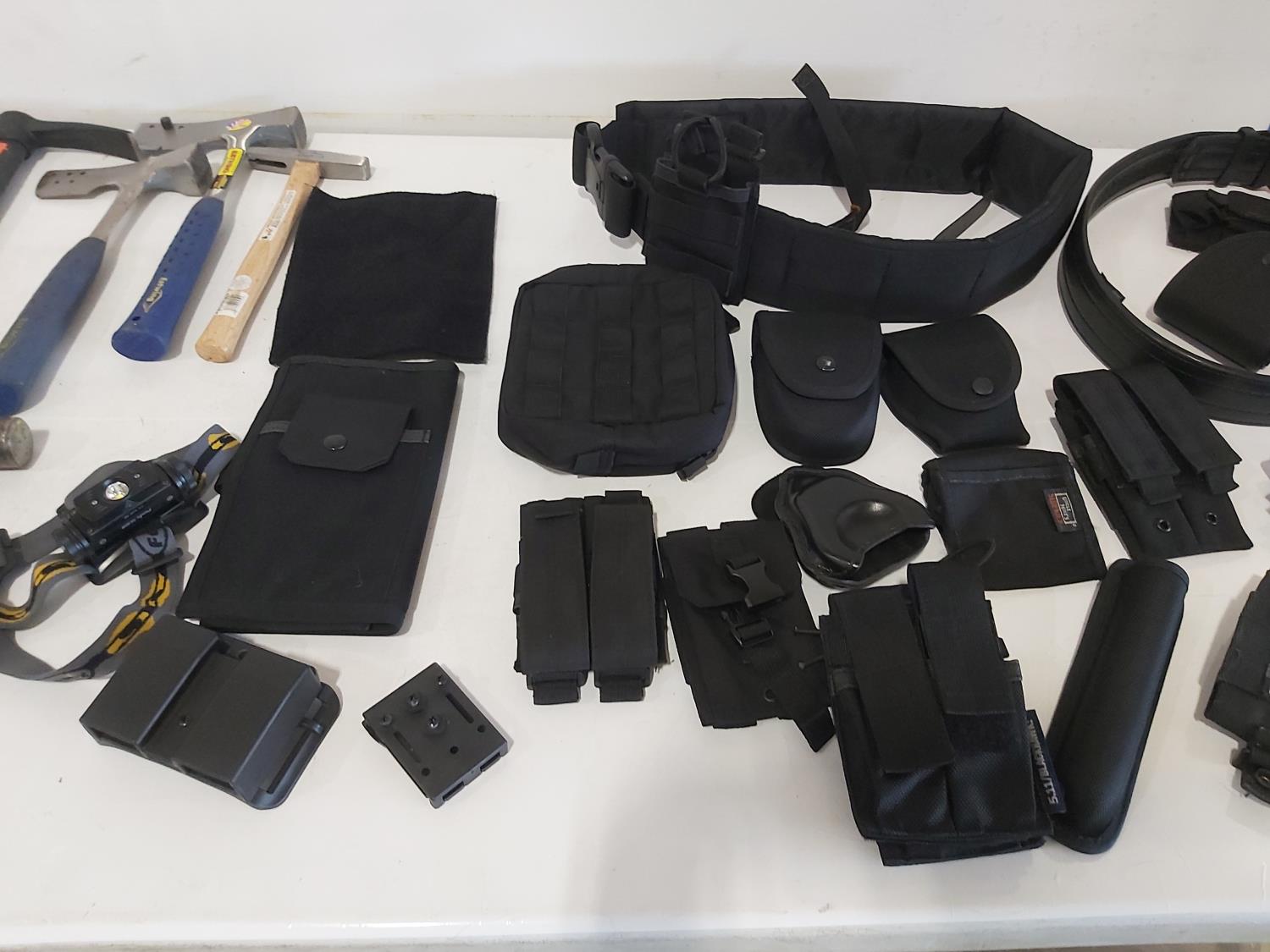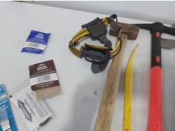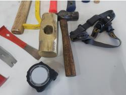 tool vest with attachments, (2) tool belts with attachments, hammers, axes, (2) headlamps, (3) lever scrapers, sledge hammer head, 16 ft measuring tape, axe head wedges, pry bar