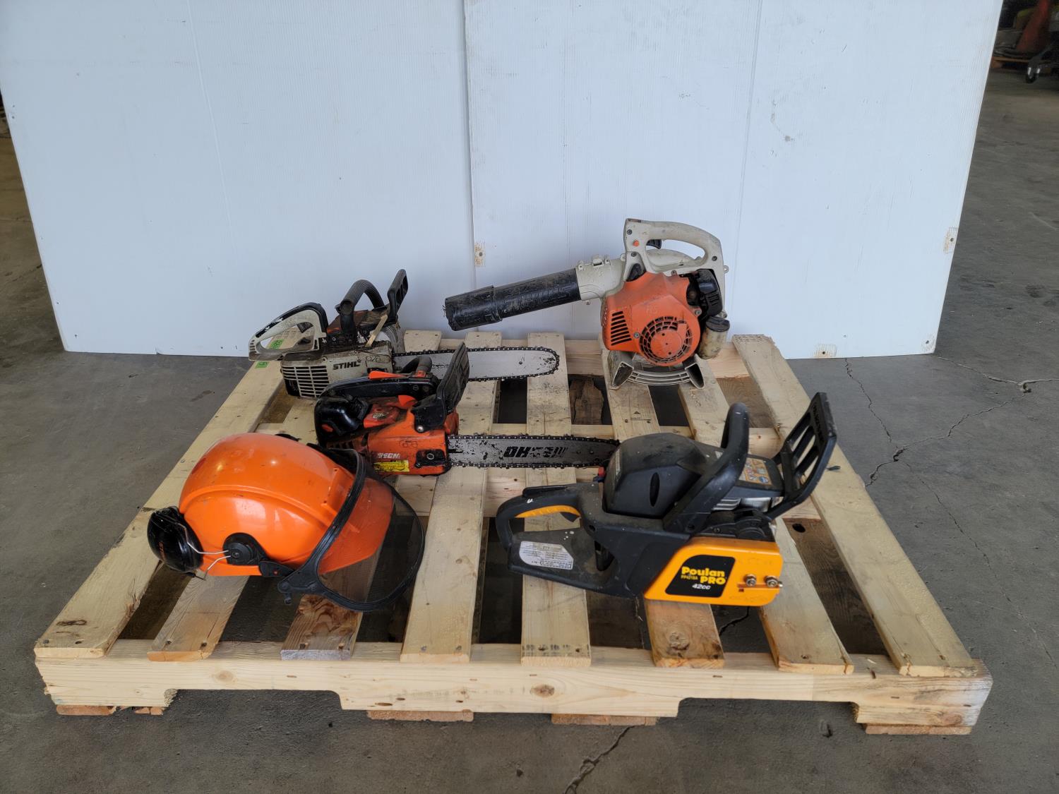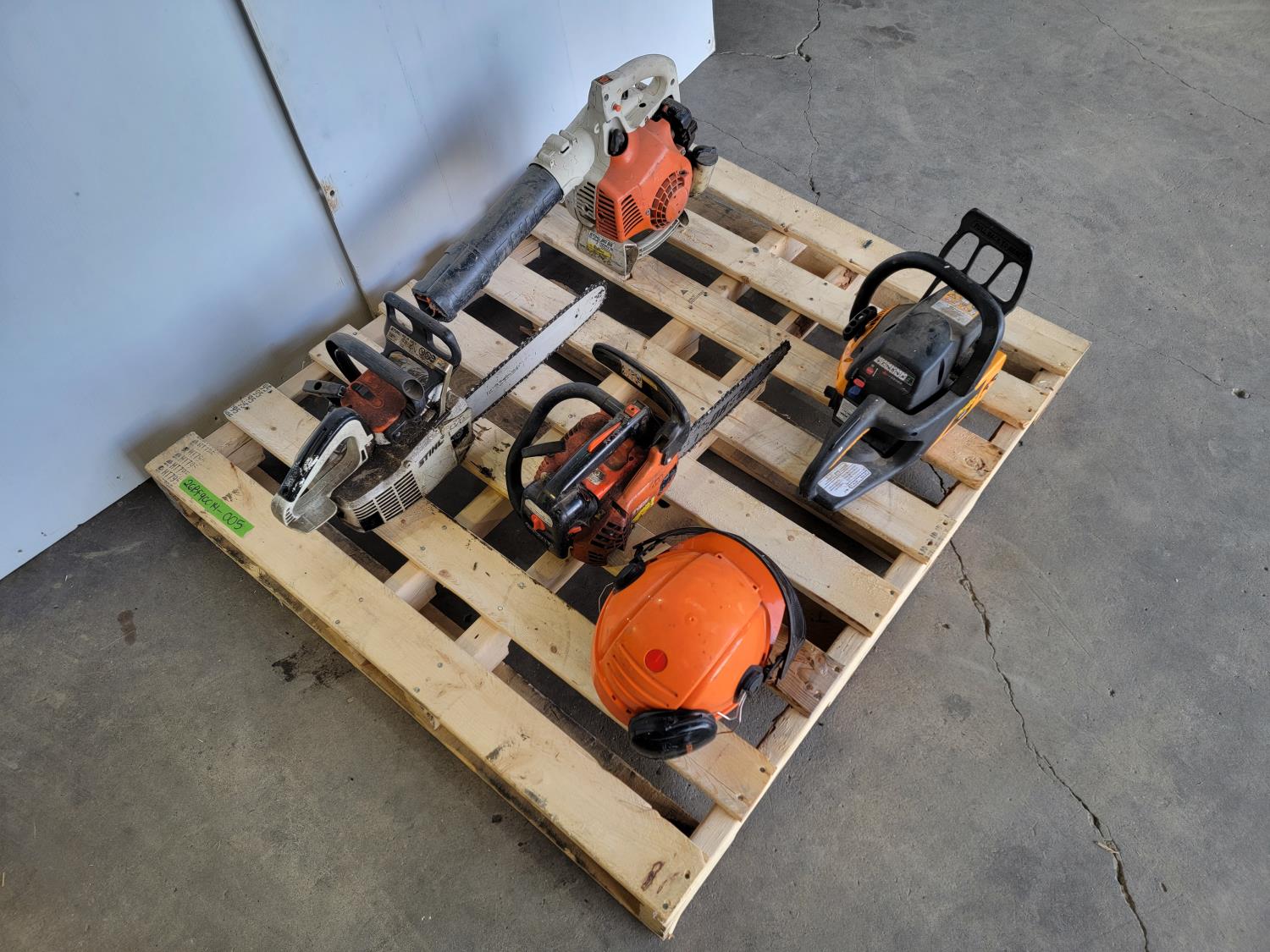 1198 Safety Helmet with Mesh Screen, Gas Blower and (3) Gas Chainsaws (Inoperable)