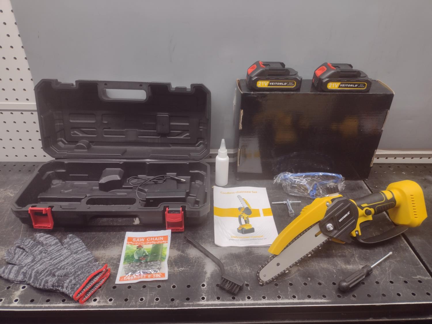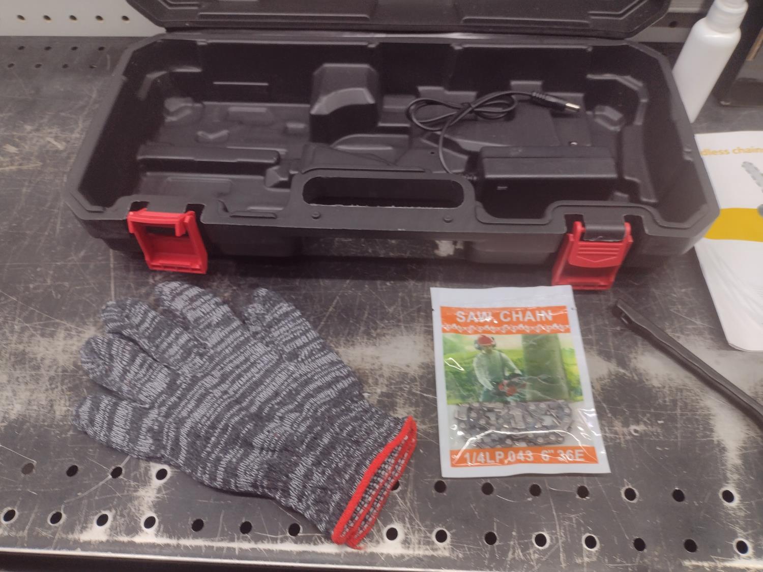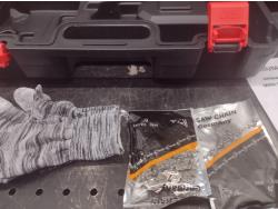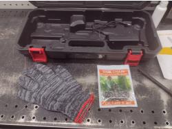 (2) chains, gloves, (2) batteries, charger, case & accessories