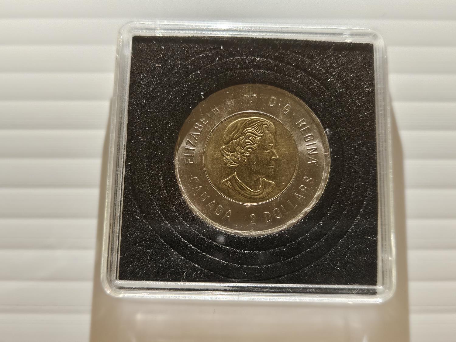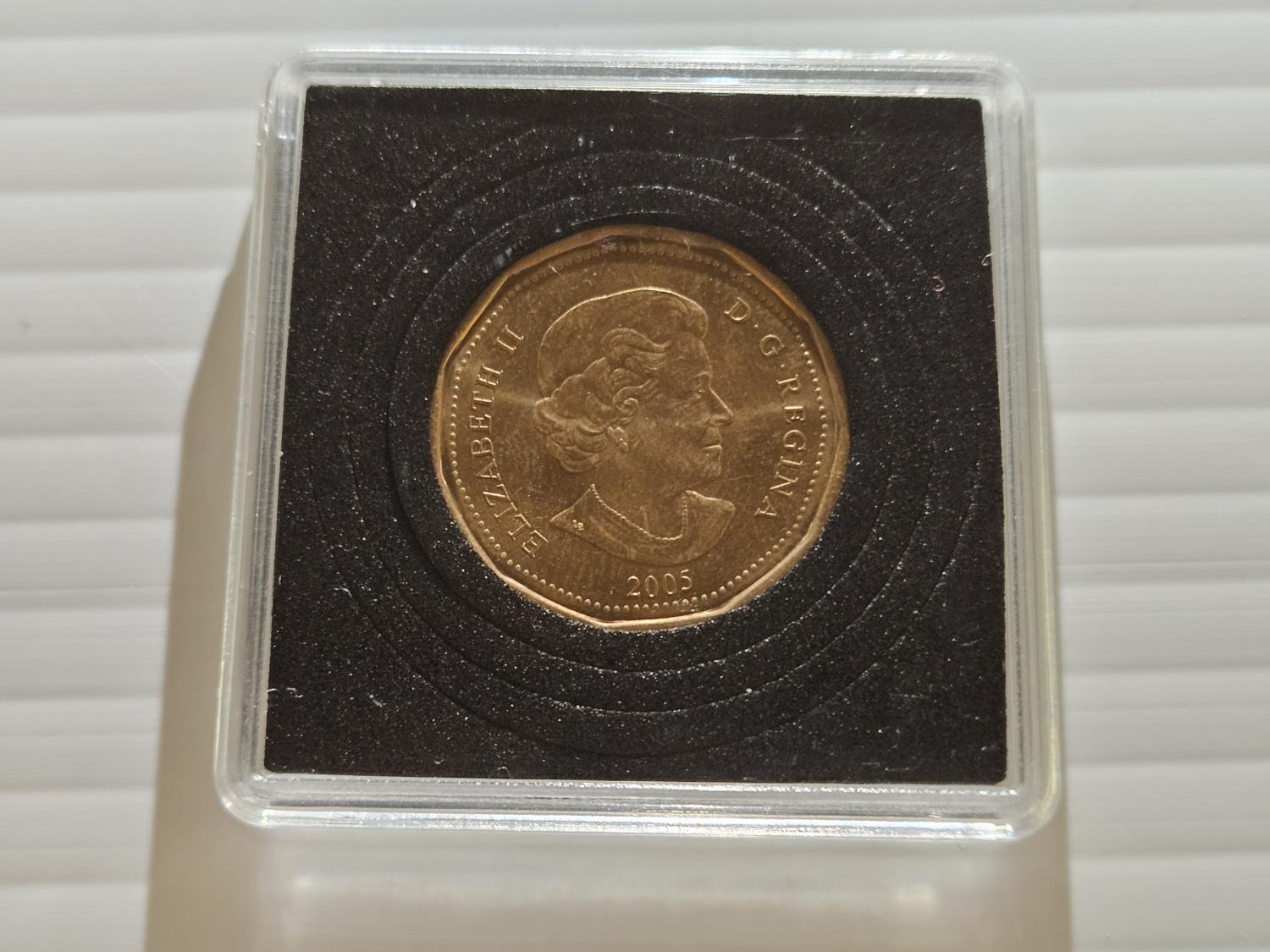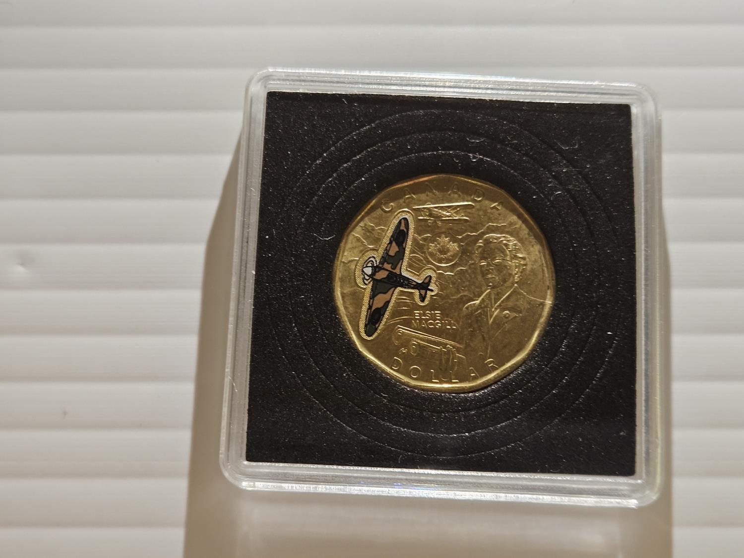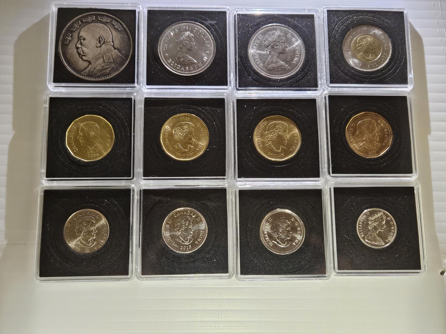 includes (1) large Chinese coin, (6) $1 Canadian coins, (1) $2 Canadian coin, (3) Canadian $0.25 coins, (1) $0.05 Canadian coin
