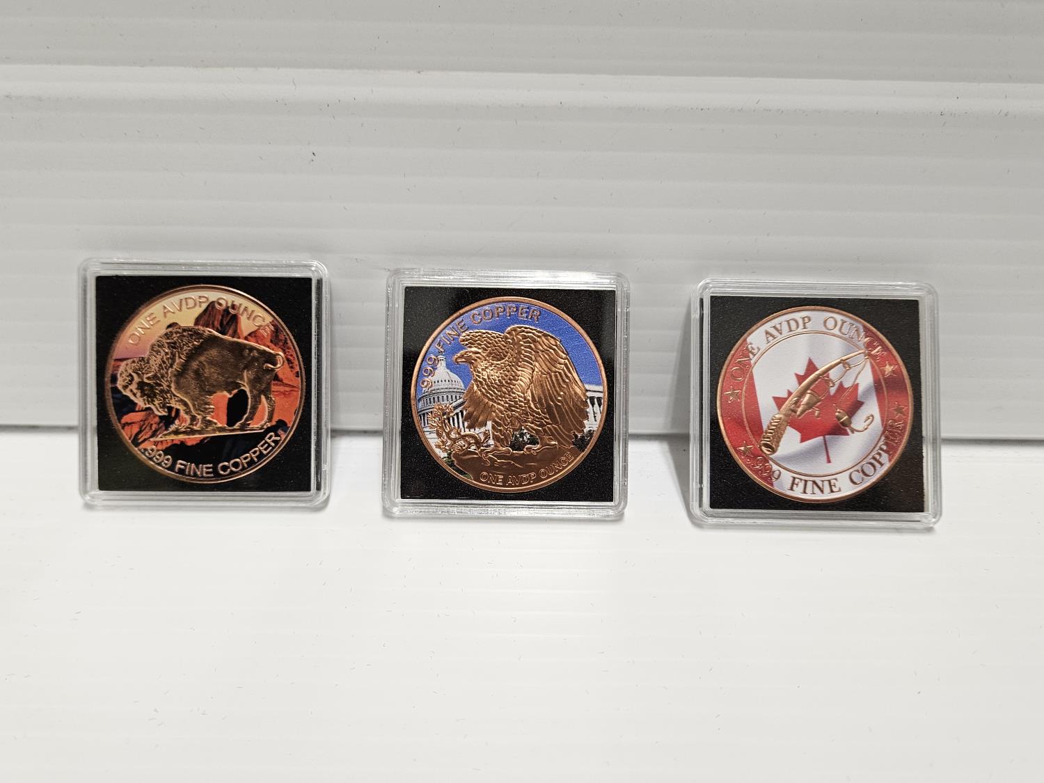 includes (1) USA buffalo coin, (1) USA liberty coin, (1) Canada steelhead coin