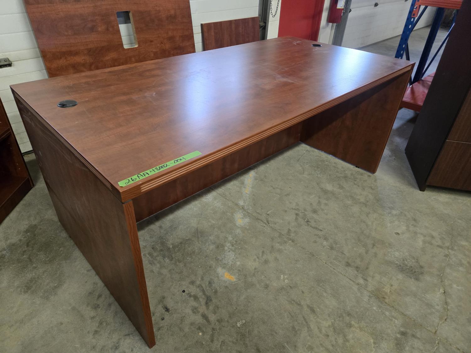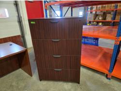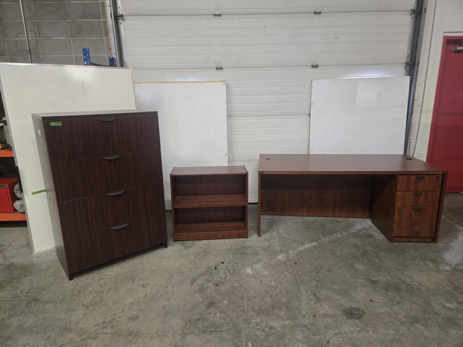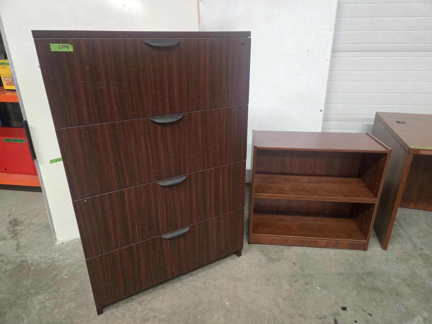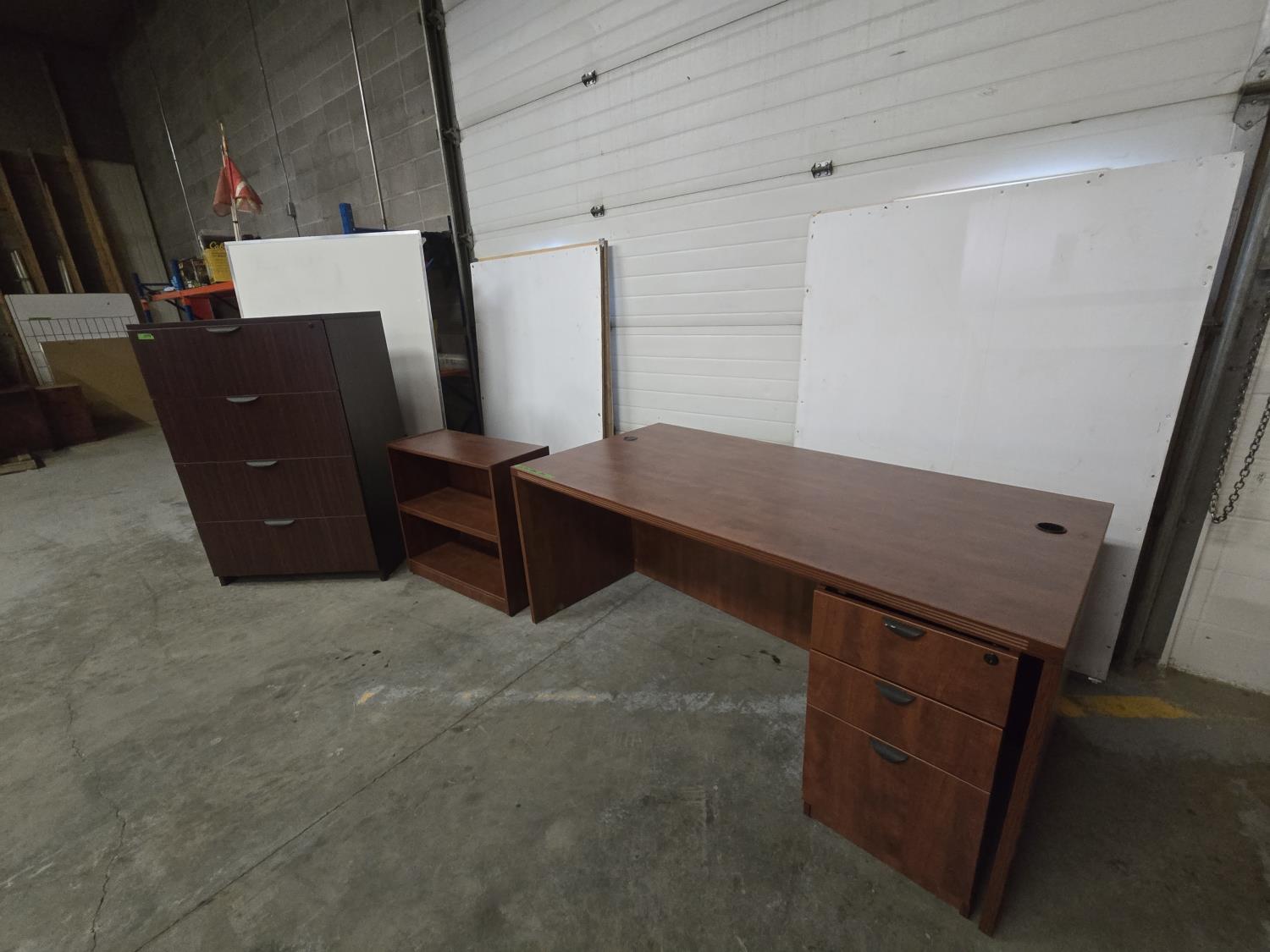 35.5 inch X 71 inch desk, 36 inch wide X 22 inch deep X 54 inch high filing cabinet, 15.5 inch X 22 inch under desk filing cabinet, 13.5 inch deep X 31.5 inch wide X 29 inch high shelf unit (missing shelves)