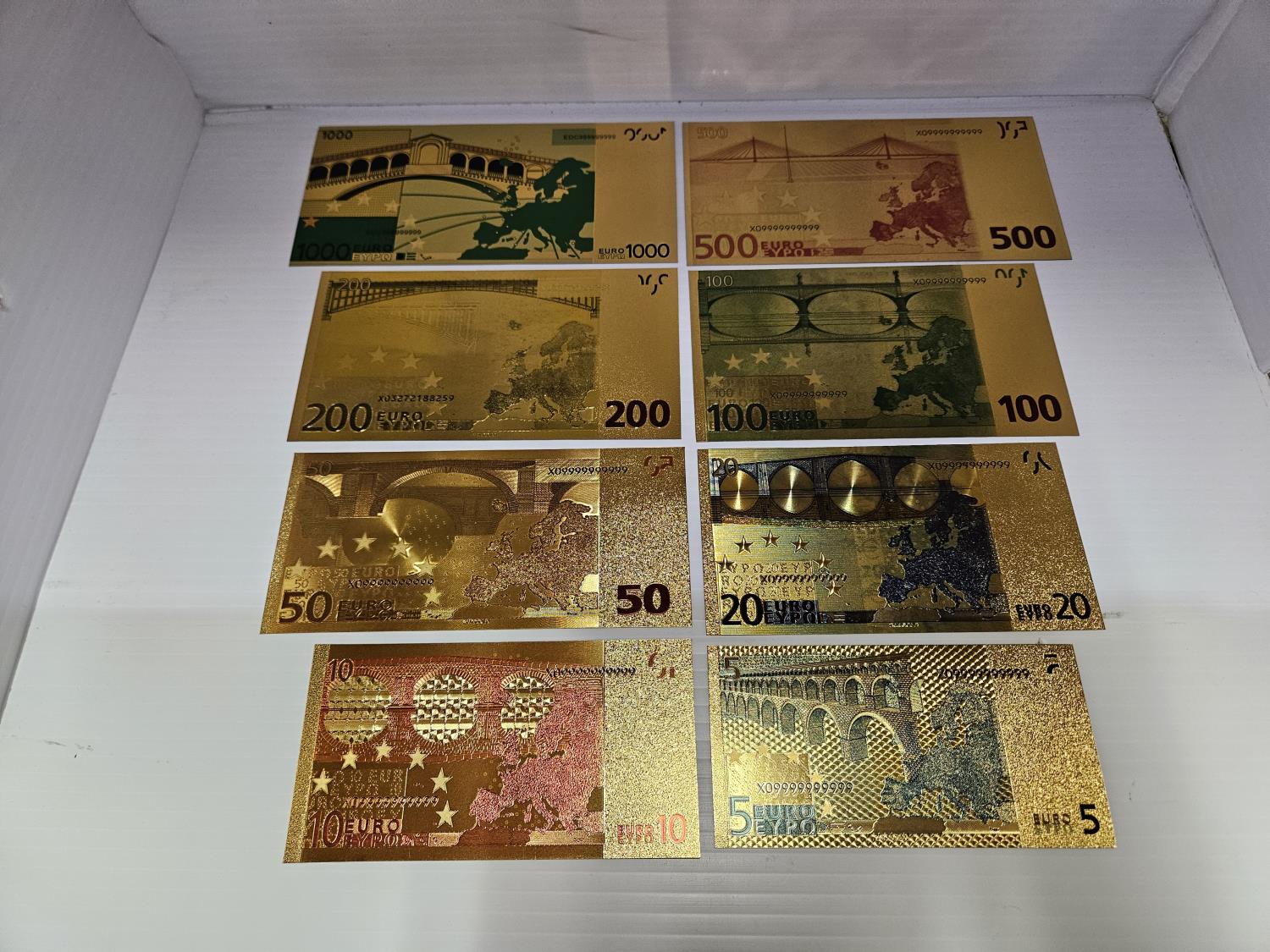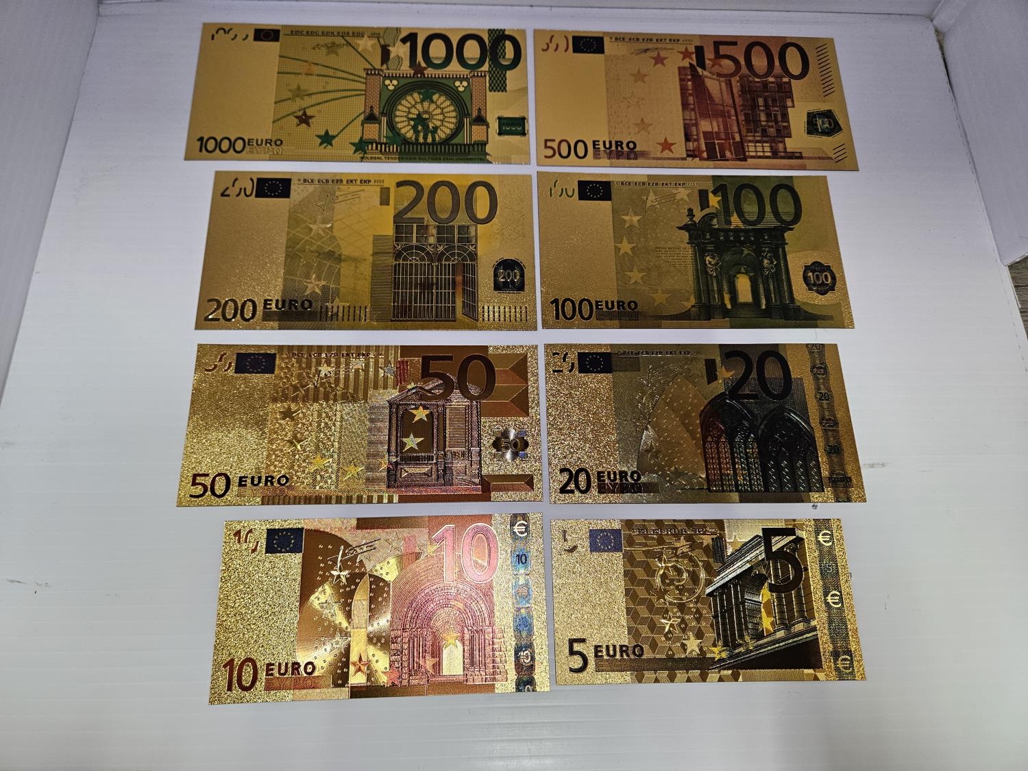 includes 1000, 500, 200, 100, 50, 20, 10, 5 euro notes