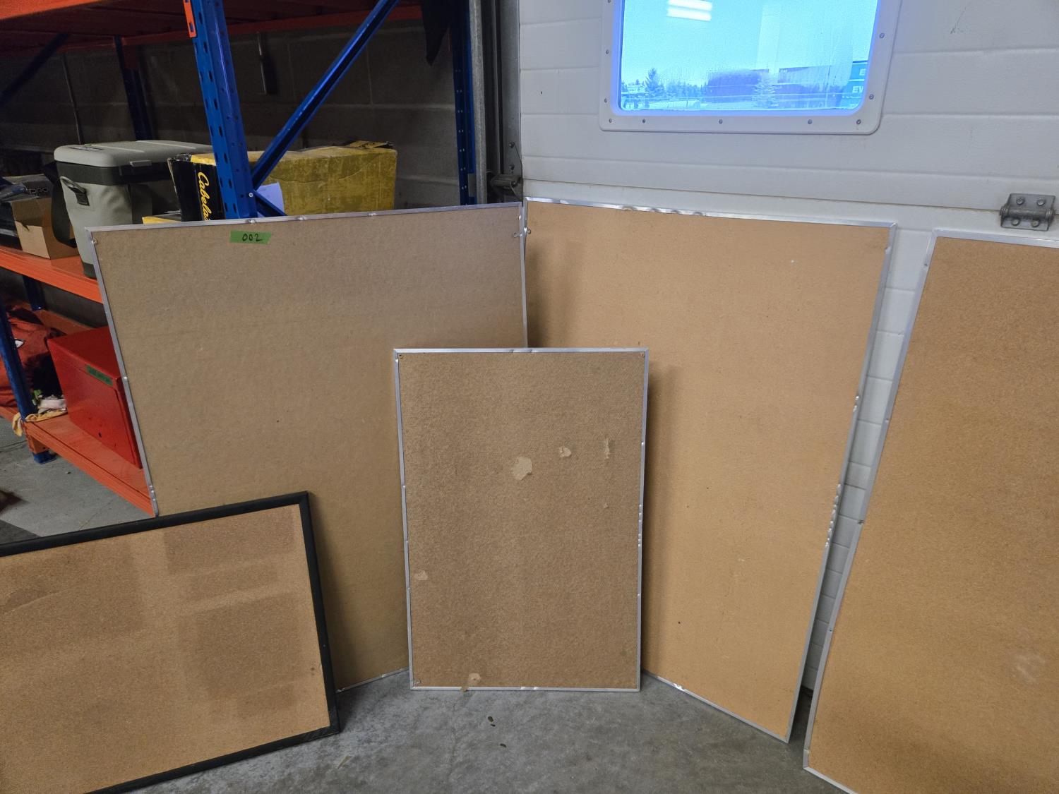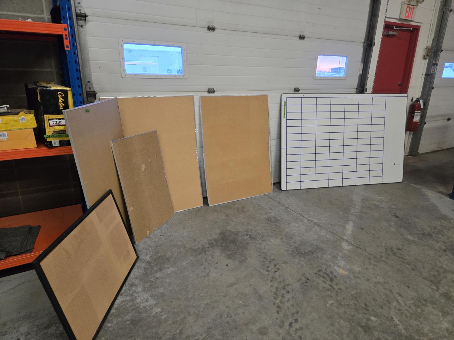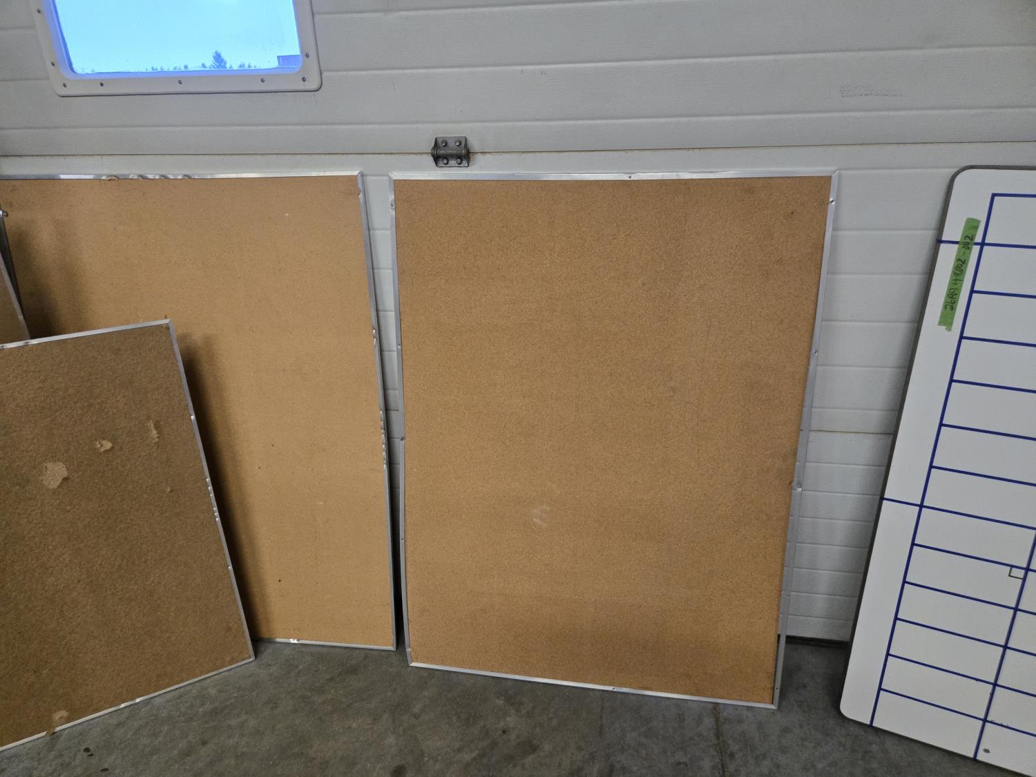 48 inch X 72 inch white board, (2) 24 inch X 36 inch & (3) 36 inch X 48 inch cork boards