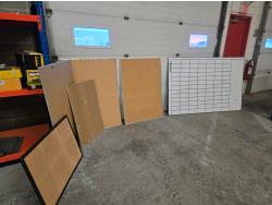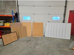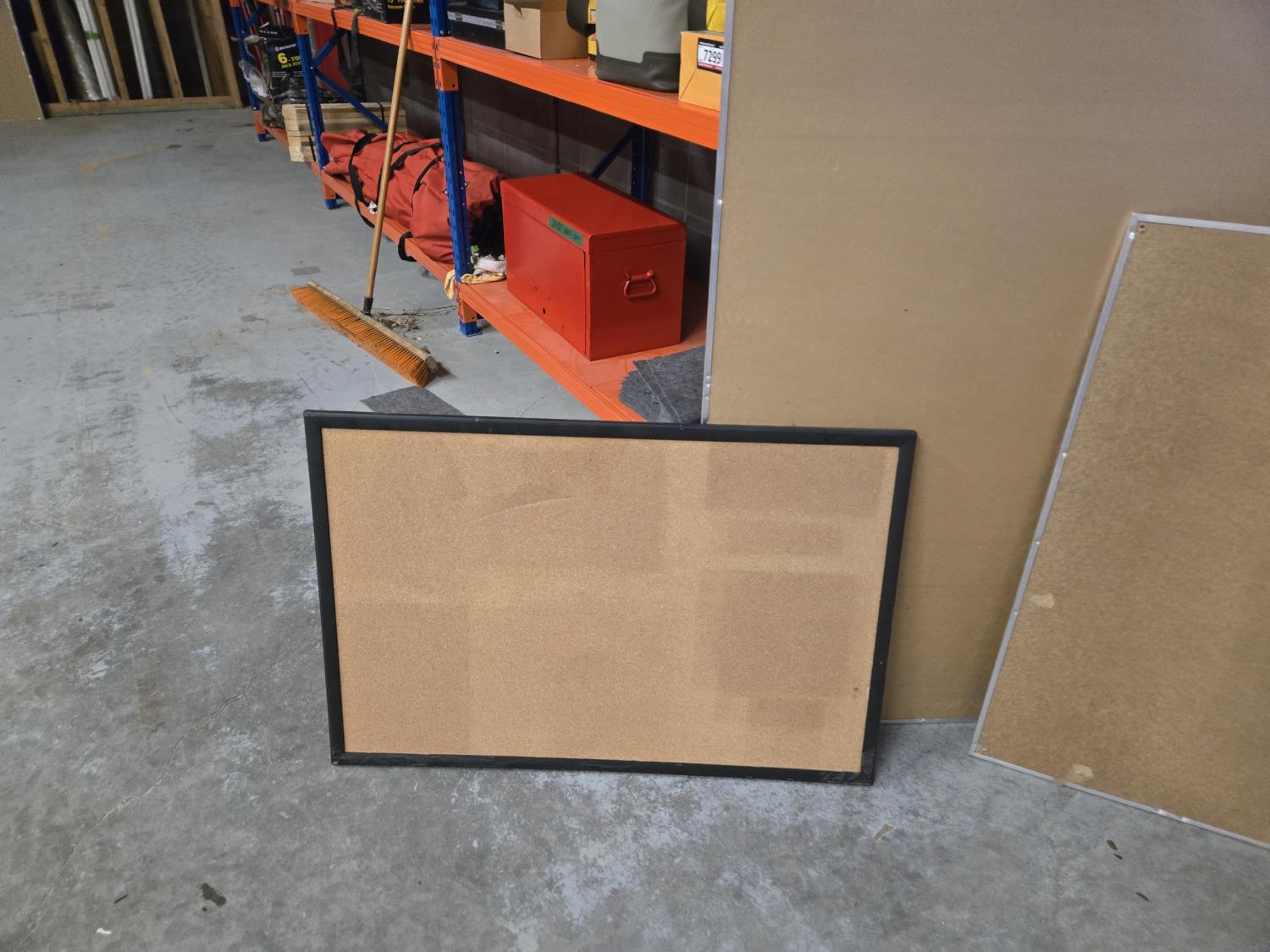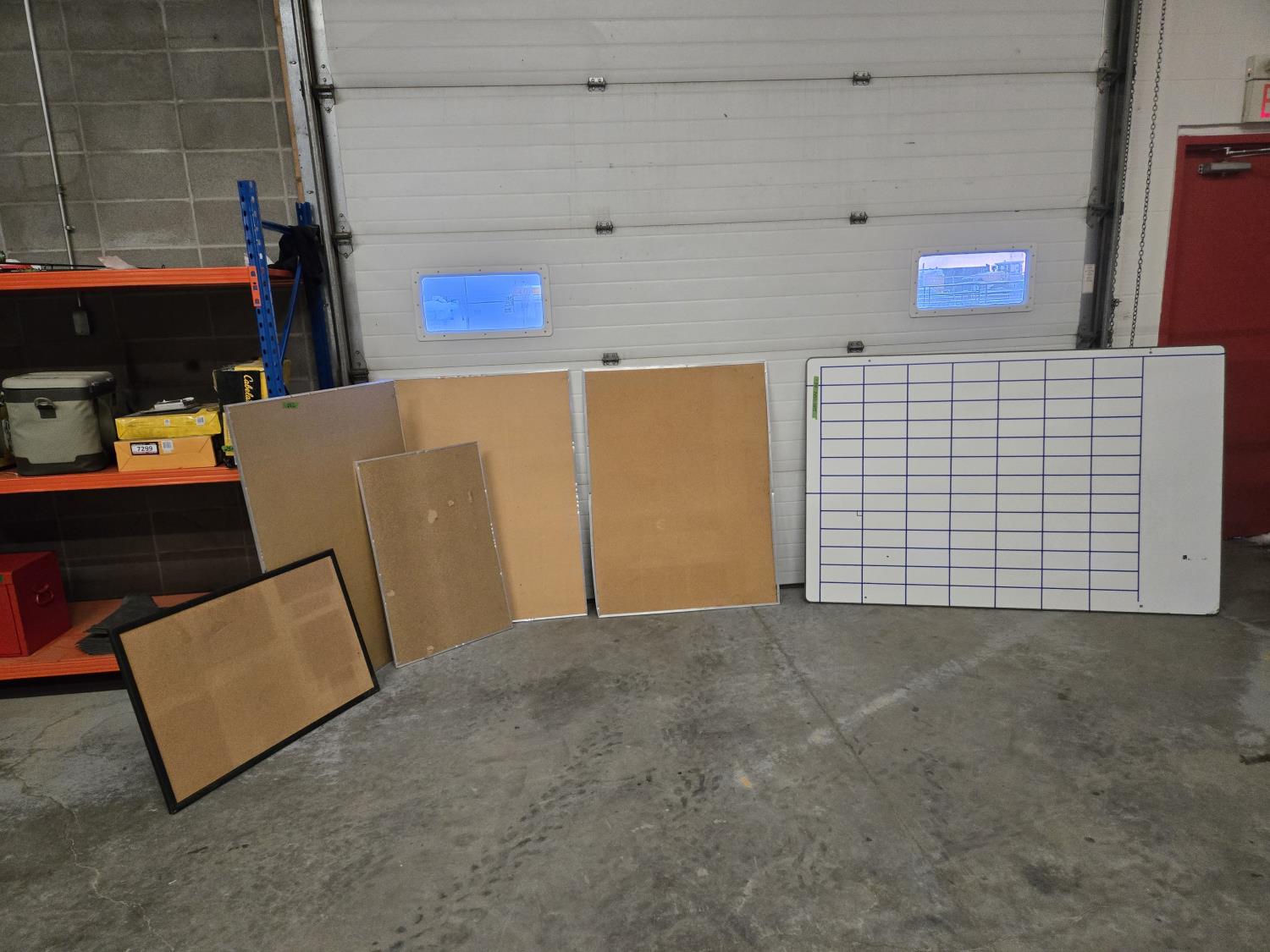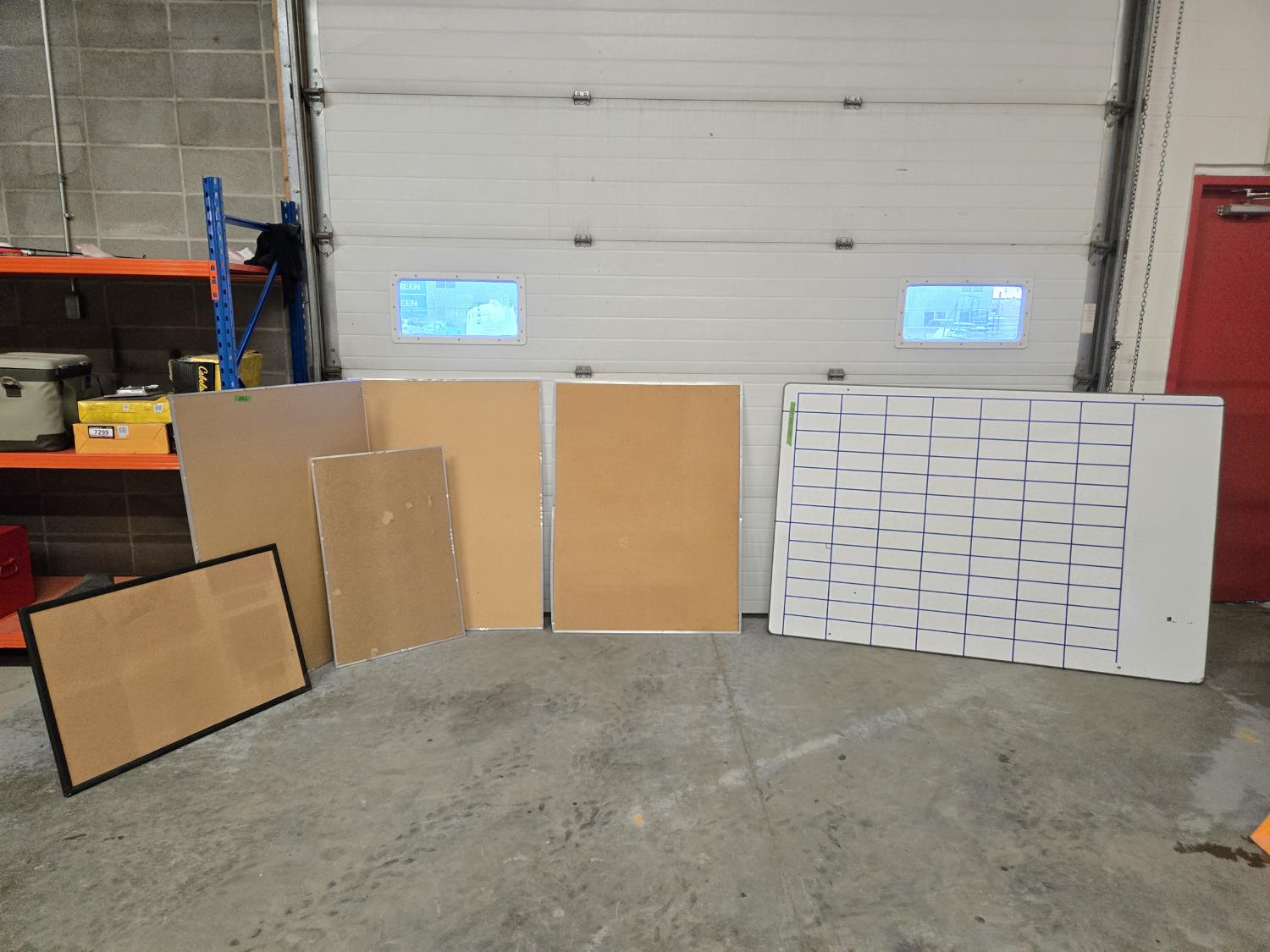 48 inch X 72 inch white board, (2) 24 inch X 36 inch & (3) 36 inch X 48 inch cork boards