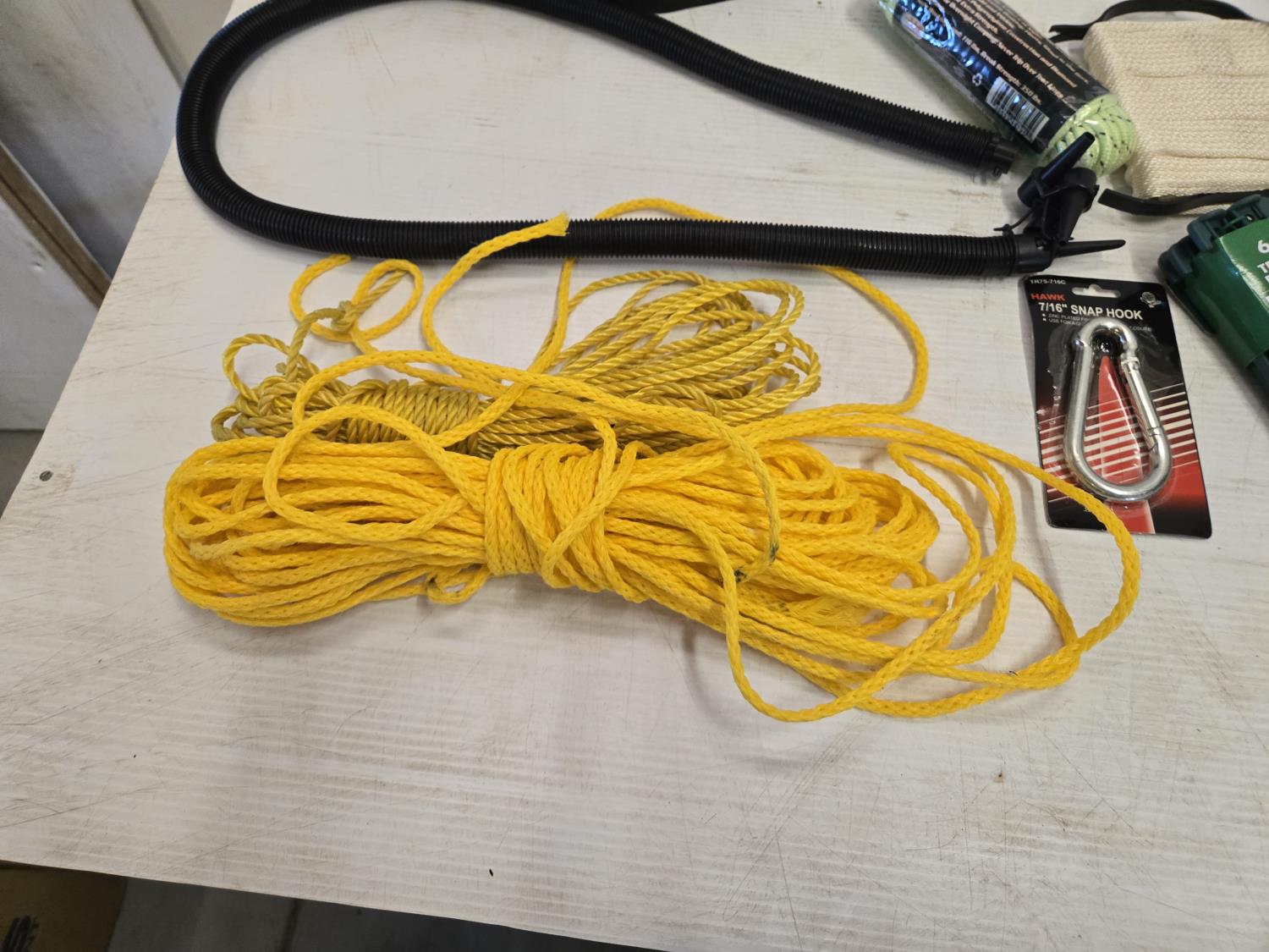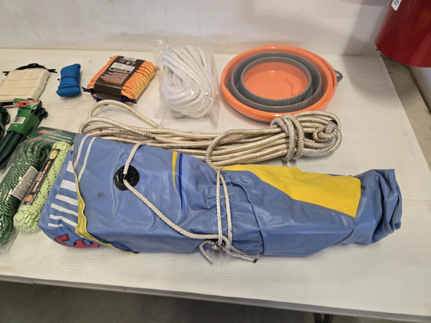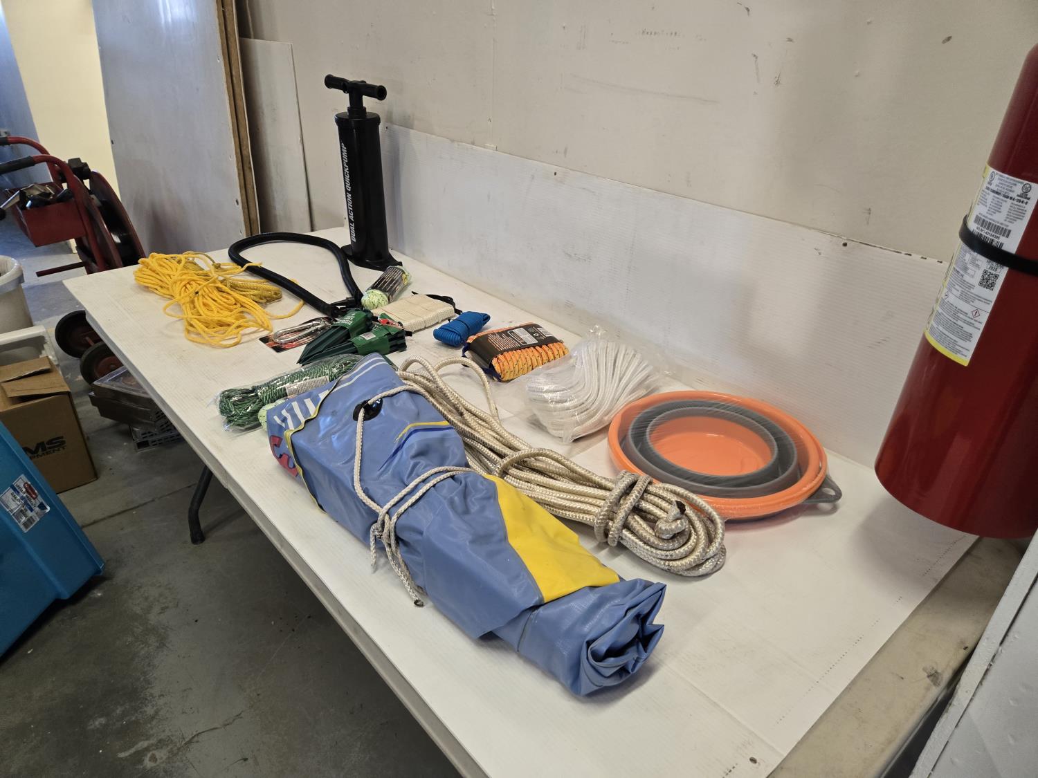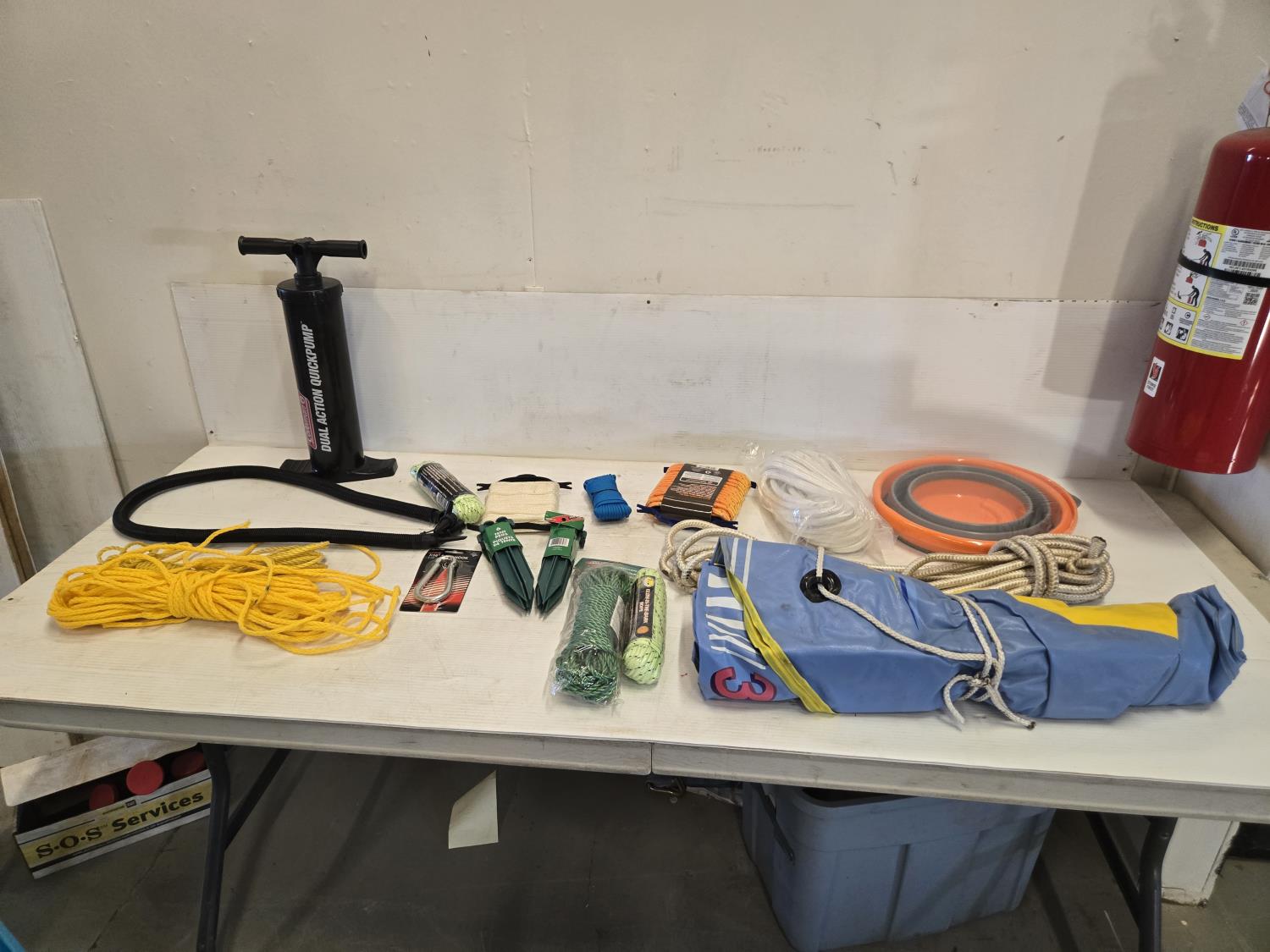 hand pump, qty of various ropes, dingy, collapsible bucket, tent pegs, miscellaneous items