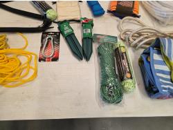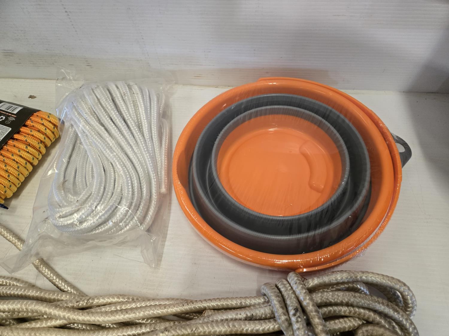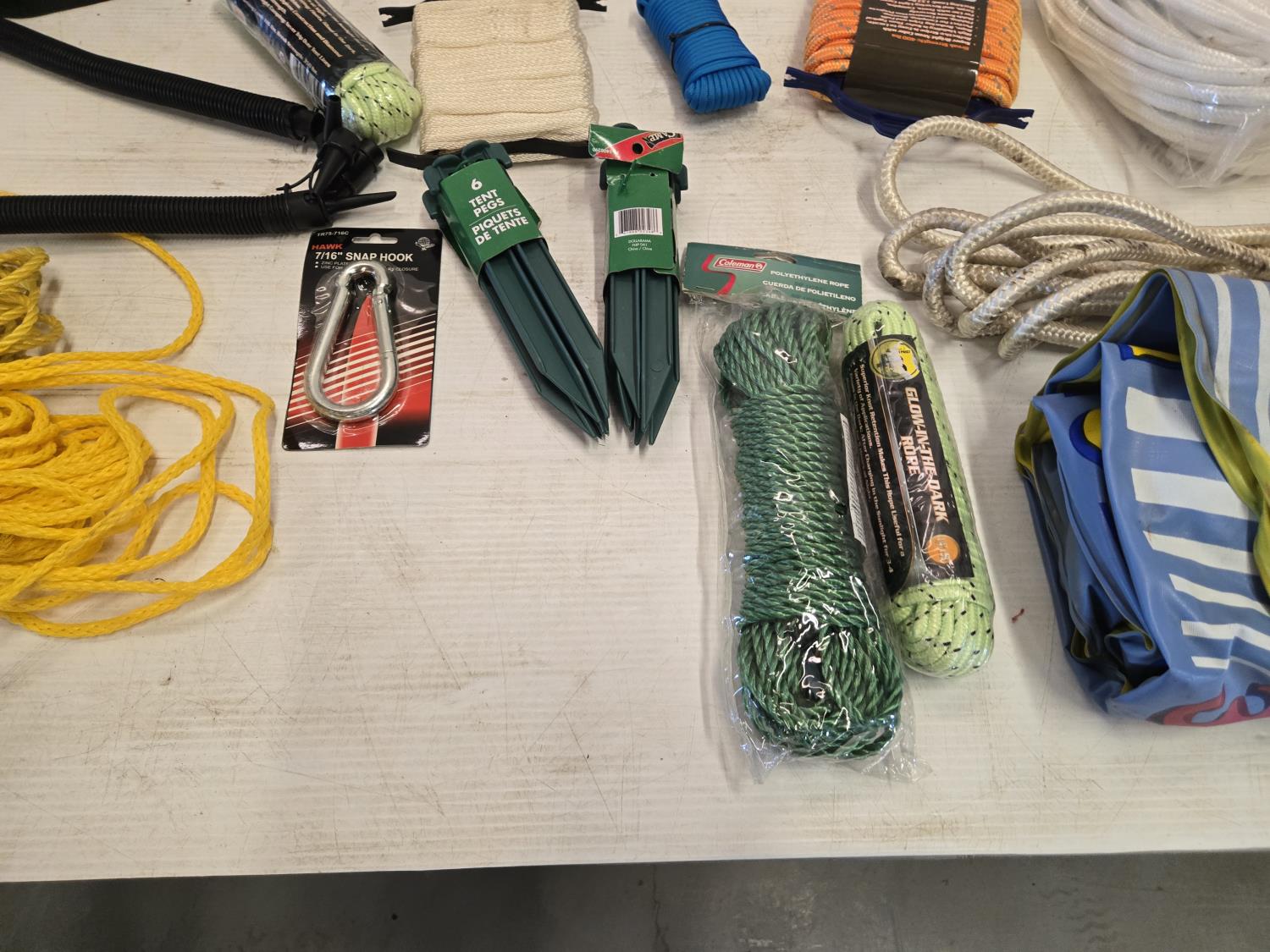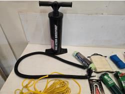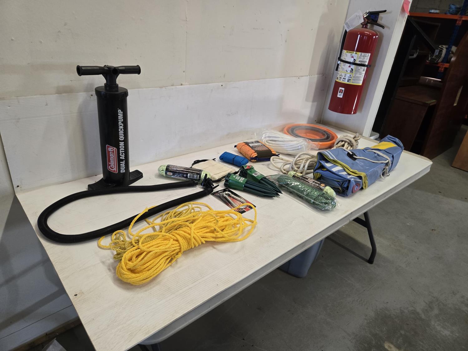 hand pump, qty of various ropes, dingy, collapsible bucket, tent pegs, miscellaneous items