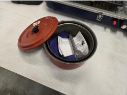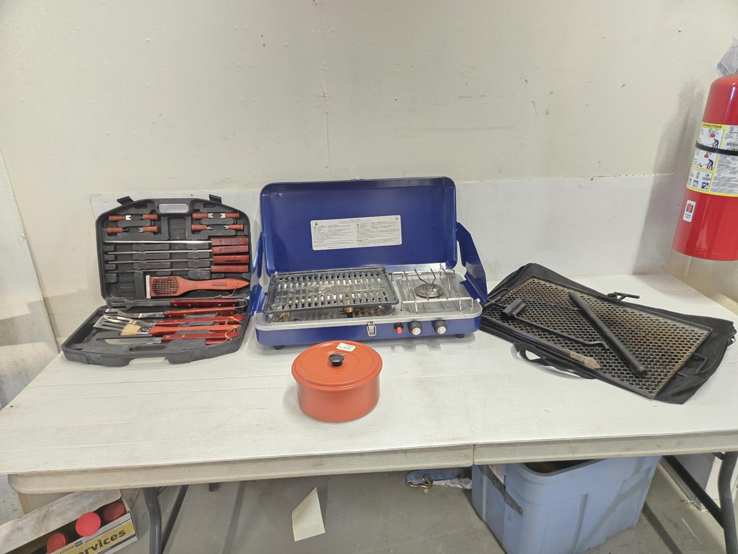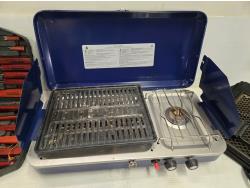 includes Woods 2 burner propane camp stove, (2) pot set, BBQ utensil set, over fire grill