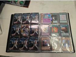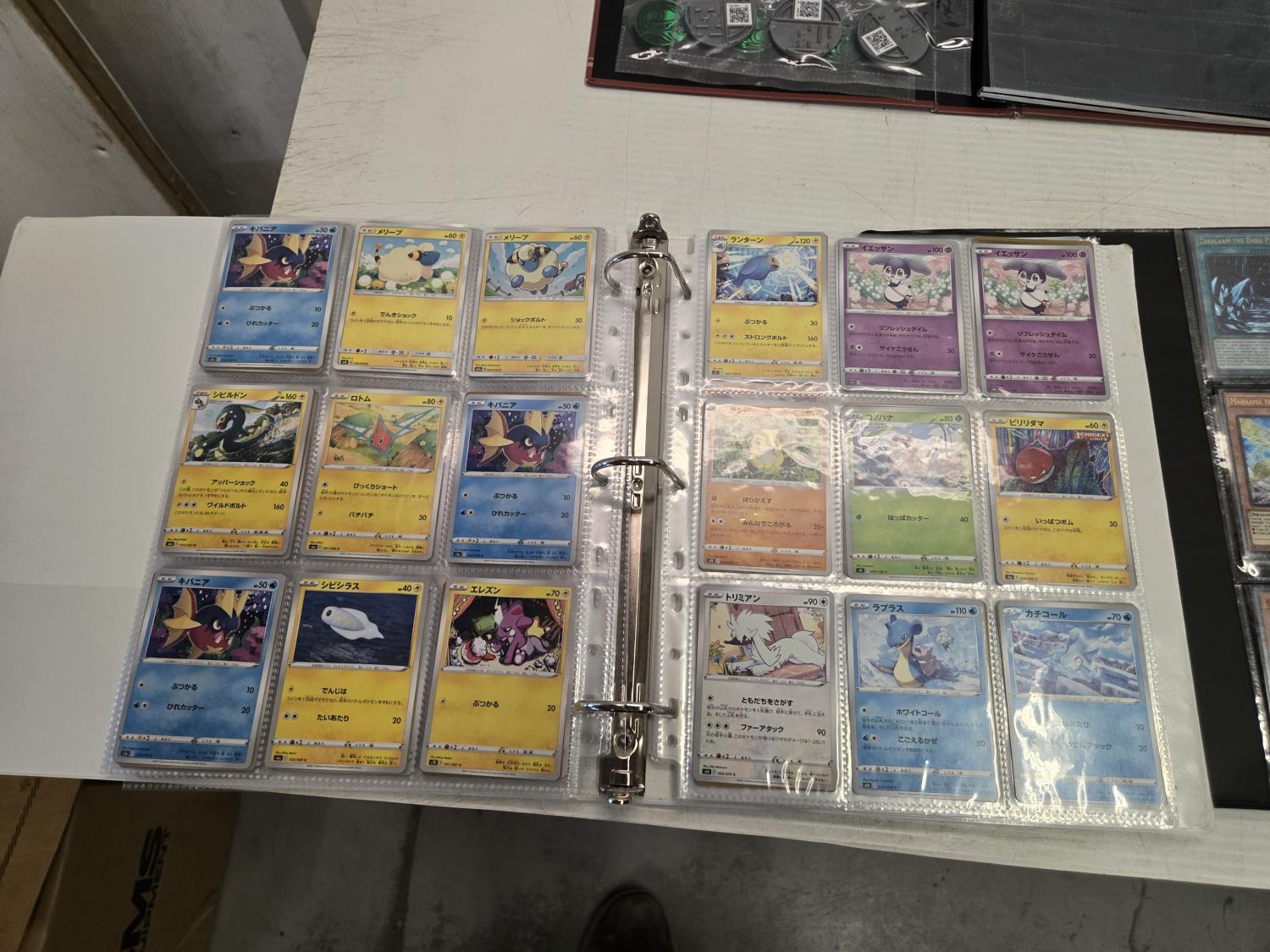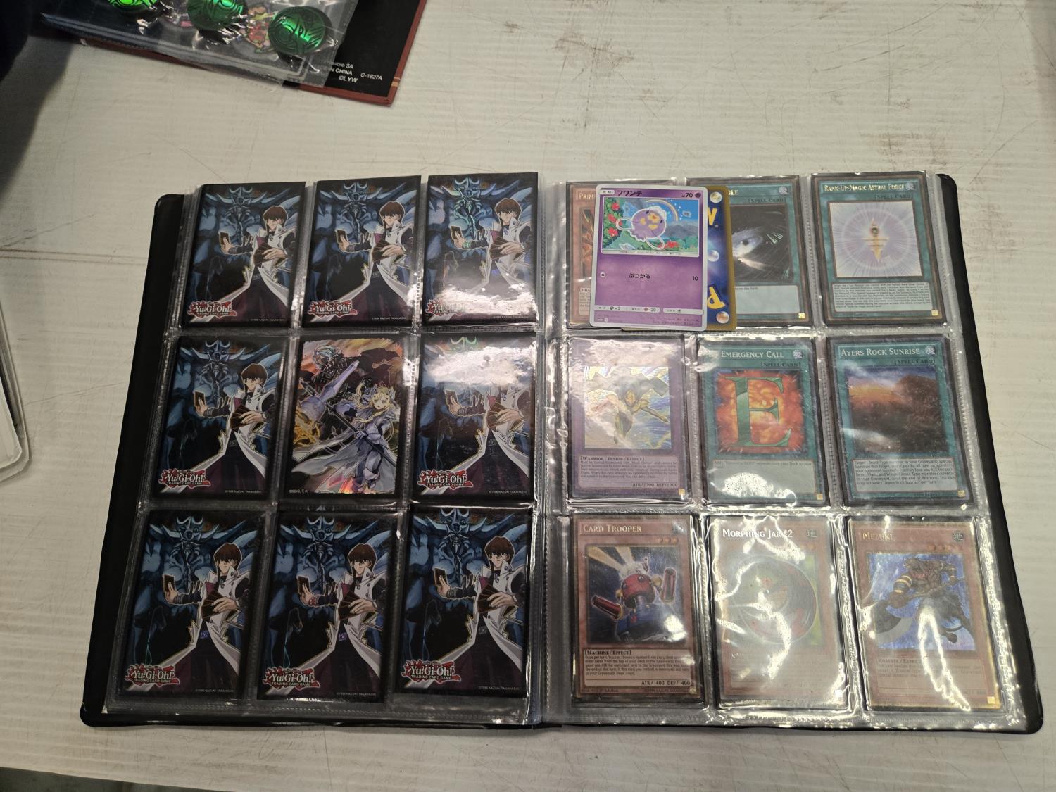 (1)binder with Pokemon cards, (1) binder with Yugi-oh cards & Yo-Kai watch medallions, tote with qty of Pez dispensers