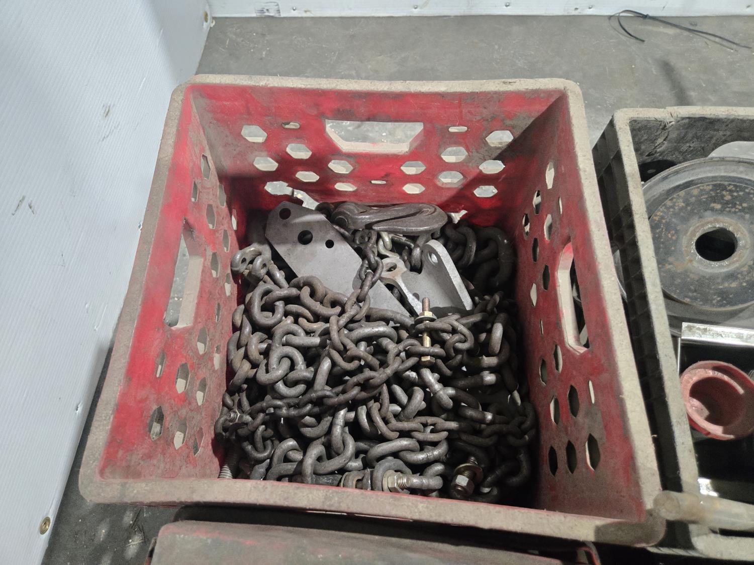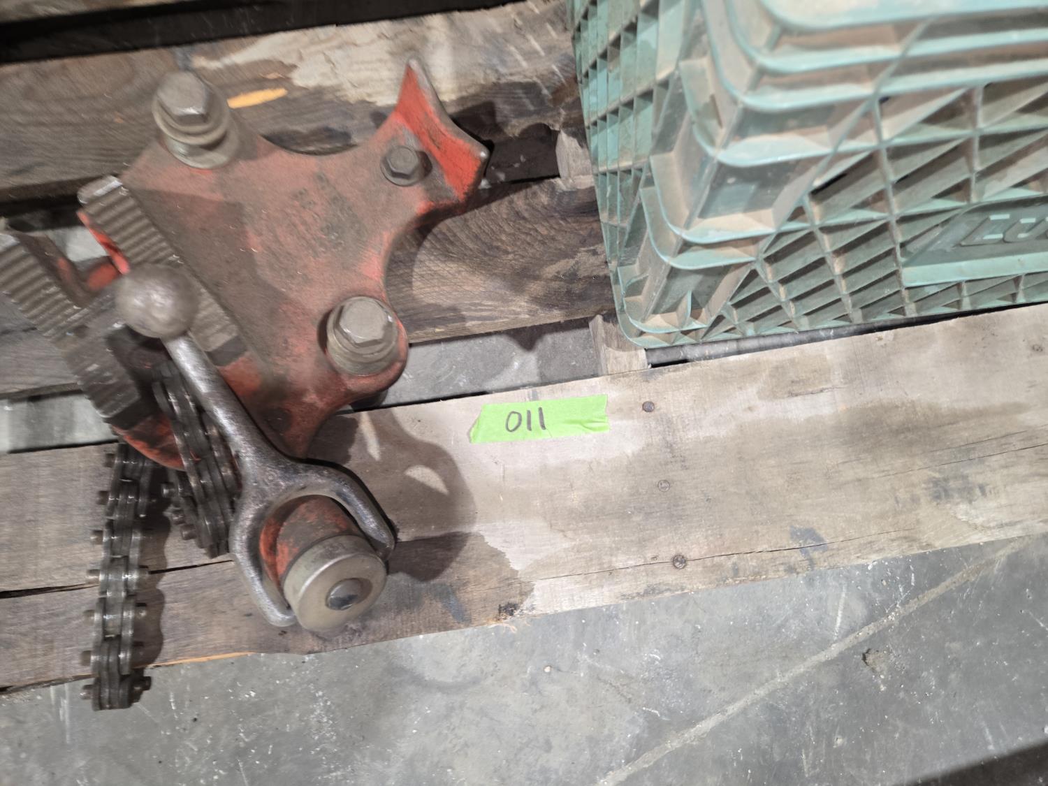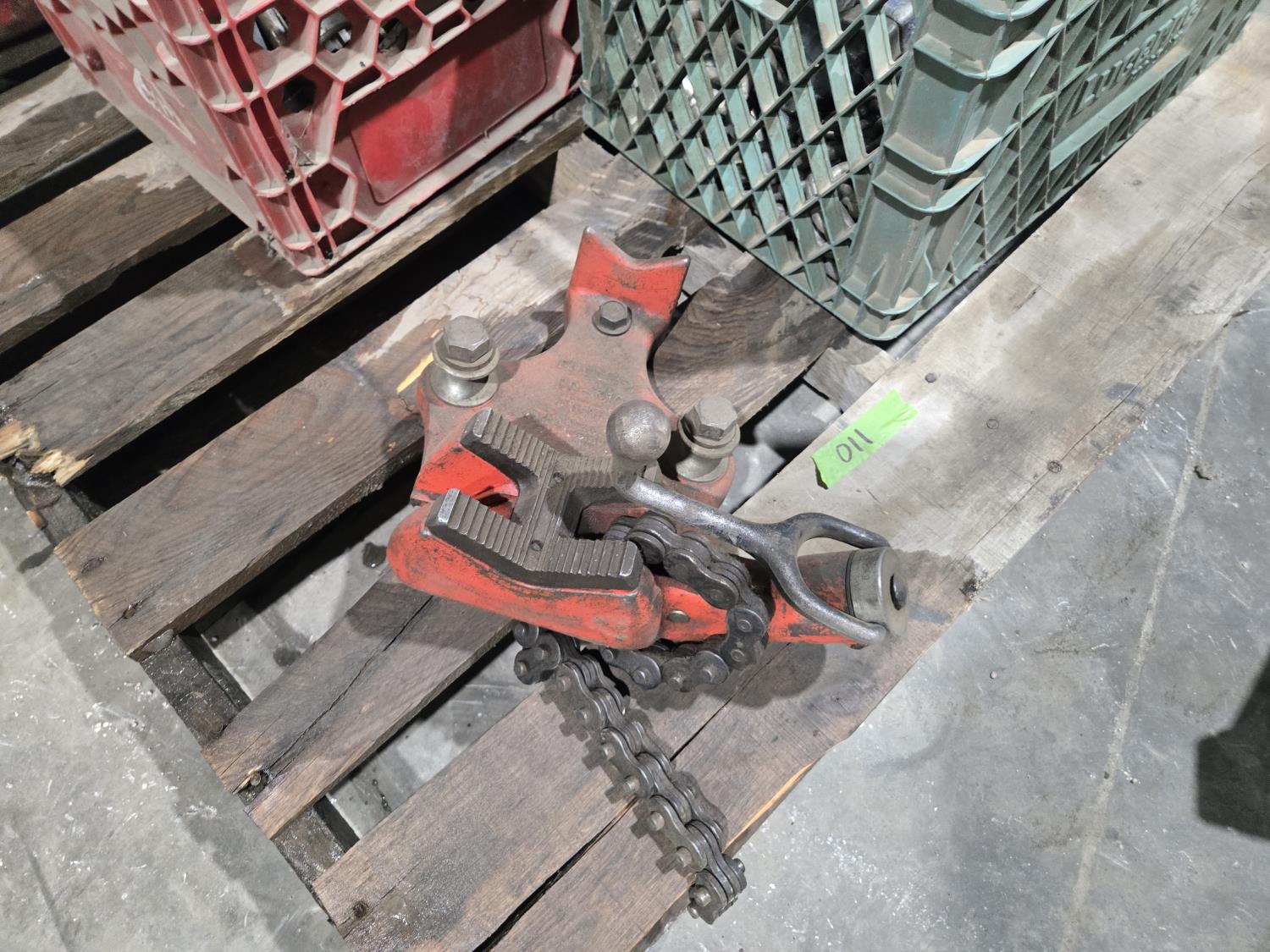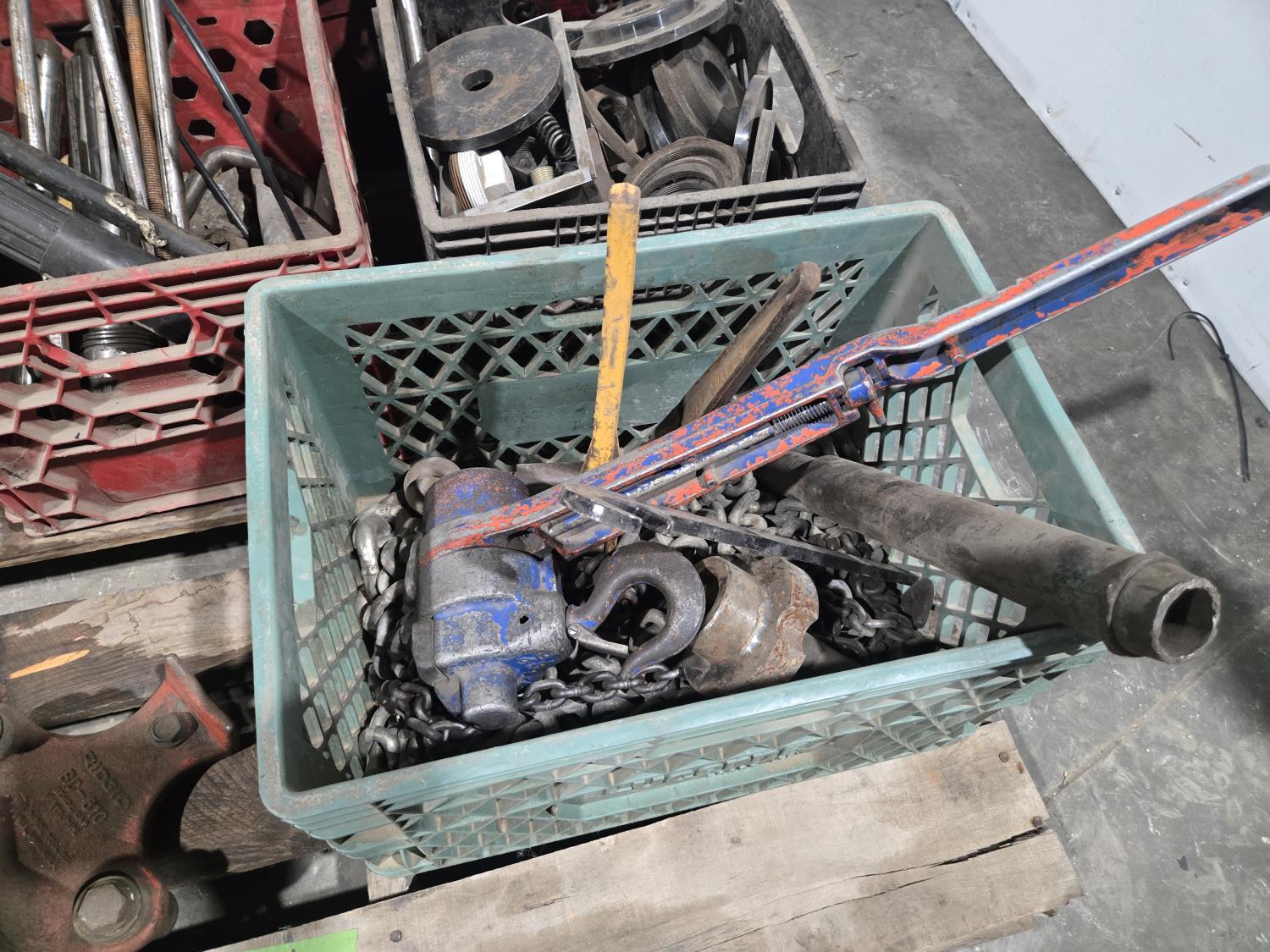 qty of lift chains, lever chain hoist, Ridgid pipe chain vise, heavy truck clutch alignment tools, seal drivers, diesel transfer pump, (2) load binders