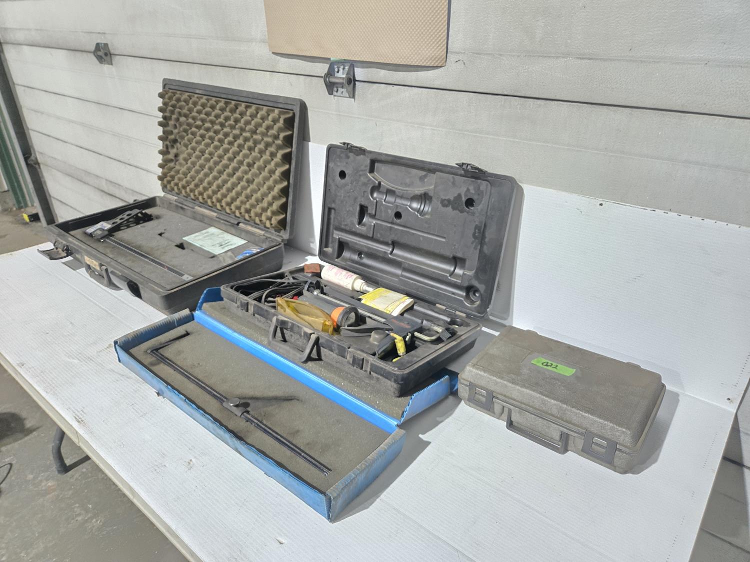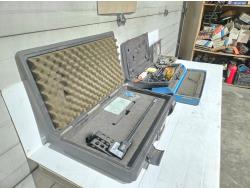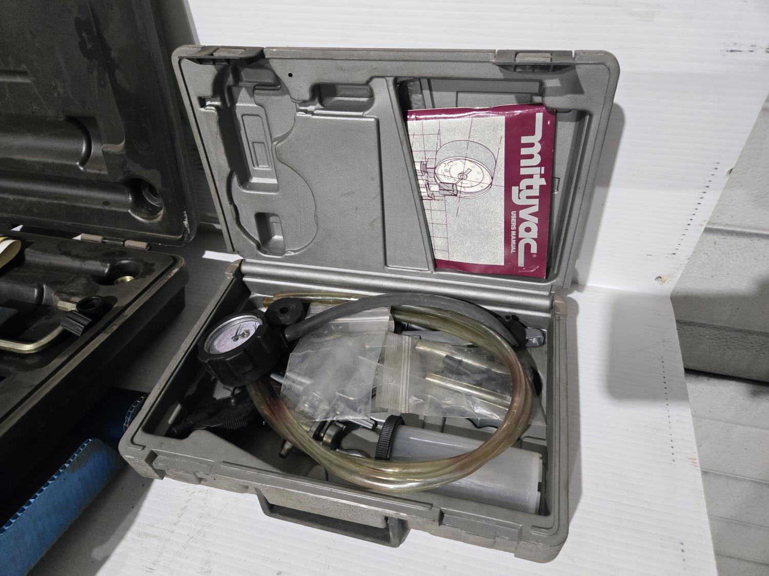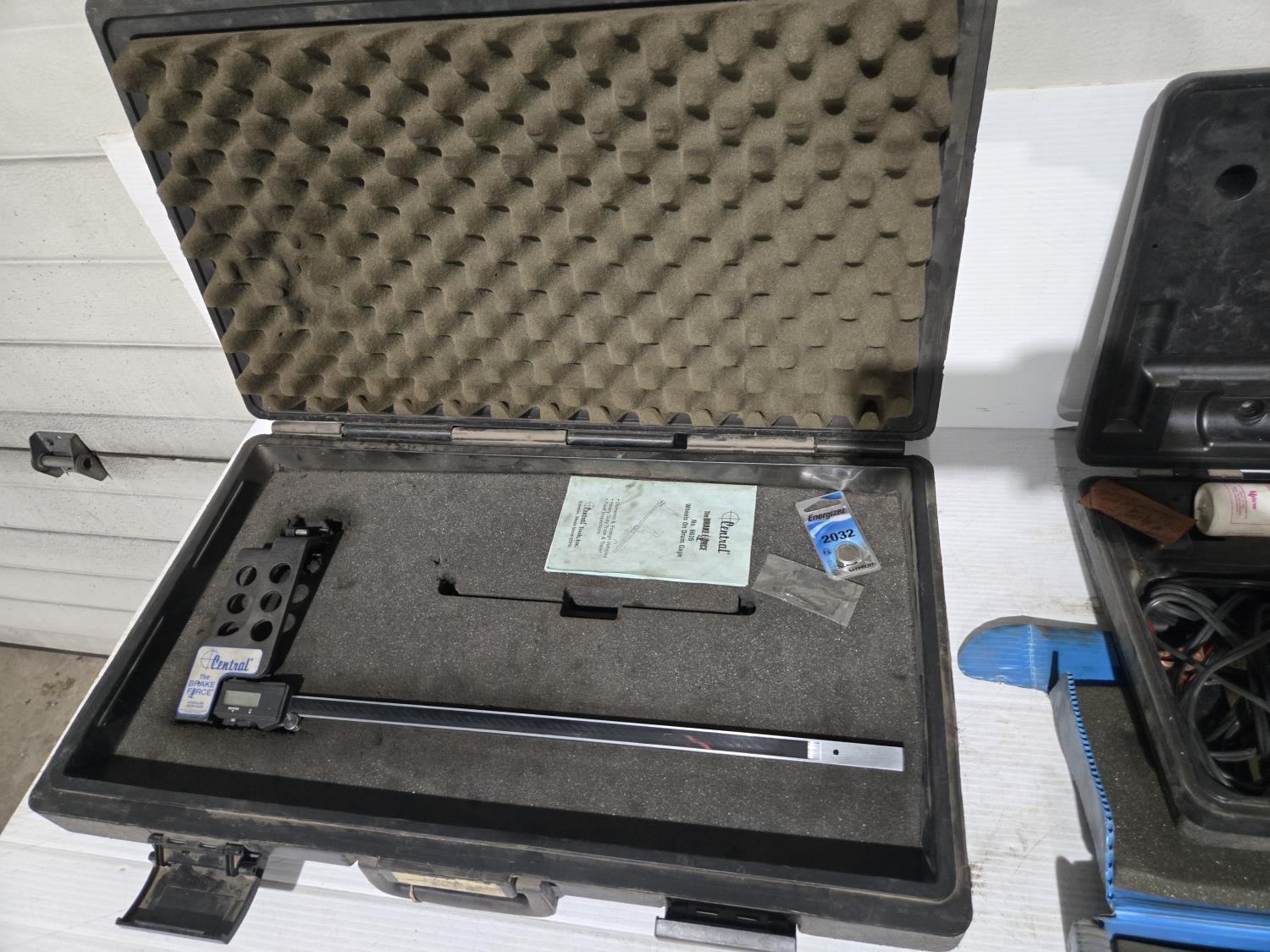 heavy truck brake drum caliper with case, brake drum measuring tool, Mityvac vacuum pump, Blue point caulking gun and flash light