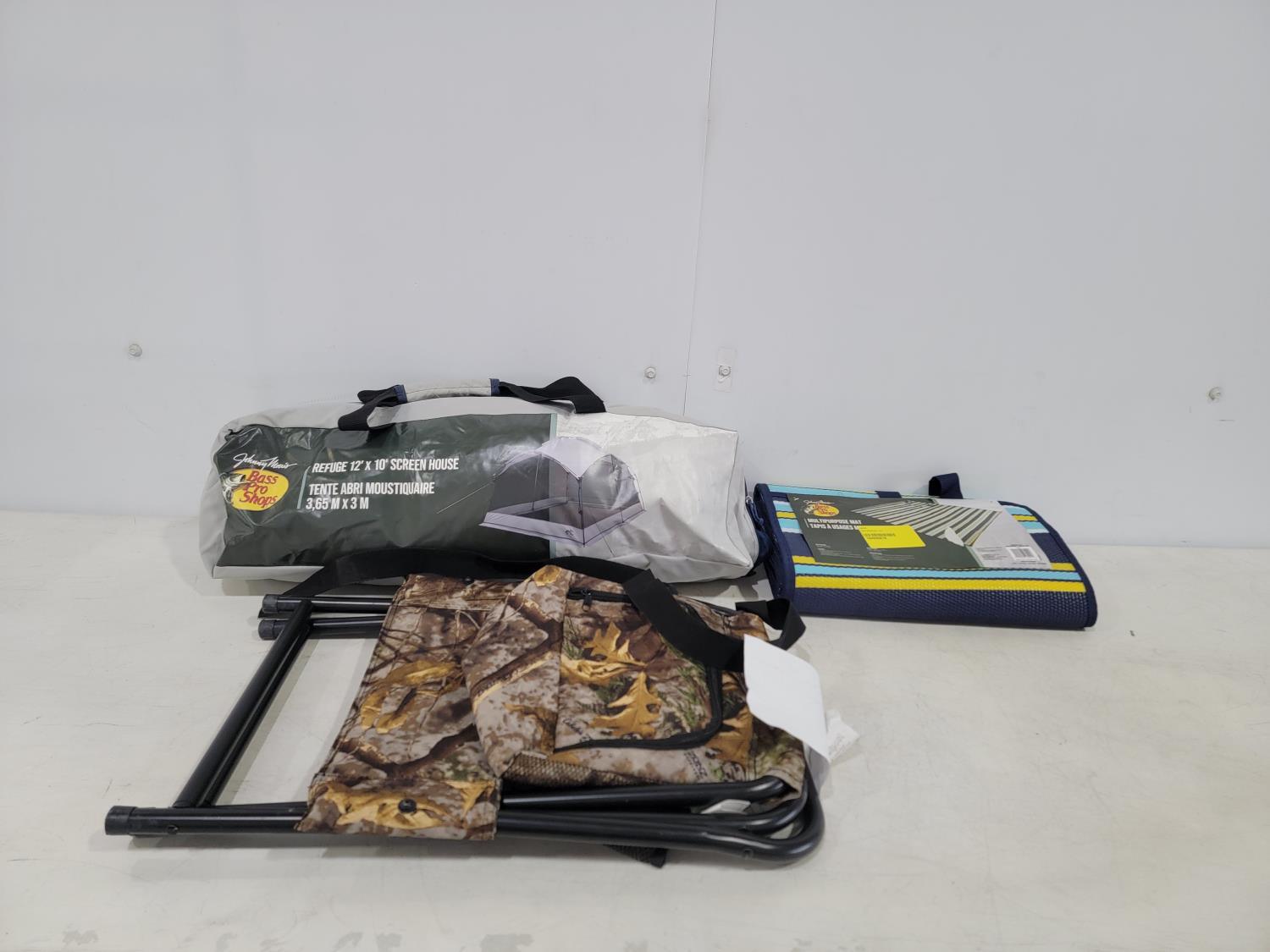 1205 Bass Pro Shops Refuge 12 Ft X 10 Ft Screen House, Multipurpose Mat and Folding Chair