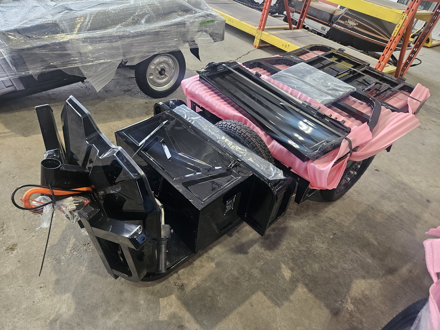 Motor Power: 800W; Battery: 60V20A large-capacity battery; Controls: Three-speed adjustable system; Display: LCD digital instrument panel; Lighting: LED headlights; Suspension: hydraulic front fork; Features: luxury double seat, cargo compartment, water cup holder; Vehicle Size: 2700 × 970 × 1325 mm; tailgate and sides drop down; brake lights, turn signals, horn, reverse. NEEDS ASSEMBLY
