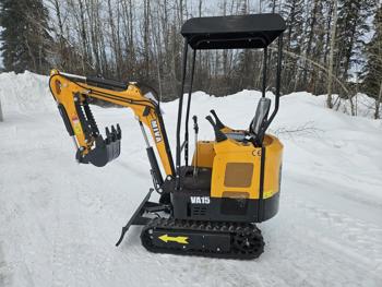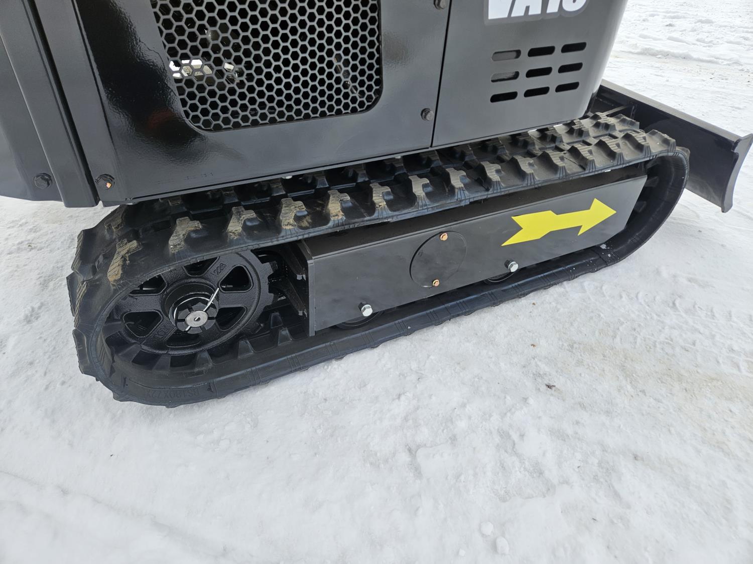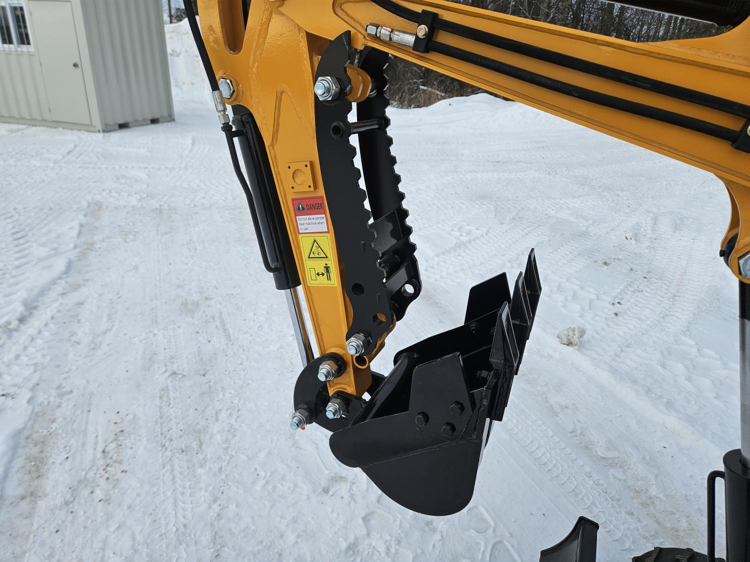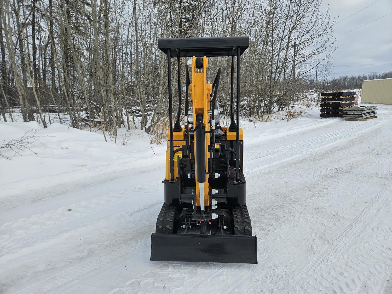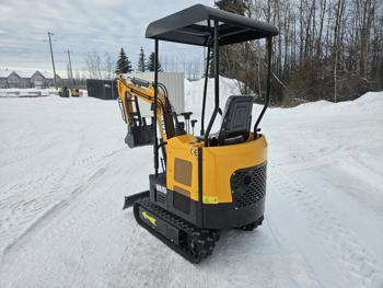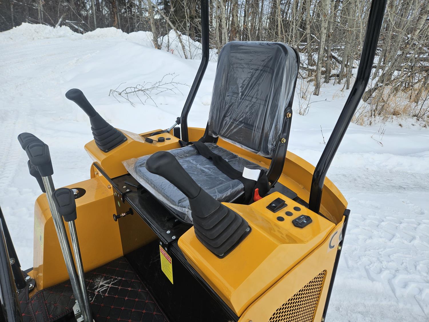 Open station, gas engine, 16 inch dig bucket, manual thumb, 2 Ft 8 inch stick, backfill blade, 7 inch rubber tracks