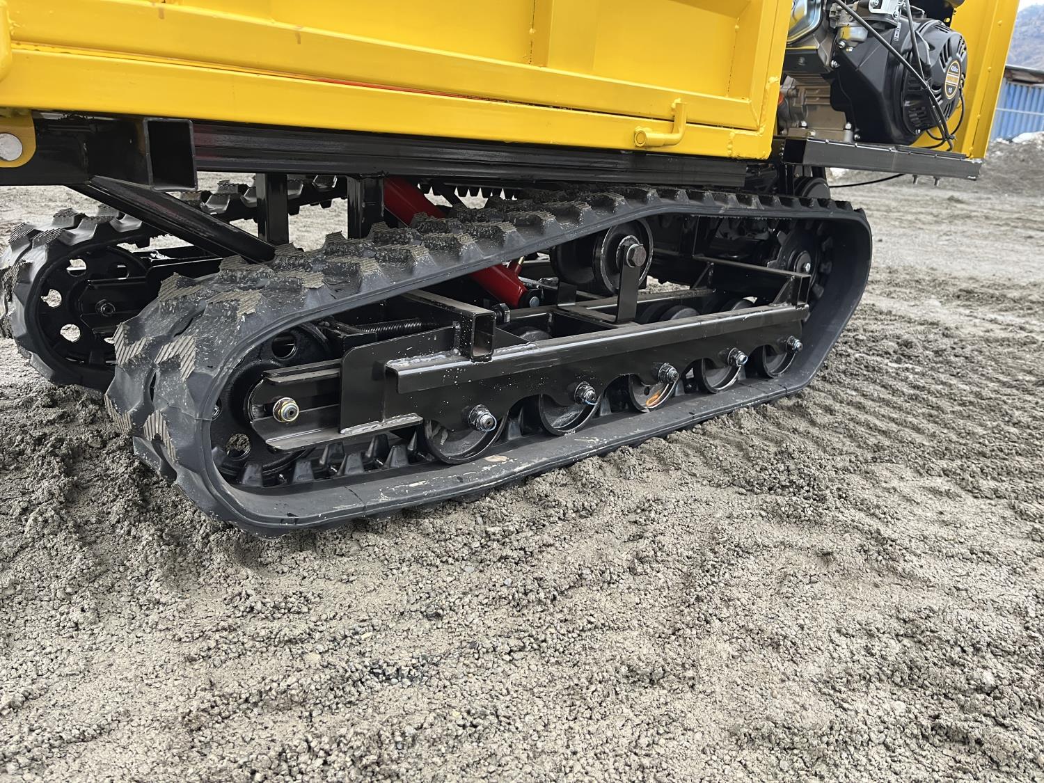 420 cc gas engine, 3 speed manual transmission w/ reverse, 48 inch x 34 inch x 18 inch box, Max load: 3,300 pounds Drive train: transmission belt pulley drive, Electric ignition. Top speed: 9.3 MPH, 9 inch rubber tracks, hydraulic dump.