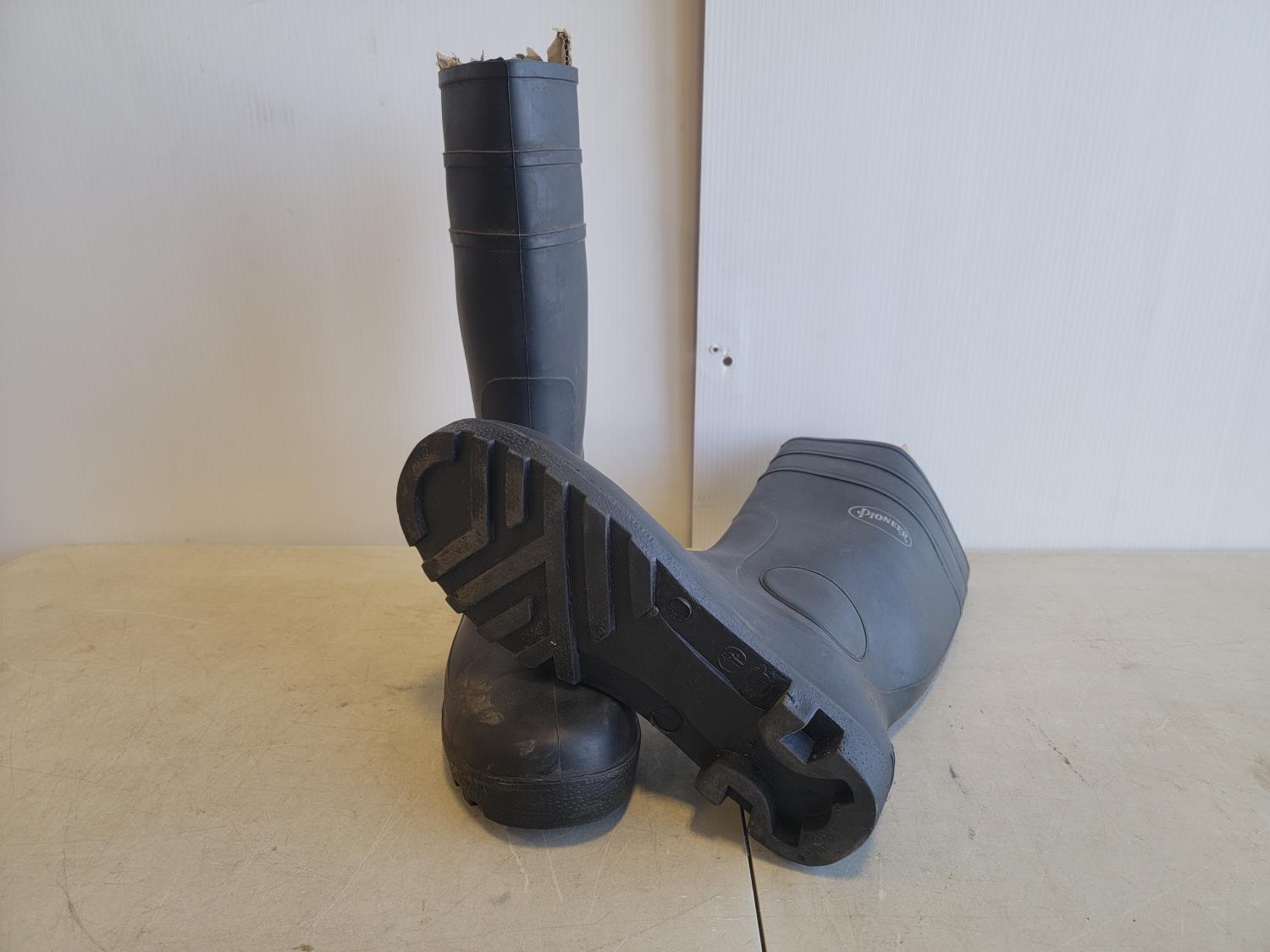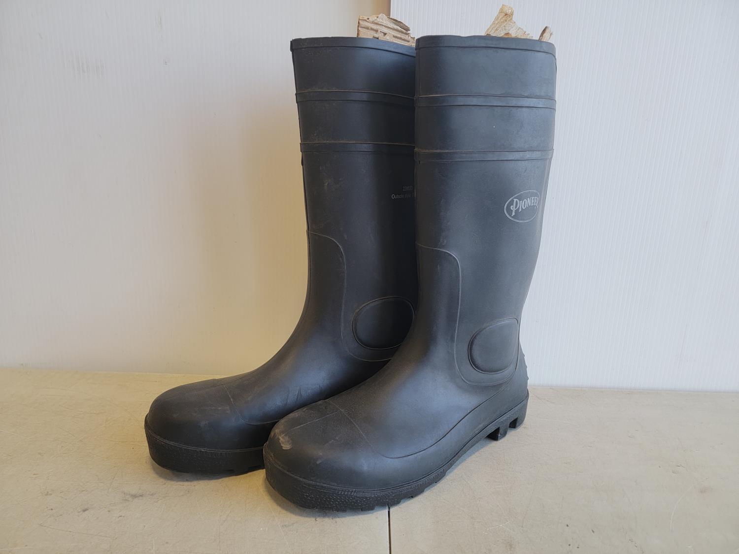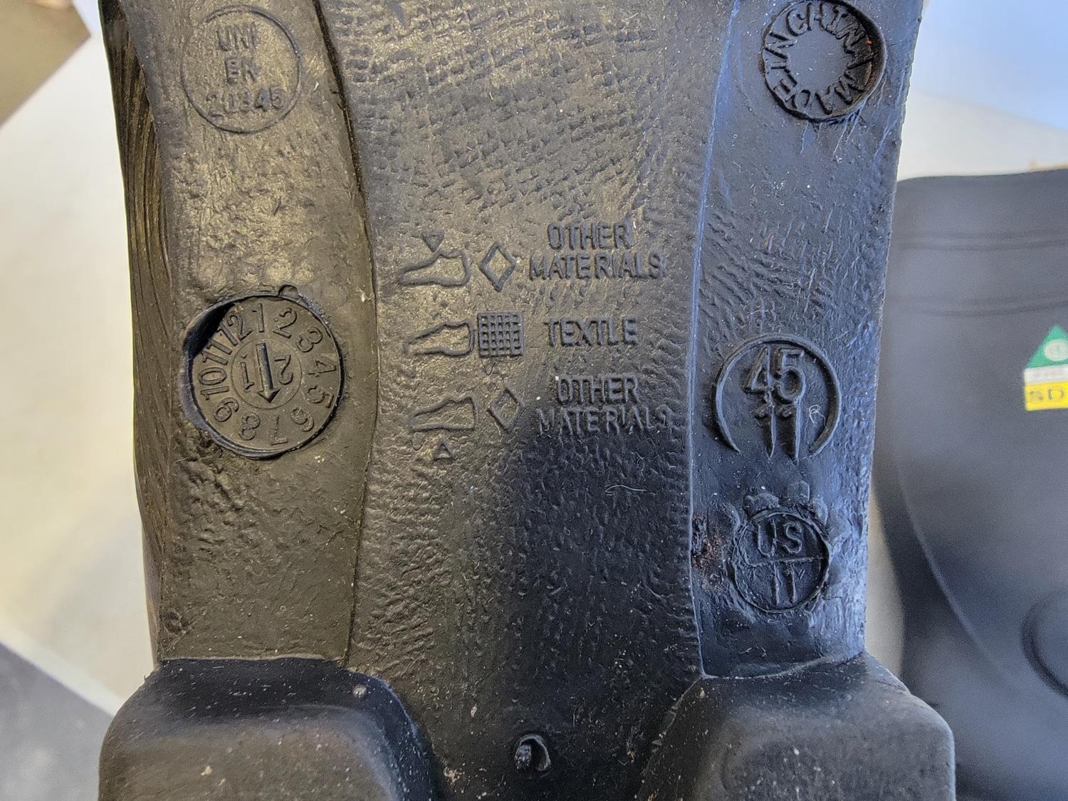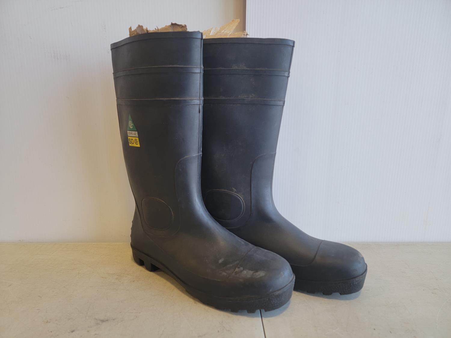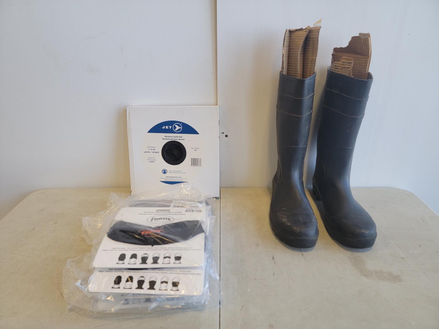 5081 (13) Neck Gaiters, 1 Inch X 50 Yard Roll of Abrasive Cloth and Size 11 Steel Toe Rubber Boots (Unused)