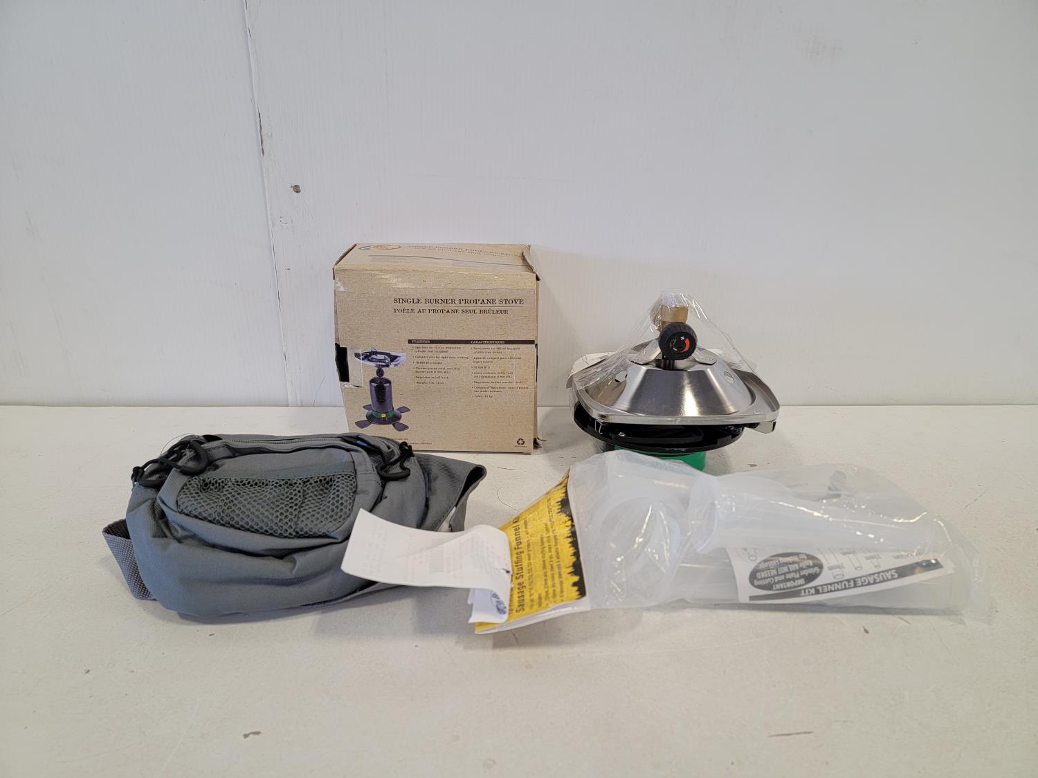 5390 (2) Single Burner Propane Stoves, Small Bag and Sausage Stuffer Funnels